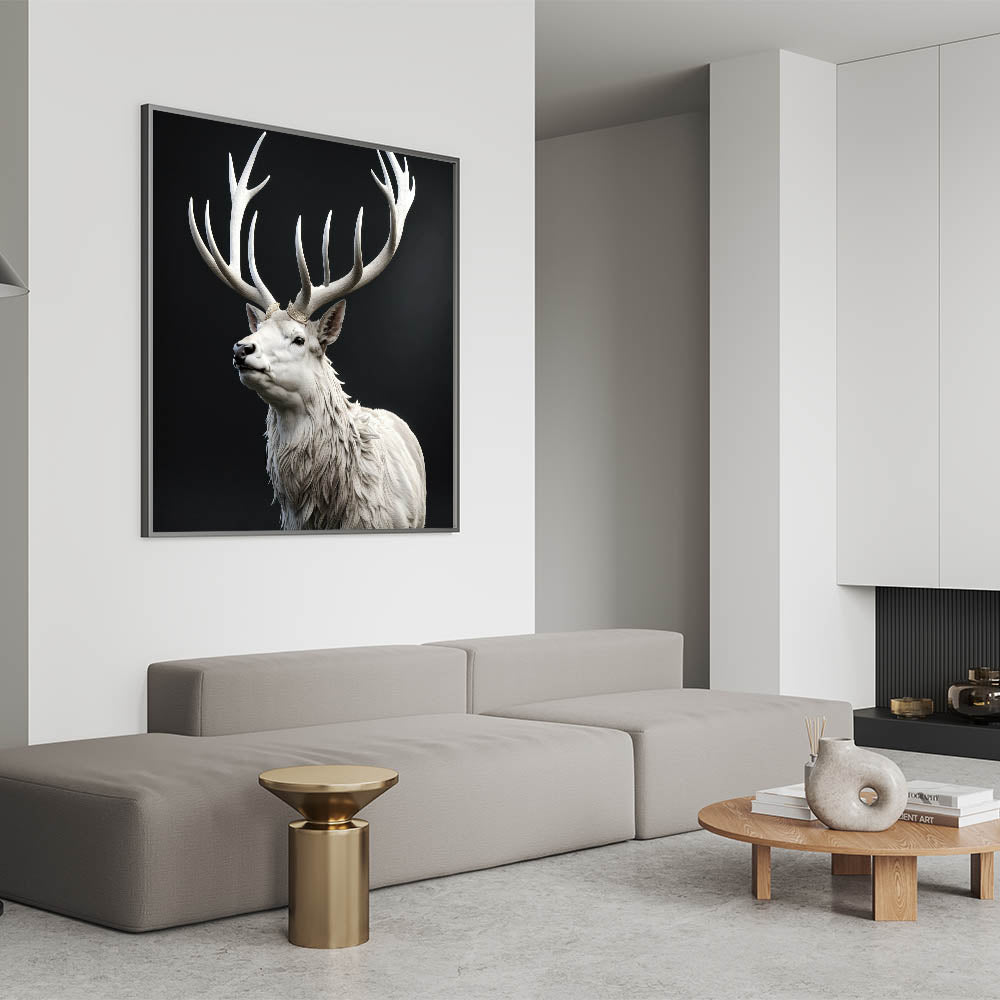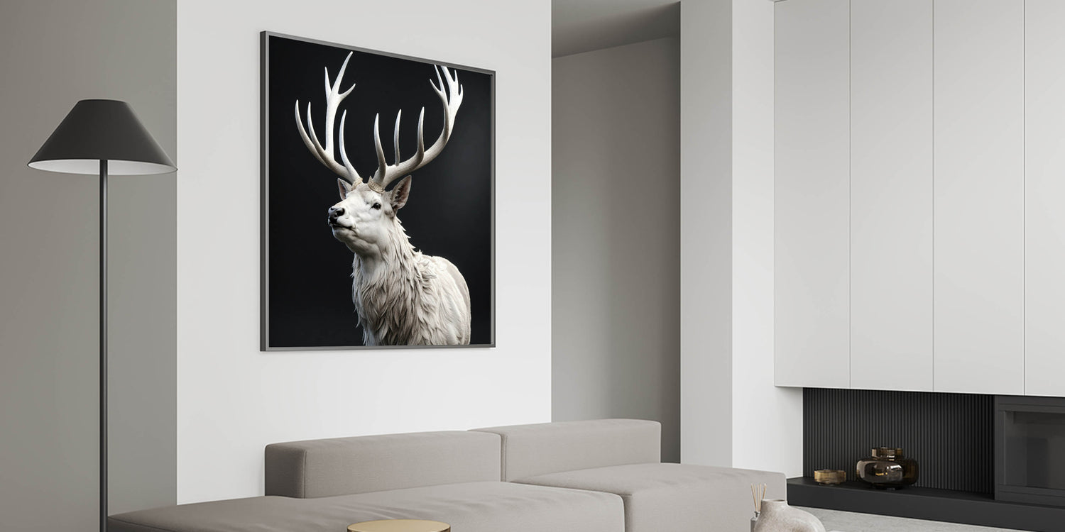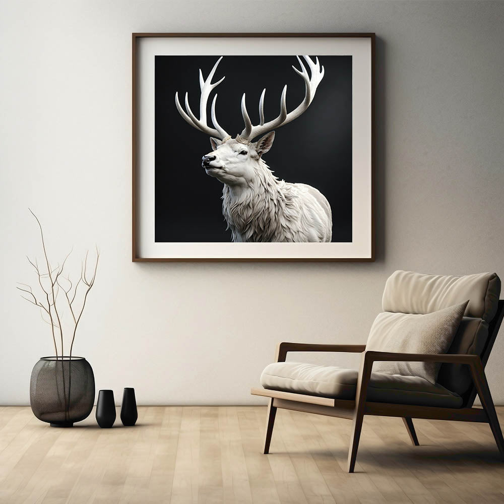 Add a touch of elegance and majesty to your home with this stunning white antelope wall art. The artwork features a striking white antelope with magnificent, intricately detailed antlers that create a regal and powerful presence. The contrast between the white antelope and the dark background enhances the beauty and grace of this majestic creature, making it a captivating focal point in any room.