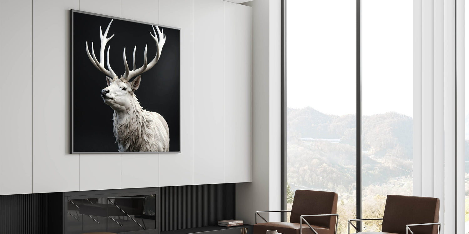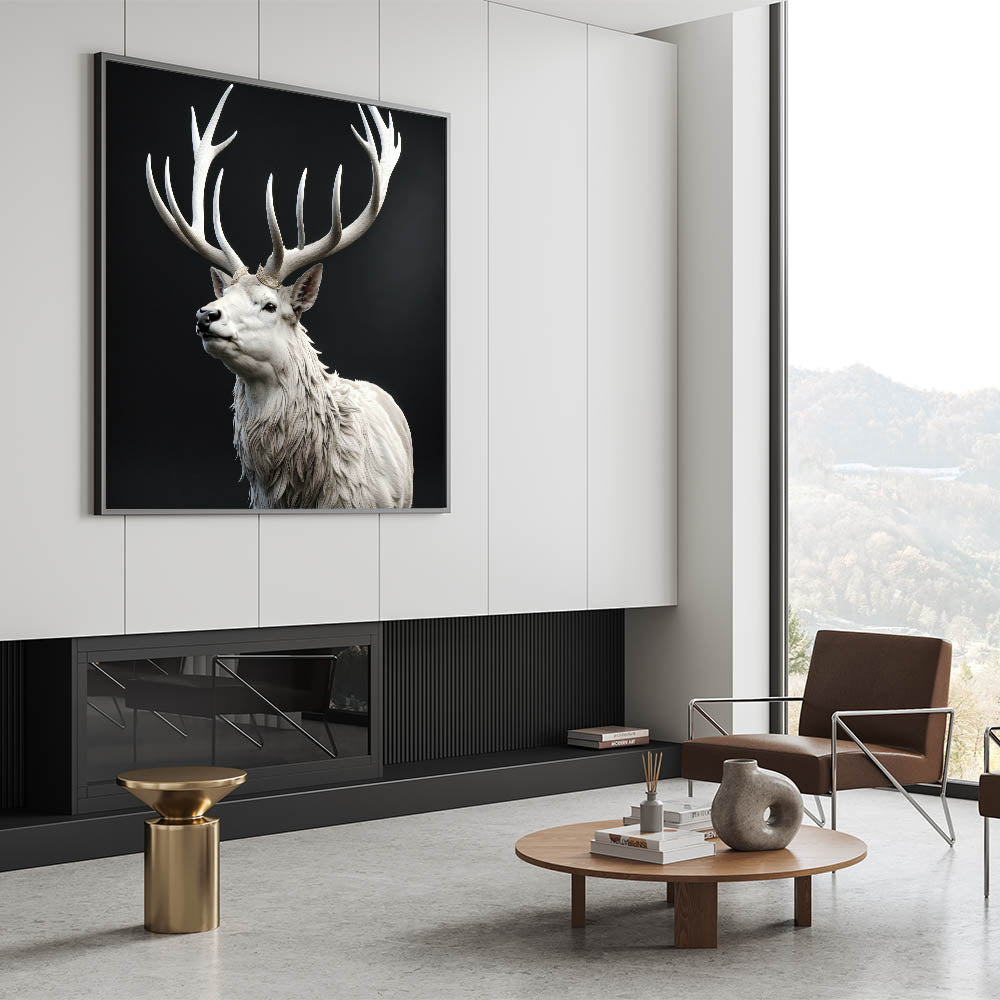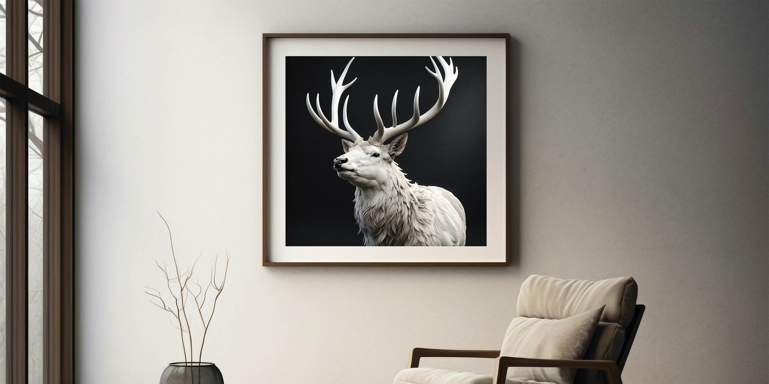 Add a touch of elegance and majesty to your home with this stunning white antelope wall art. The artwork features a striking white antelope with magnificent, intricately detailed antlers that create a regal and powerful presence. The contrast between the white antelope and the dark background enhances the beauty and grace of this majestic creature, making it a captivating focal point in any room.