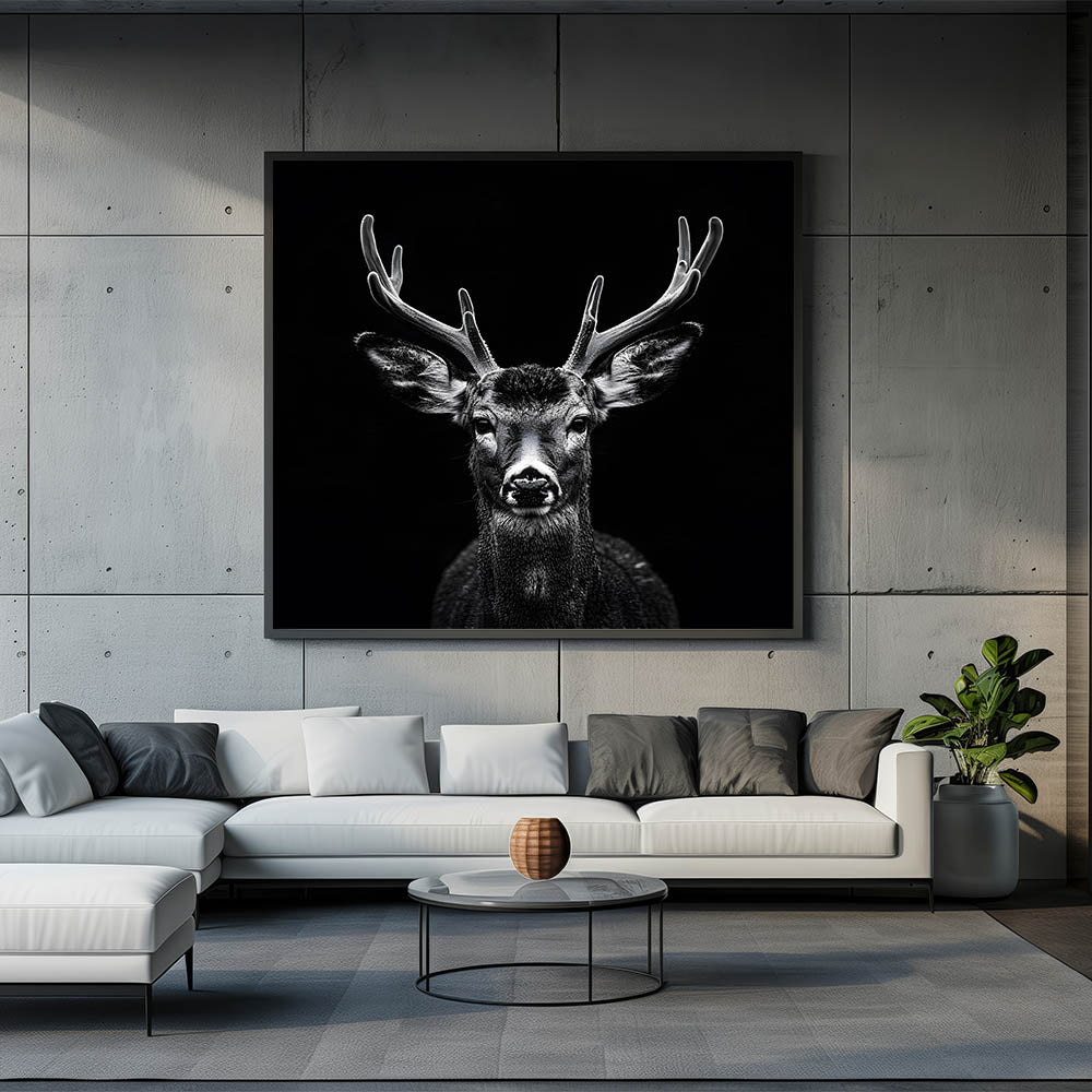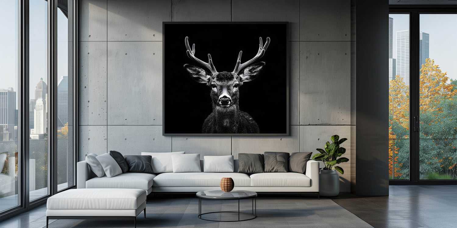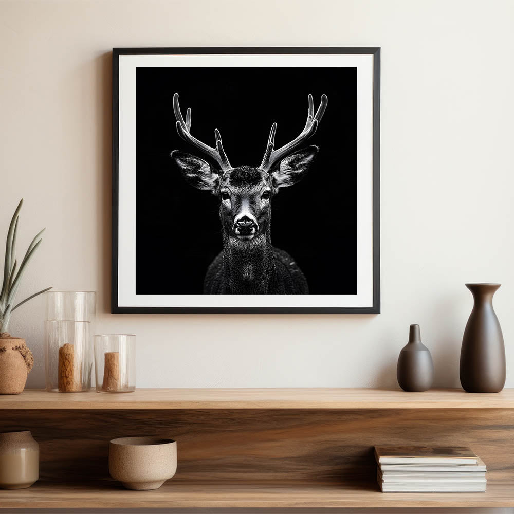 Transform your space with this Striking Black Antelope Portrait, a breathtaking representation of nature's elegance and power. This wall art piece features a meticulously detailed antelope captured in stunning black and white, with its impressive antlers and piercing gaze drawing you into the heart of the wild. The dark background contrasts beautifully with the antelope’s features, creating a bold and impactful artwork perfect for modern interiors.