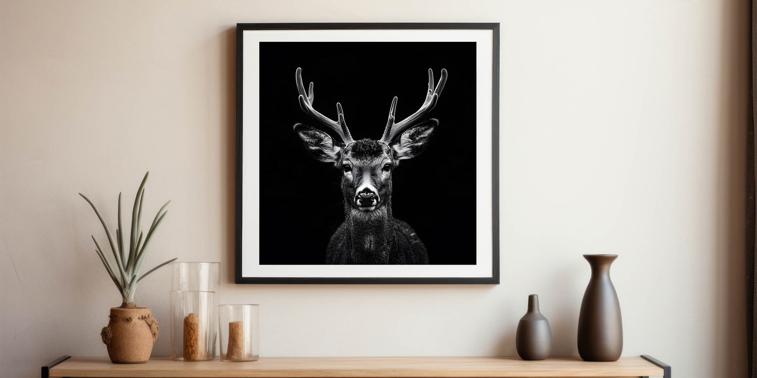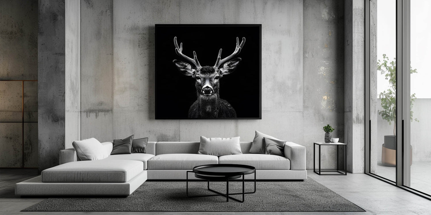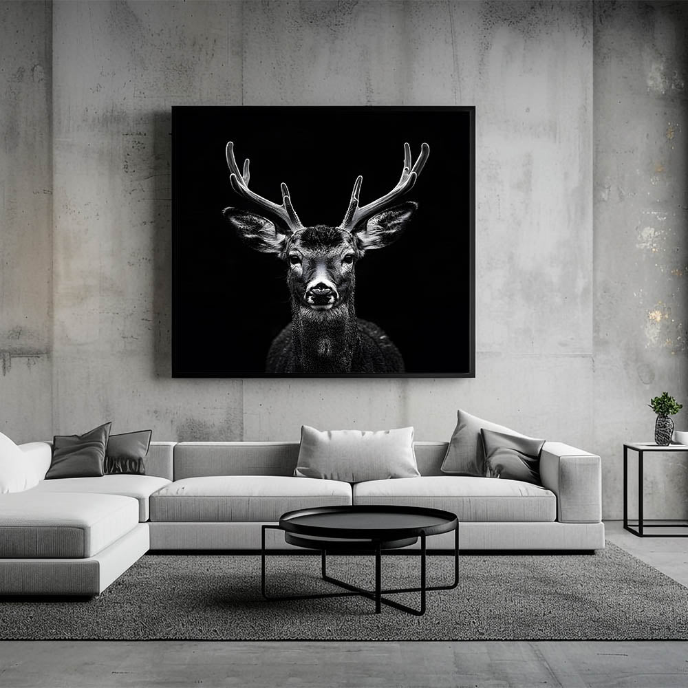 Transform your space with this Striking Black Antelope Portrait, a breathtaking representation of nature's elegance and power. This wall art piece features a meticulously detailed antelope captured in stunning black and white, with its impressive antlers and piercing gaze drawing you into the heart of the wild. The dark background contrasts beautifully with the antelope’s features, creating a bold and impactful artwork perfect for modern interiors.