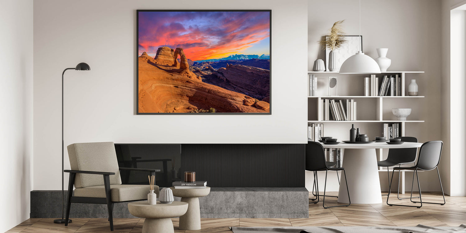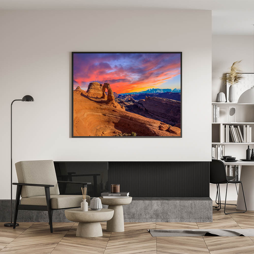 Add a touch of the Southwest to your space with this breathtaking wall art, featuring Delicate Arch at sunset in Arches National Park. The vibrant colors of the sunset, with rich oranges, purples, and pinks, beautifully contrast with the red rock formations, creating a stunning visual experience. This piece is perfect for those who love Southwestern Landscape Art and want to bring the beauty of Utah’s iconic scenery into their home or office.