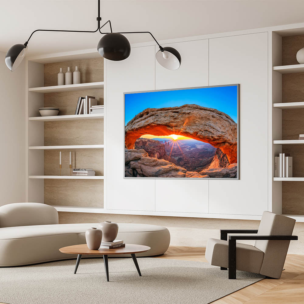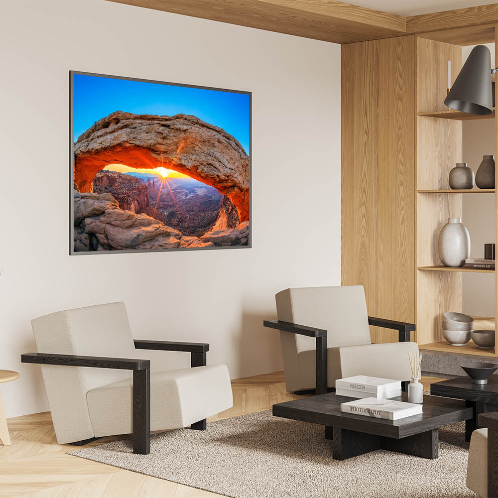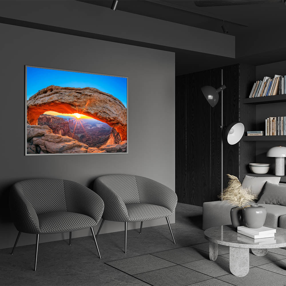 Capture the radiant beauty of Utah's Arches National Park with this breathtaking wall art featuring a stunning sunrise over the Mesa Arch. The vivid orange glow of the sunrise contrasts with the calming blues of the sky, creating a visually stunning piece that brings the natural beauty of Utah’s landscapes into your home. The iconic rock formations and vast desert backdrop make this artwork an eye-catching addition to any room, perfect for lovers of Moab Landscape Art and nature photography.