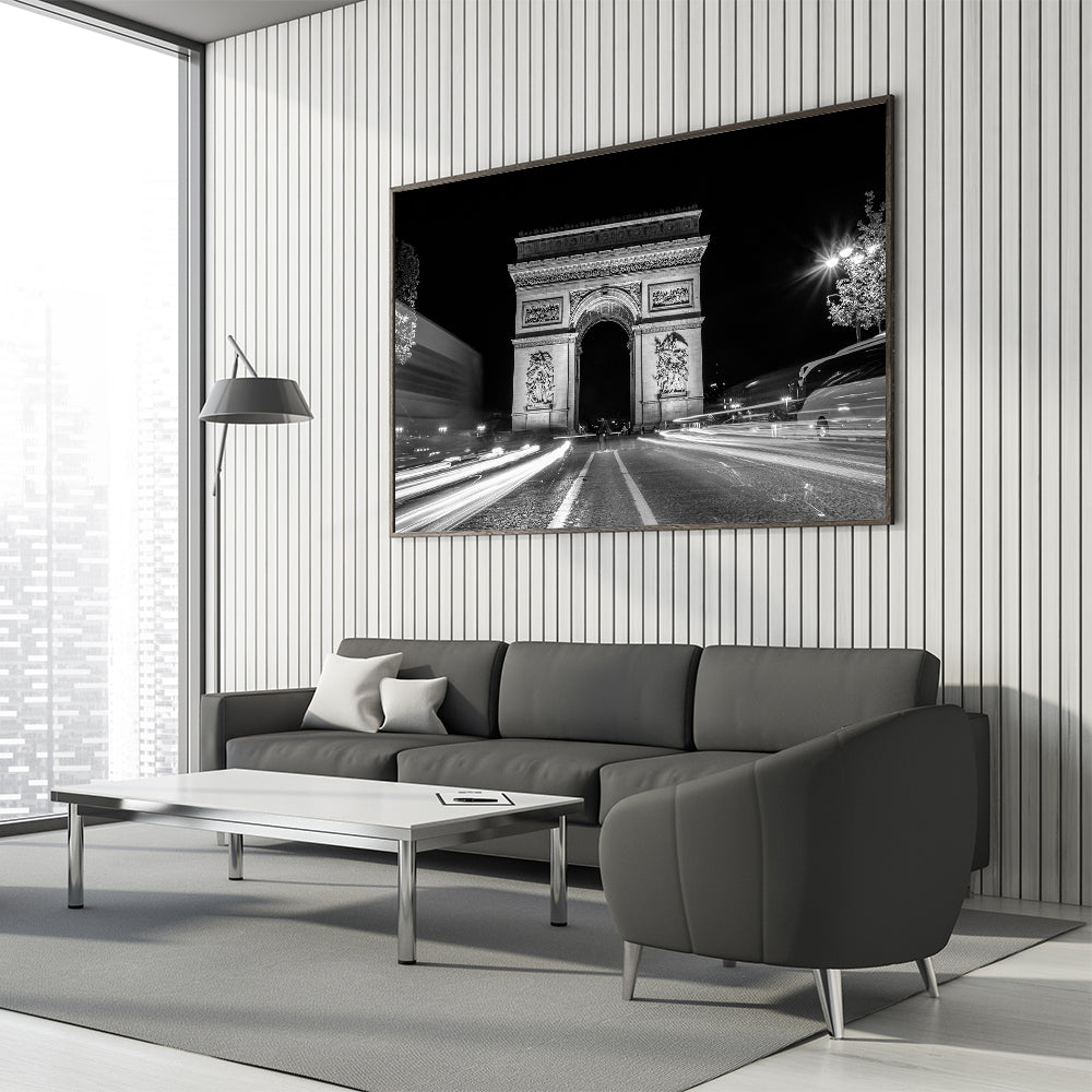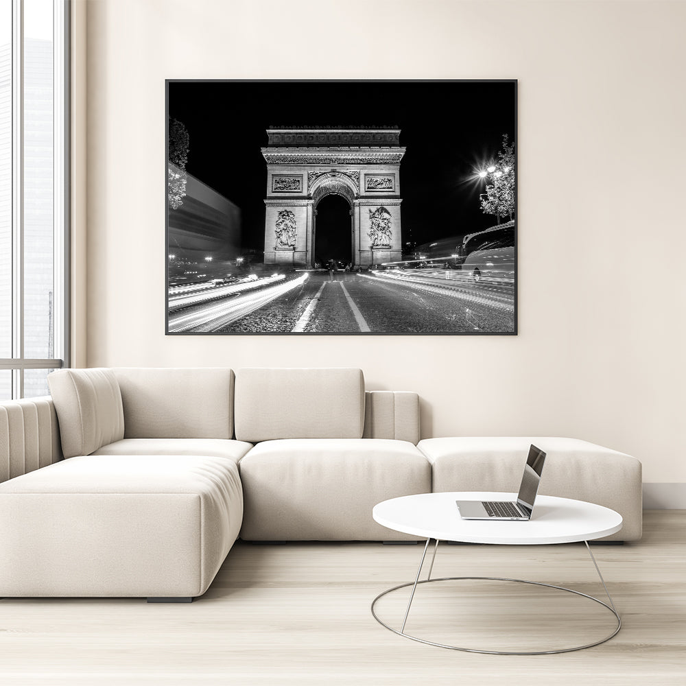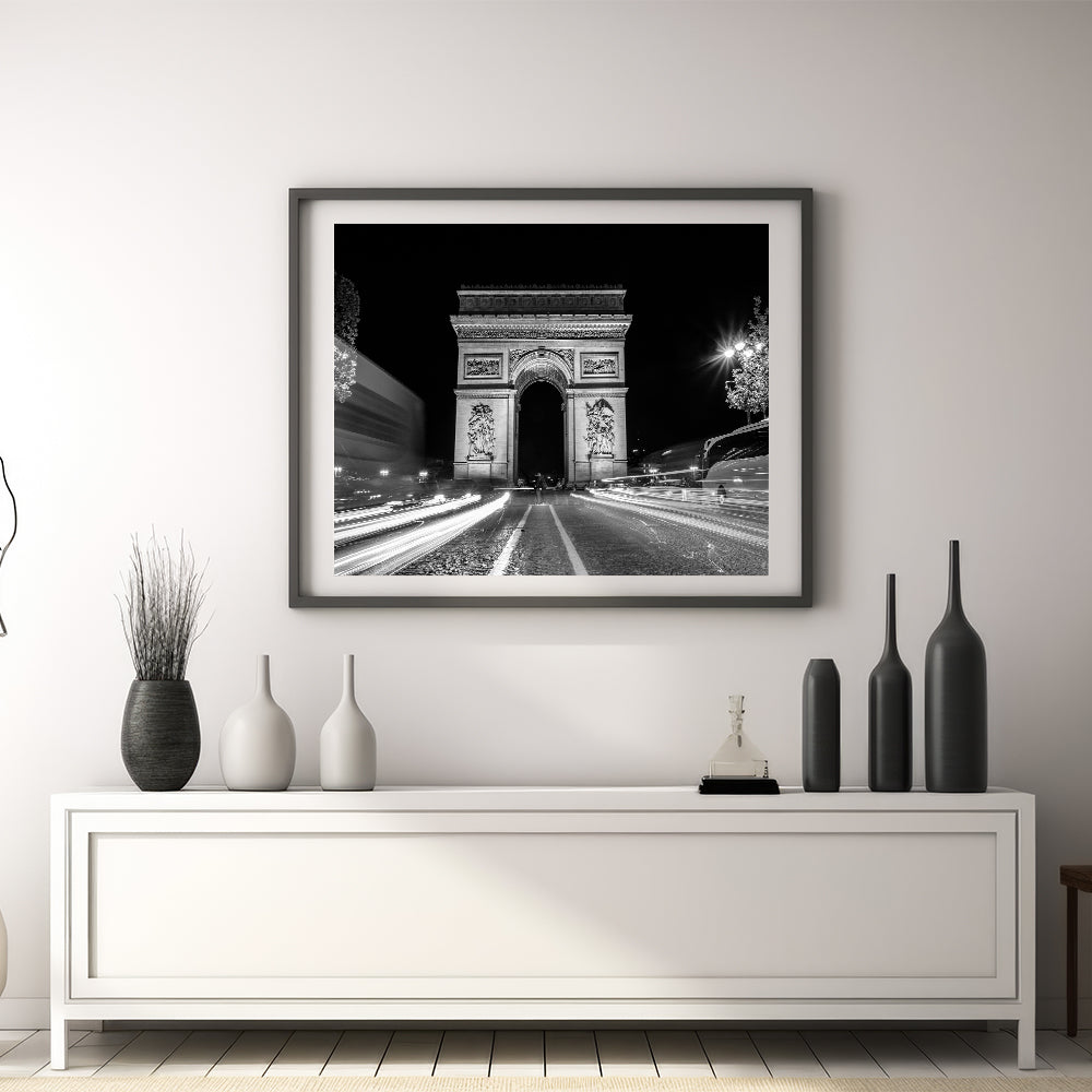 Capture the iconic beauty of Paris with this stunning black-and-white wall art featuring the majestic Arc de Triomphe at night. The dramatic contrast between the illuminated arch and the dark night sky creates a powerful image, while the streaks of light from passing cars add a dynamic sense of motion and energy. This artwork is perfect for those who appreciate classic architecture and want to bring a touch of Parisian elegance into their home.