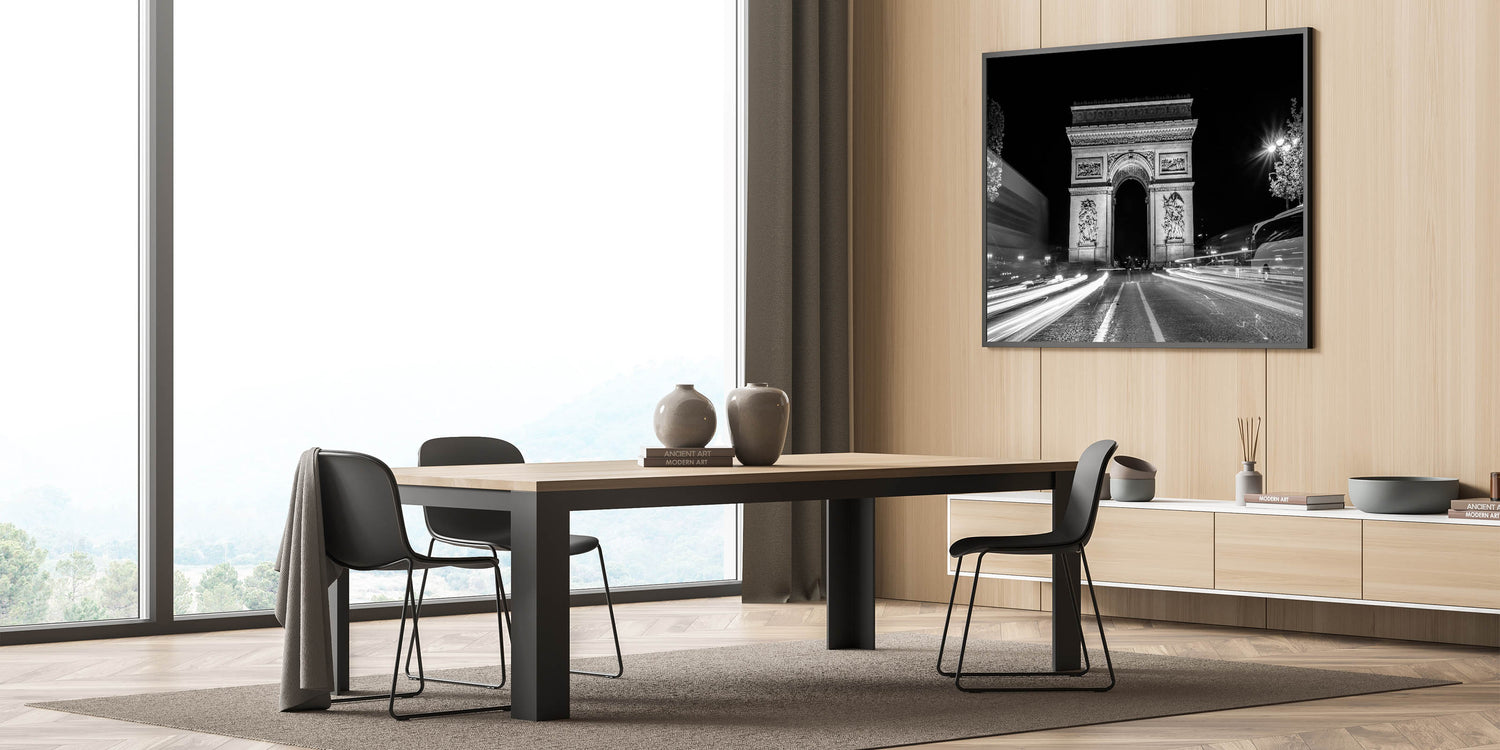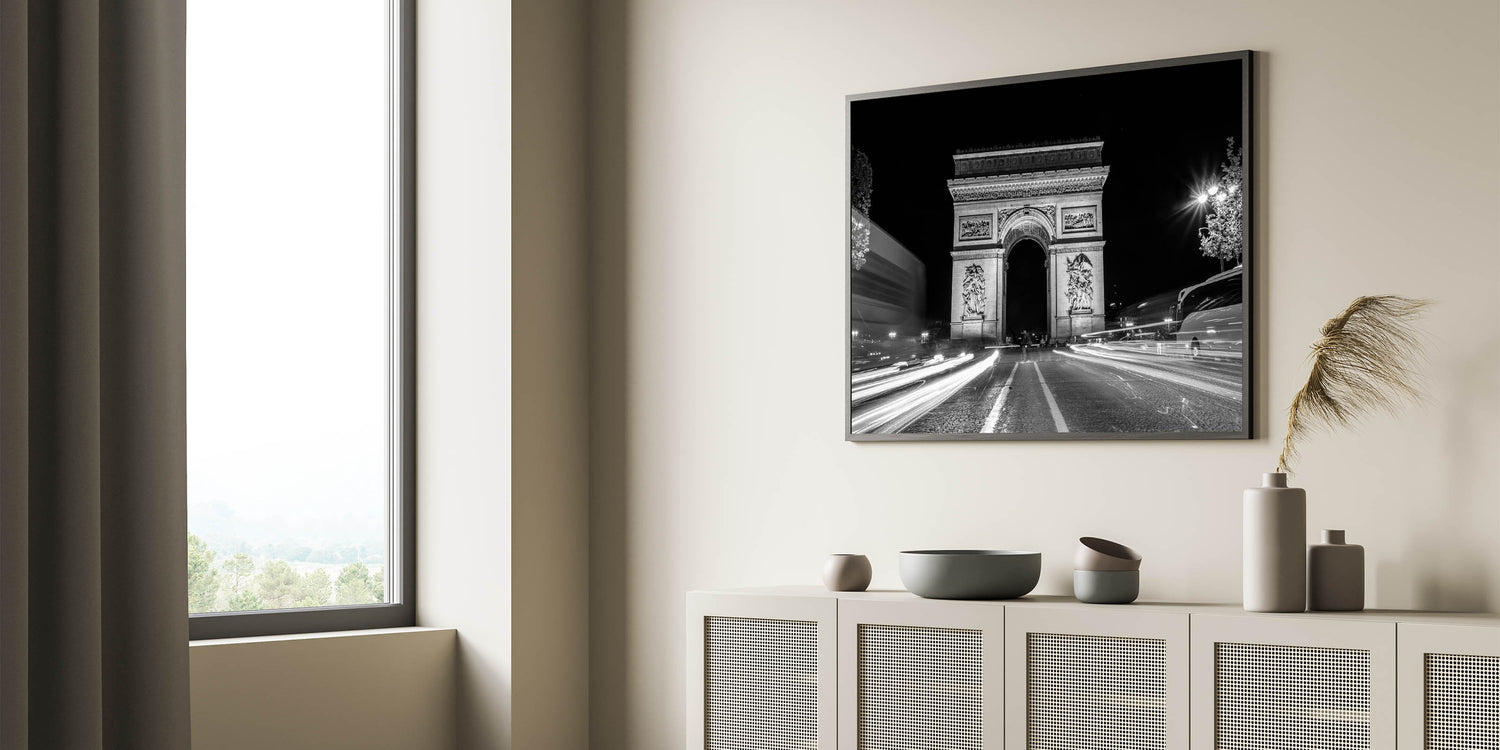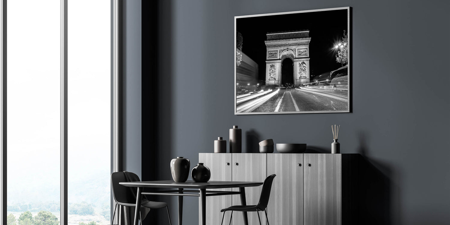 Capture the iconic beauty of Paris with this stunning black-and-white wall art featuring the majestic Arc de Triomphe at night. The dramatic contrast between the illuminated arch and the dark night sky creates a powerful image, while the streaks of light from passing cars add a dynamic sense of motion and energy. This artwork is perfect for those who appreciate classic architecture and want to bring a touch of Parisian elegance into their home.