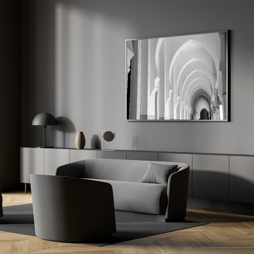 Transform your space with this refined piece that celebrates the beauty of simplicity and form in architecture. Whether you prefer the classic appeal of a framed print or the modern feel of acrylic glass, this artwork will enhance any decor with its understated elegance. Let the graceful arches inspire a sense of calm and clarity in your home.