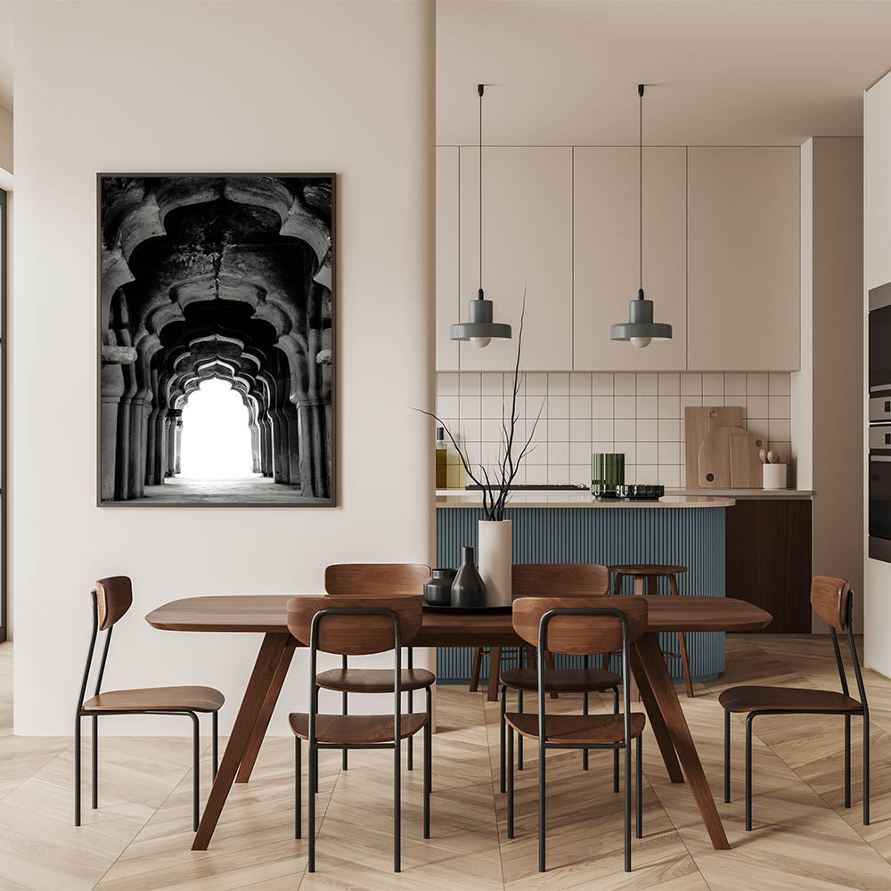 Step into the grandeur of Mughal architecture with this exquisite wall art featuring intricately carved arches. The design captures the essence of historic opulence, blending bold shadows with elegant curves to create a mesmerizing visual effect. This piece is perfect for those who appreciate the beauty of ancient craftsmanship and wish to bring a touch of historic elegance into their living space.