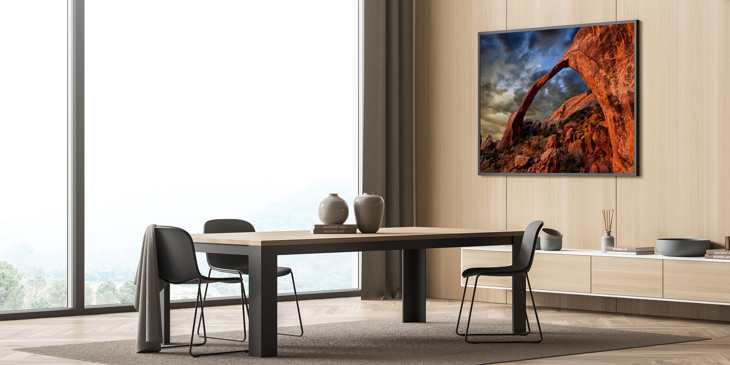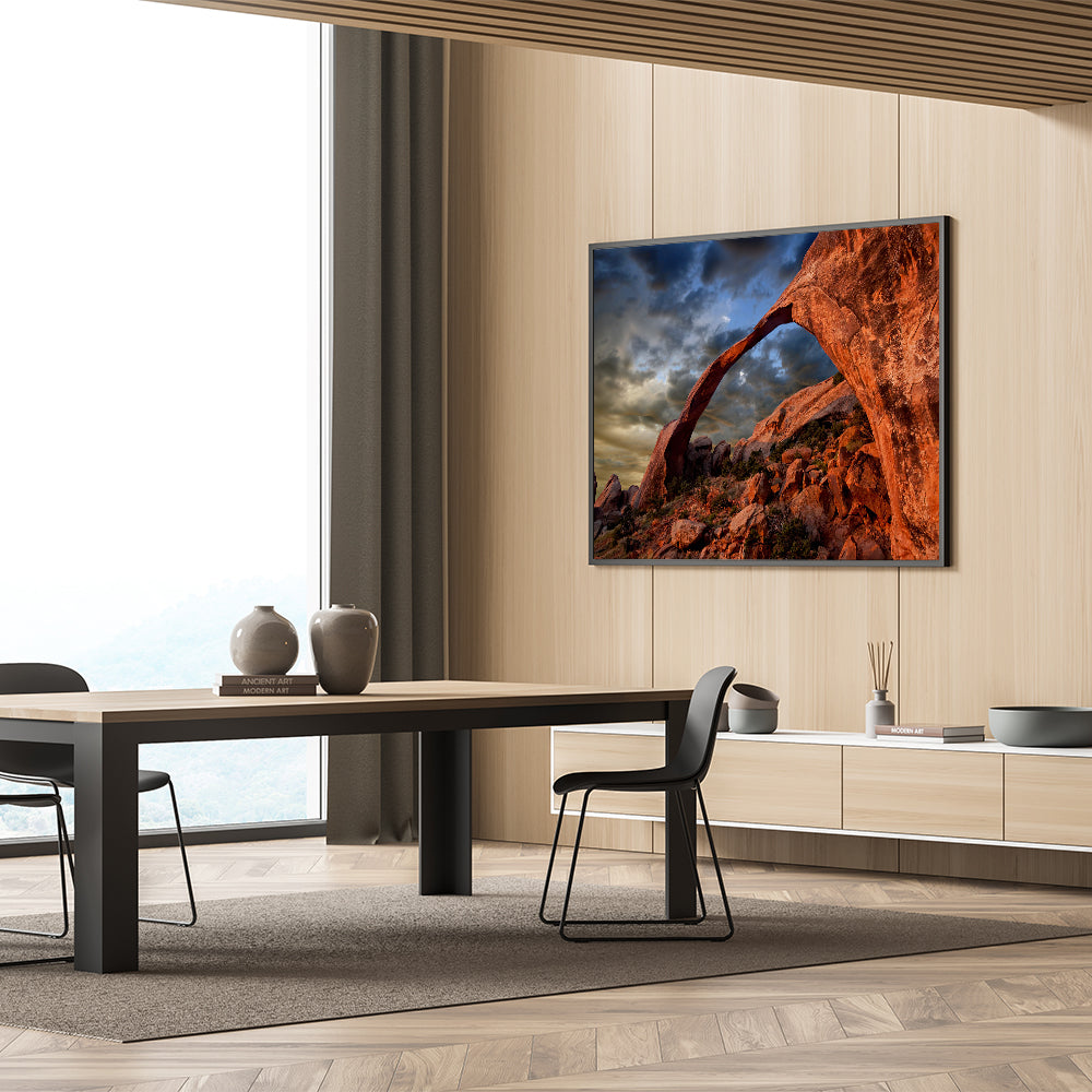 Transform your space with this powerful piece that celebrates the majestic landscapes of the desert. Whether displayed as a canvas print or in a sleek acrylic glass frame, this artwork is designed to impress and inspire. Let the beauty of the red rock arch add a bold, natural element to your decor.