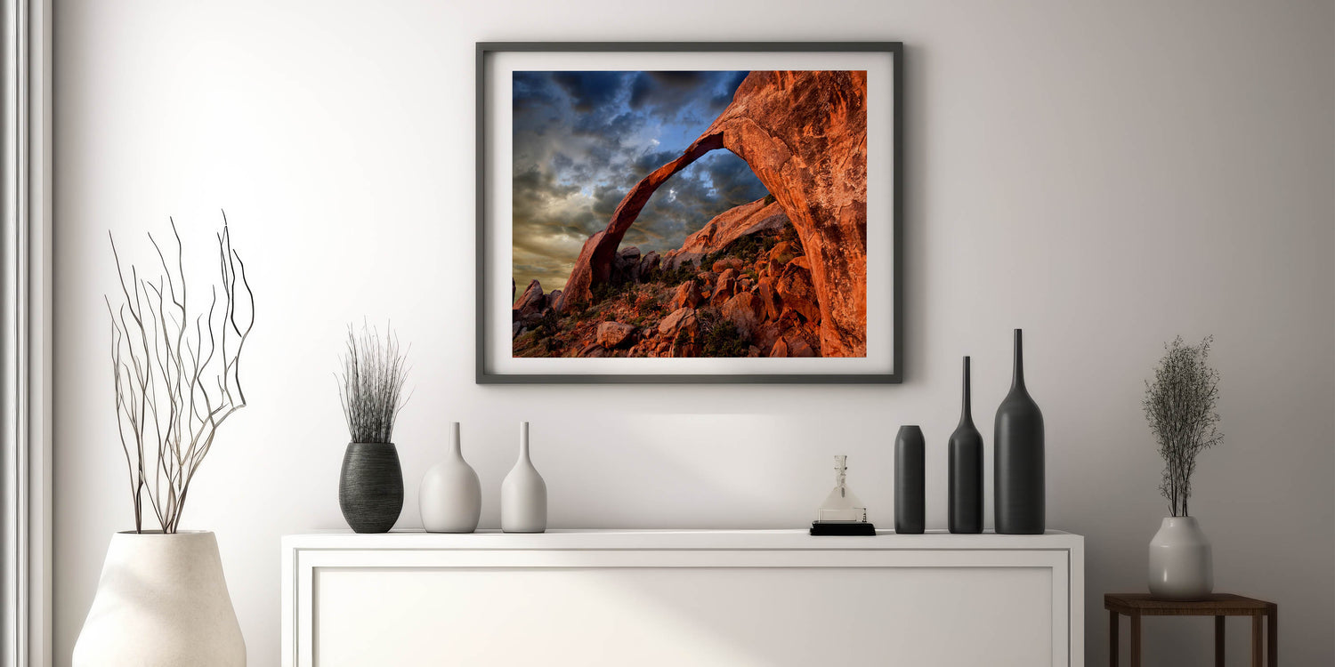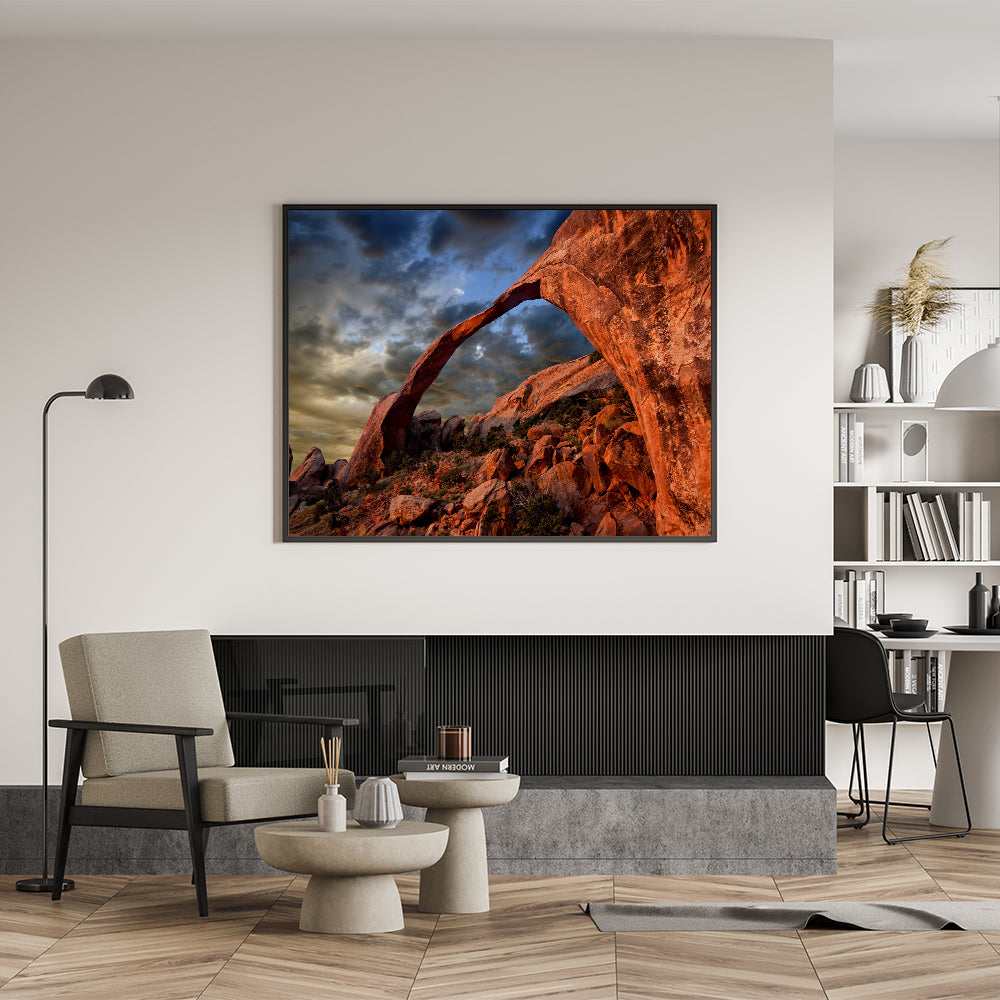 Capture the rugged beauty of the American Southwest with this stunning wall art featuring a majestic red rock arch. The warm tones of the rocks against the moody sky create a dramatic and awe-inspiring scene that transports you to the heart of the desert. This artwork is perfect for those who appreciate the raw, untamed beauty of nature and want to bring a piece of the wild into their home.