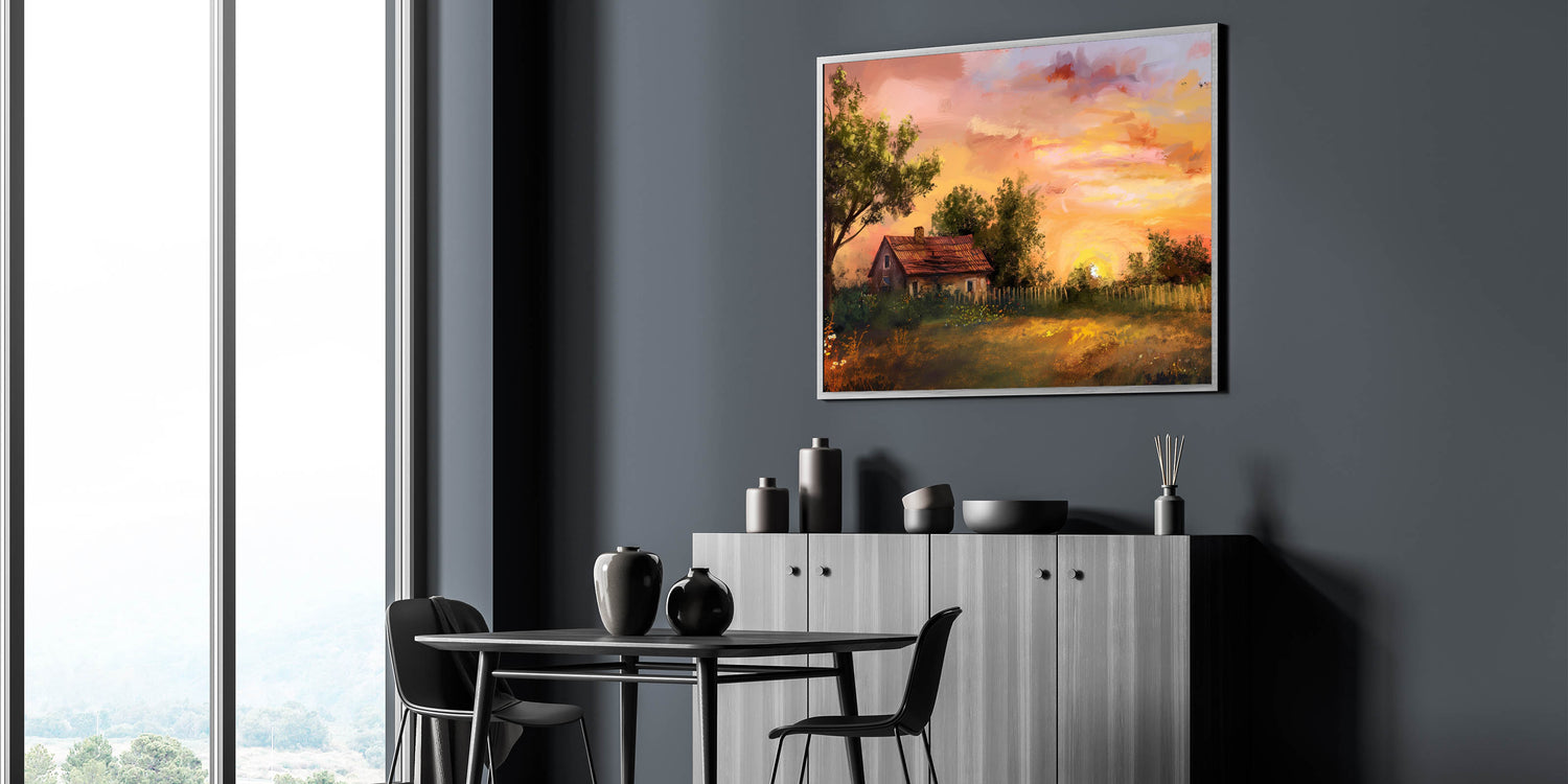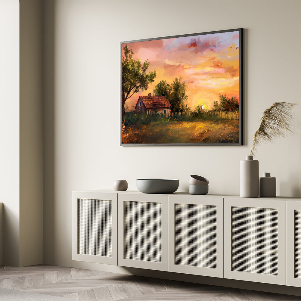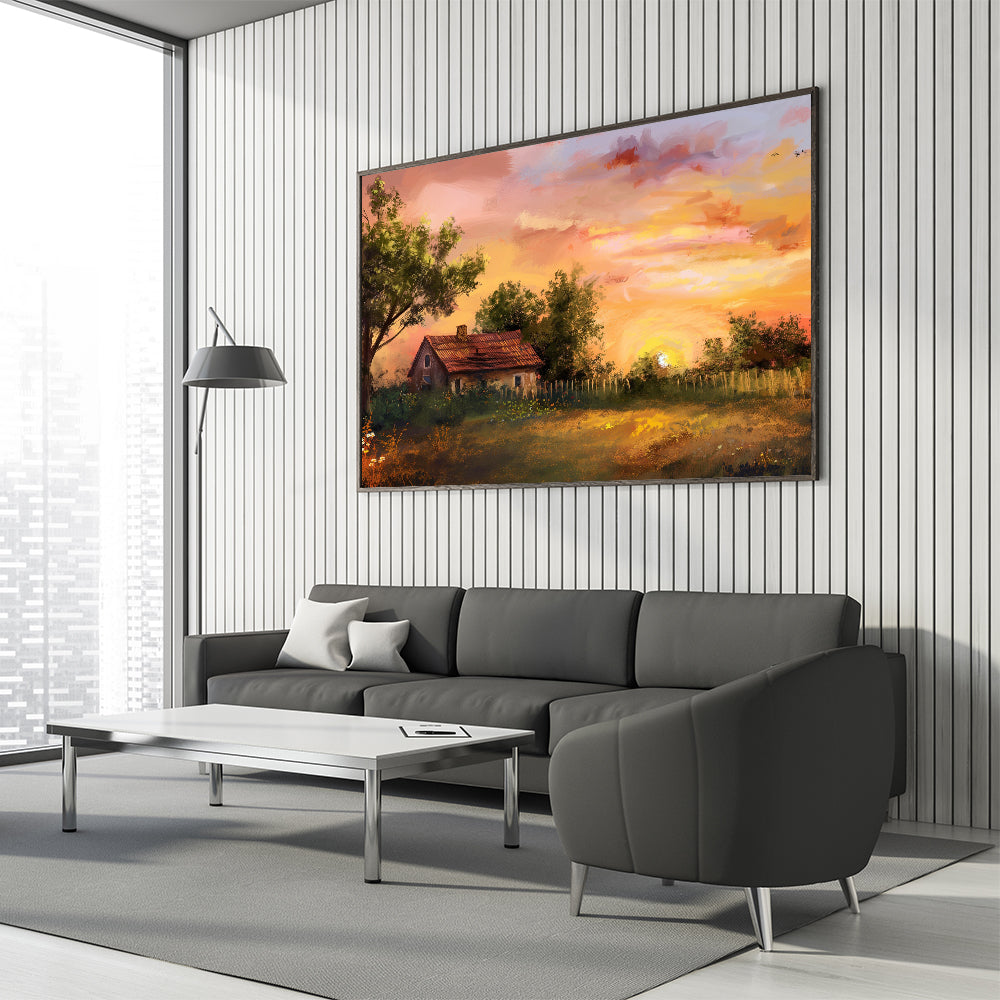 This artwork is ideal for those who appreciate the beauty of nature and the calmness of rural life. Whether you're looking to enhance your living room, bedroom, or office, this piece will create a welcoming and cozy atmosphere. The timeless appeal of this landscape makes it a versatile addition to both modern and traditional decor styles.