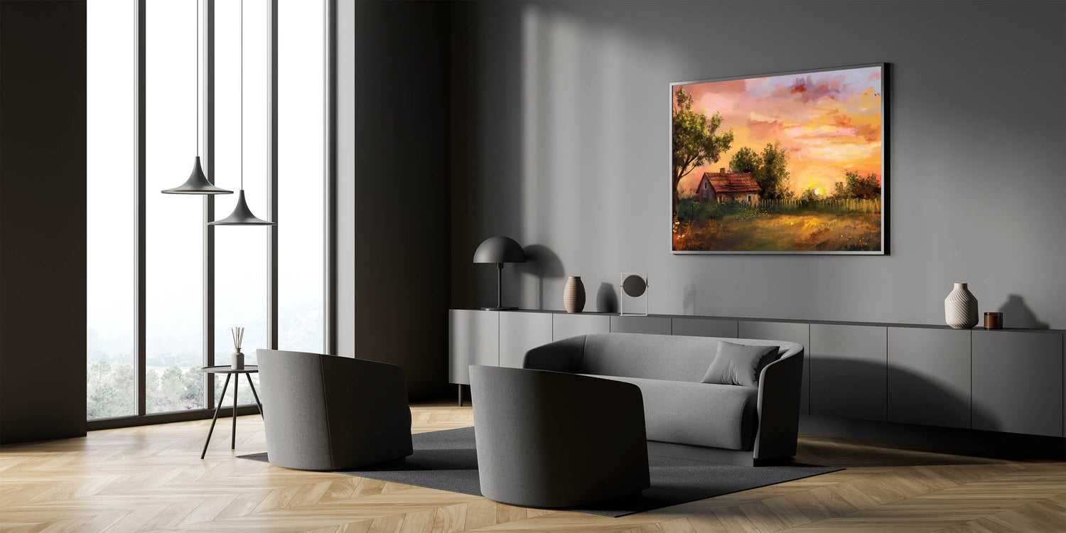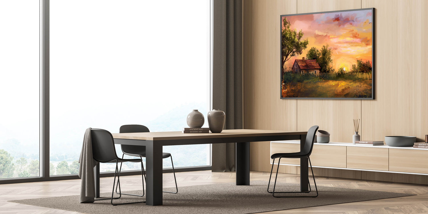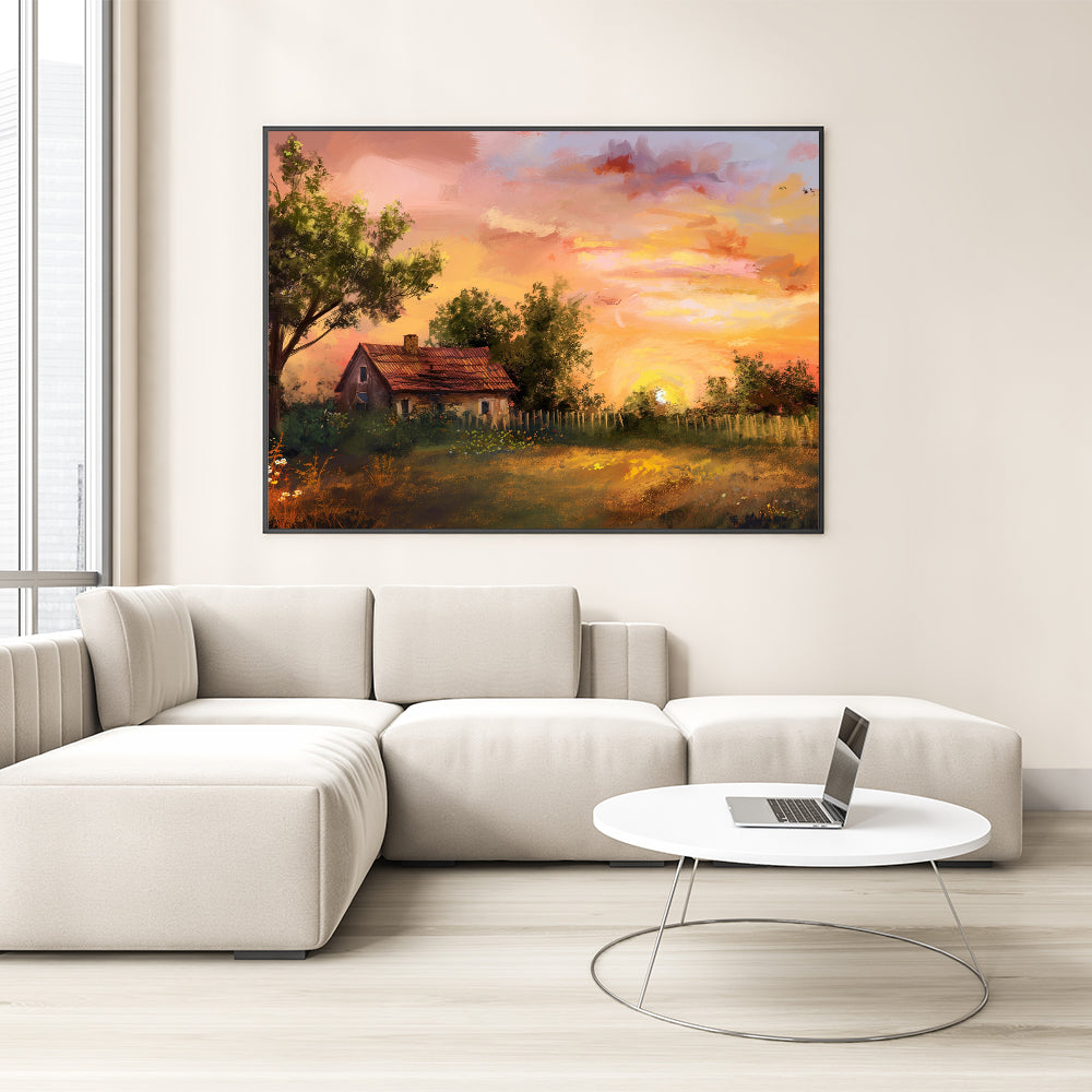 This artwork is ideal for those who appreciate the beauty of nature and the calmness of rural life. Whether you're looking to enhance your living room, bedroom, or office, this piece will create a welcoming and cozy atmosphere. The timeless appeal of this landscape makes it a versatile addition to both modern and traditional decor styles.