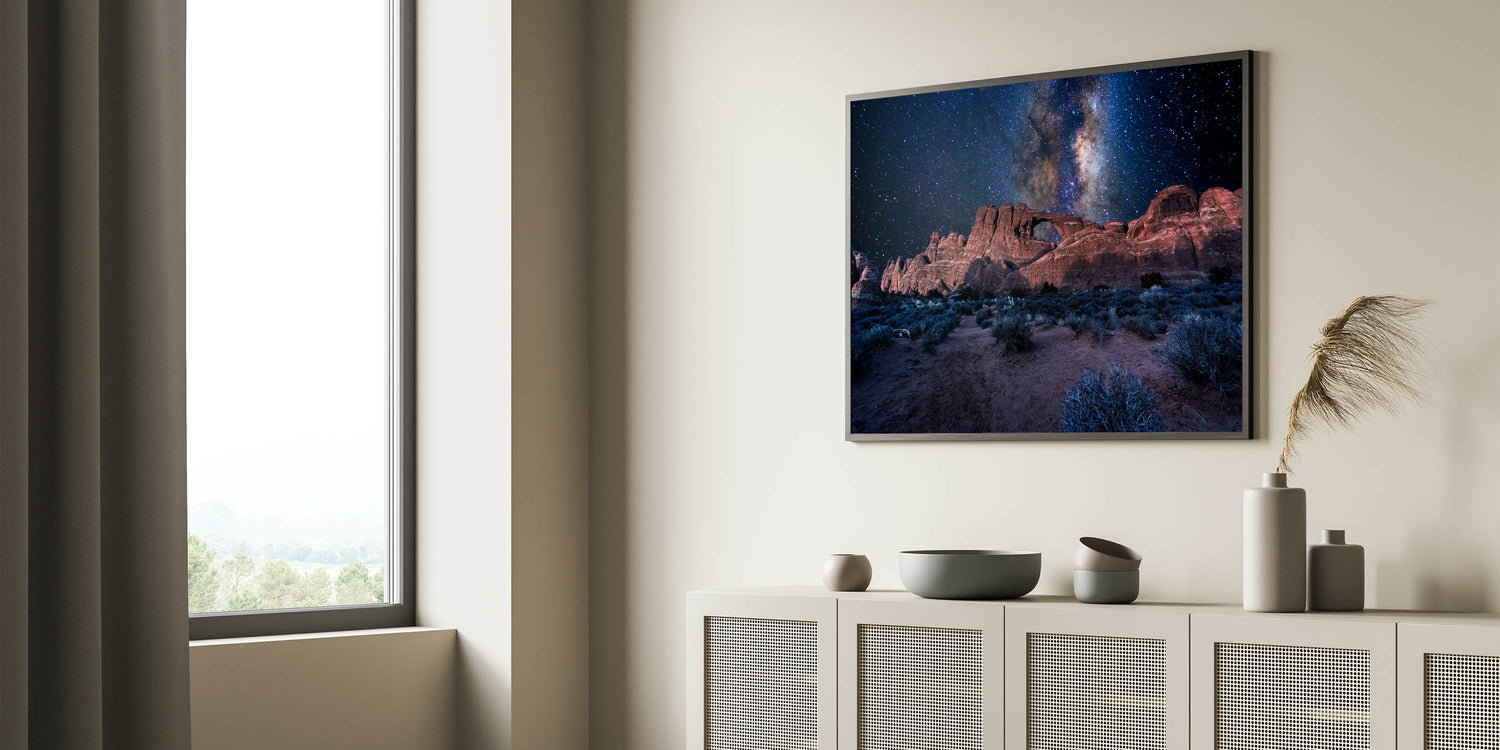 • High-quality depiction of a desert arch under the Milky Way, perfect for creating a tranquil and inspiring focal point.