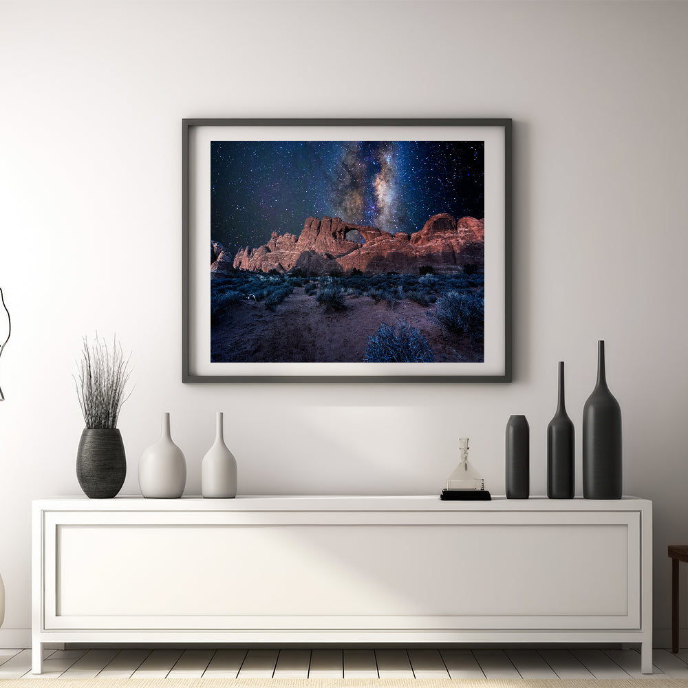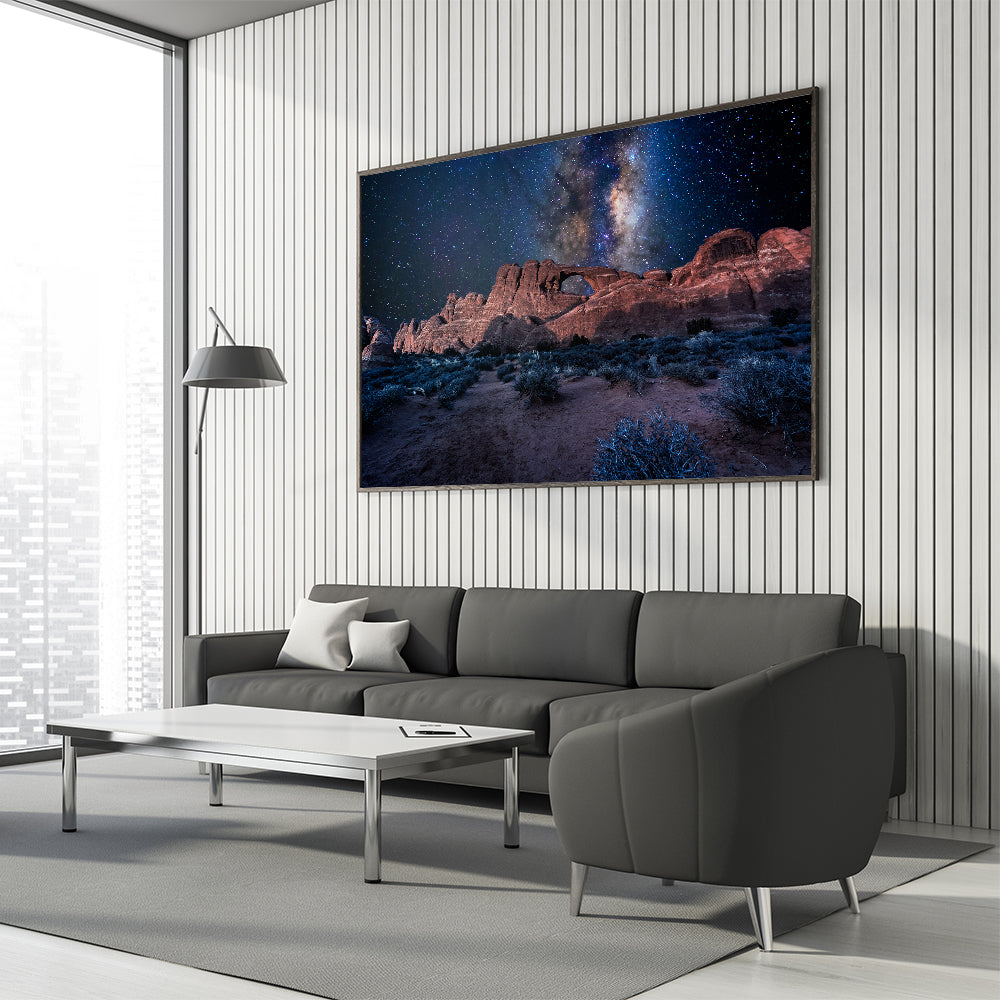 Transform your space with this celestial masterpiece that celebrates the grandeur of the night sky. Whether displayed in a home office, living room, or bedroom, this artwork will bring a sense of peace and wonder to your environment. Let the beauty of the stars and the desert inspire and captivate with this striking piece.