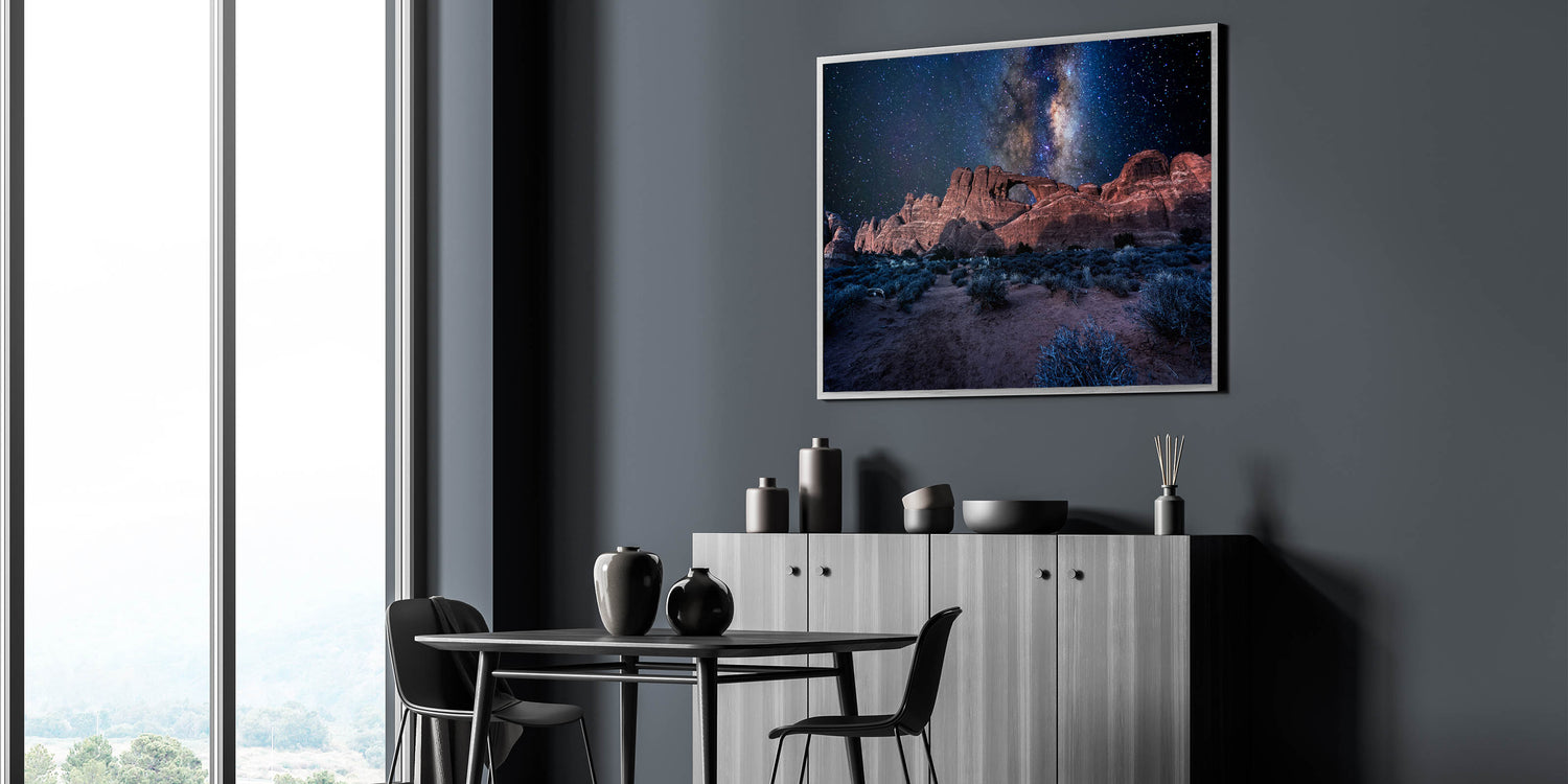 Marvel at the breathtaking beauty of the desert under a starry sky with this stunning wall art featuring a natural arch framed by the Milky Way. The deep blues of the night sky contrast with the rugged red rocks, creating a mesmerizing scene that captures the serenity and wonder of the desert at night. This artwork is perfect for those who are inspired by the mysteries of the cosmos and the timeless beauty of nature.