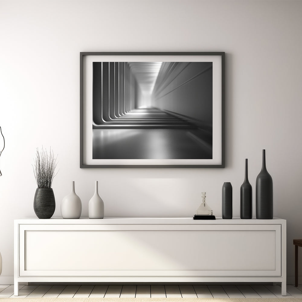Explore the depths of modern design with our Futuristic Minimalist Corridor Art, a captivating black-and-white print that draws the viewer into a seemingly endless perspective. This artwork beautifully captures the essence of contemporary architecture through its clean lines and the dramatic interplay of light and shadow.