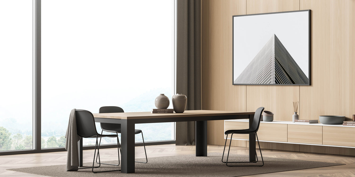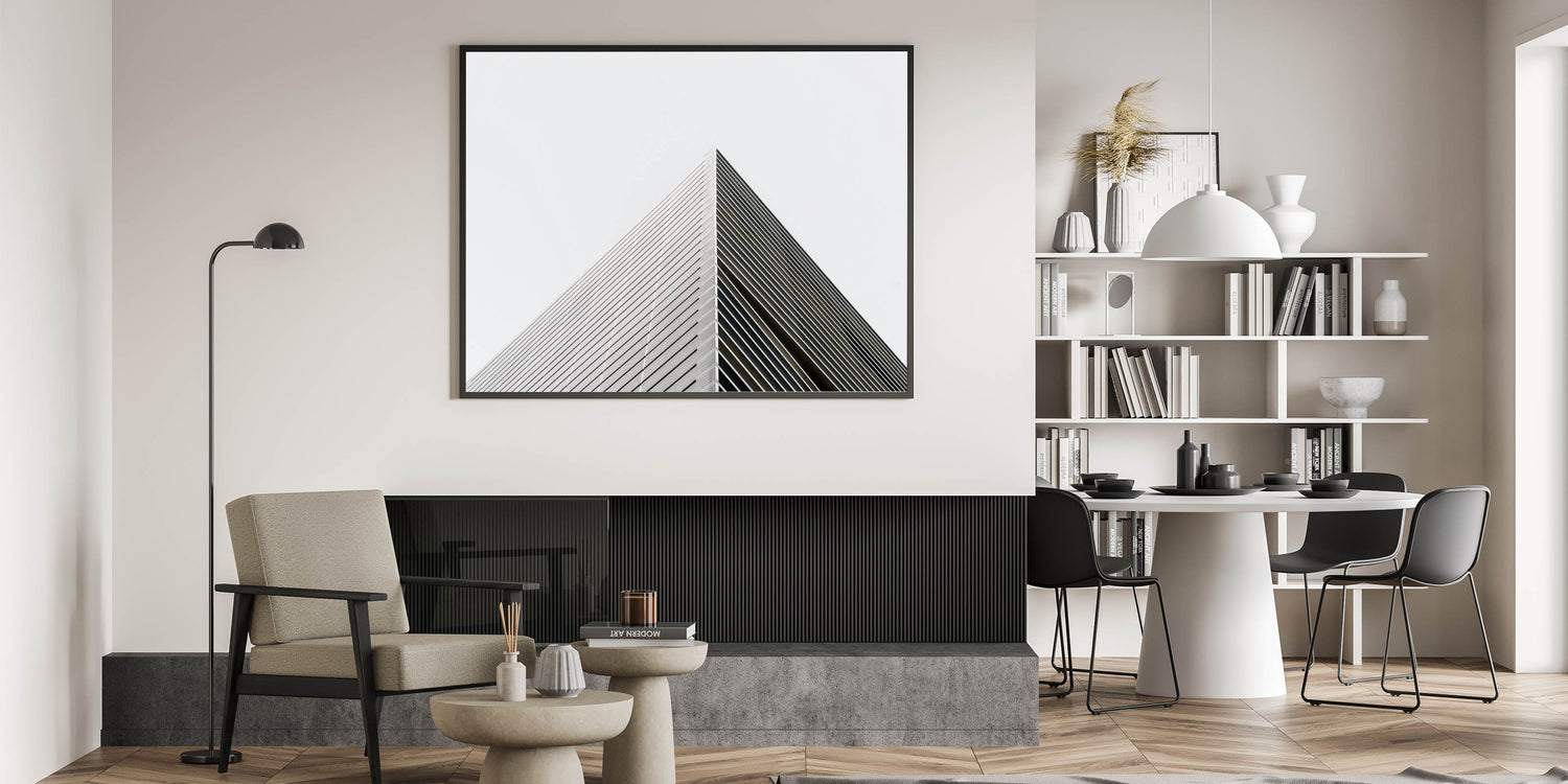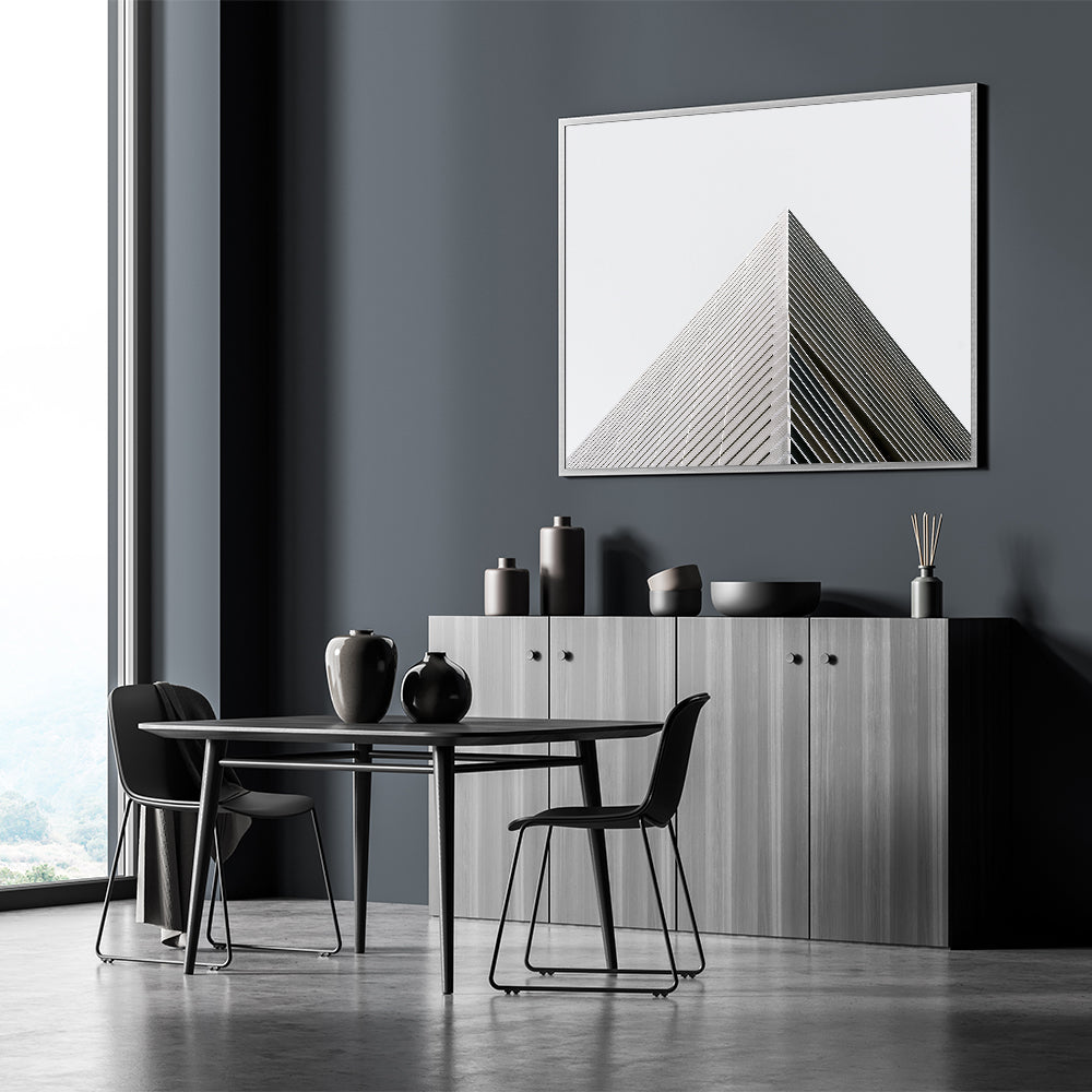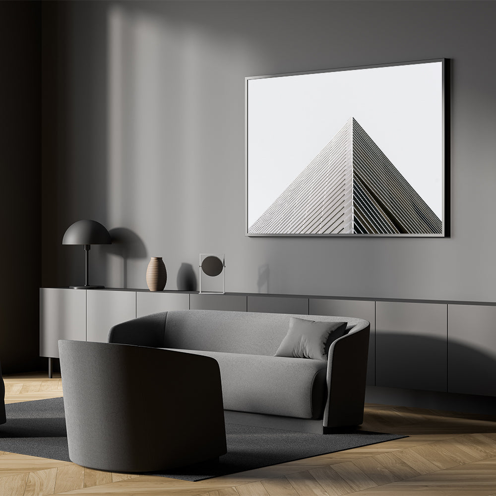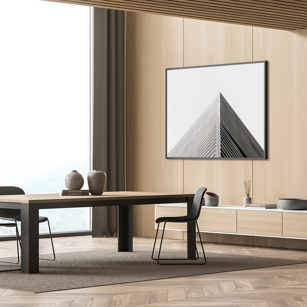 captures the sharp precision of modern architecture, focusing on the sleek, linear beauty of geometric forms. This artwork emphasizes simplicity and clean lines, making it an excellent addition for those who appreciate the elegance of minimalist design.