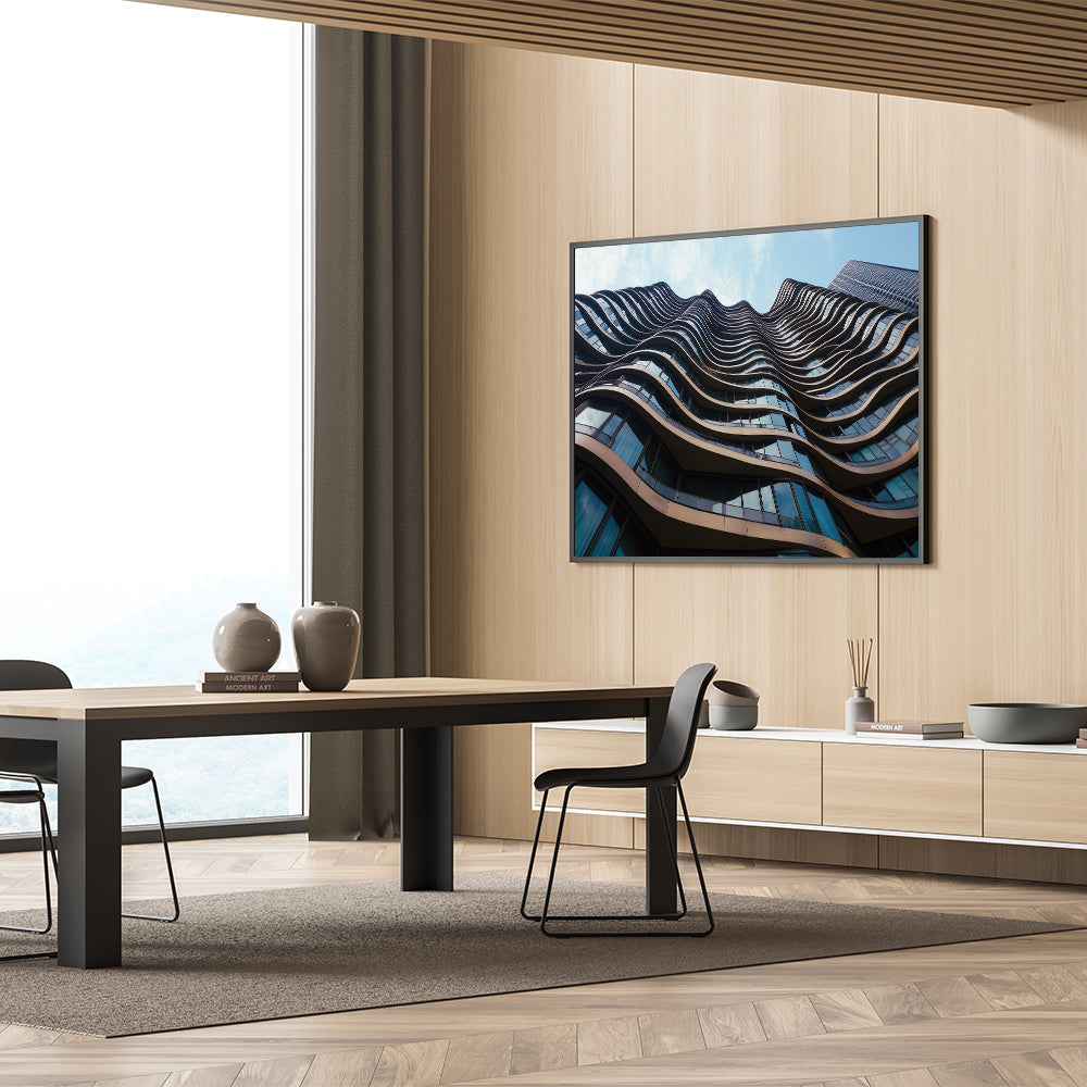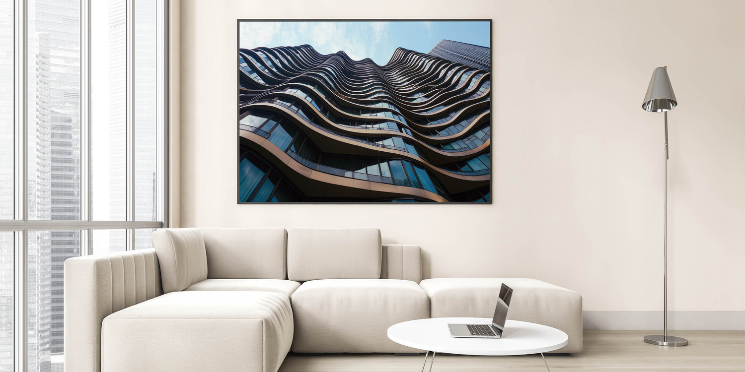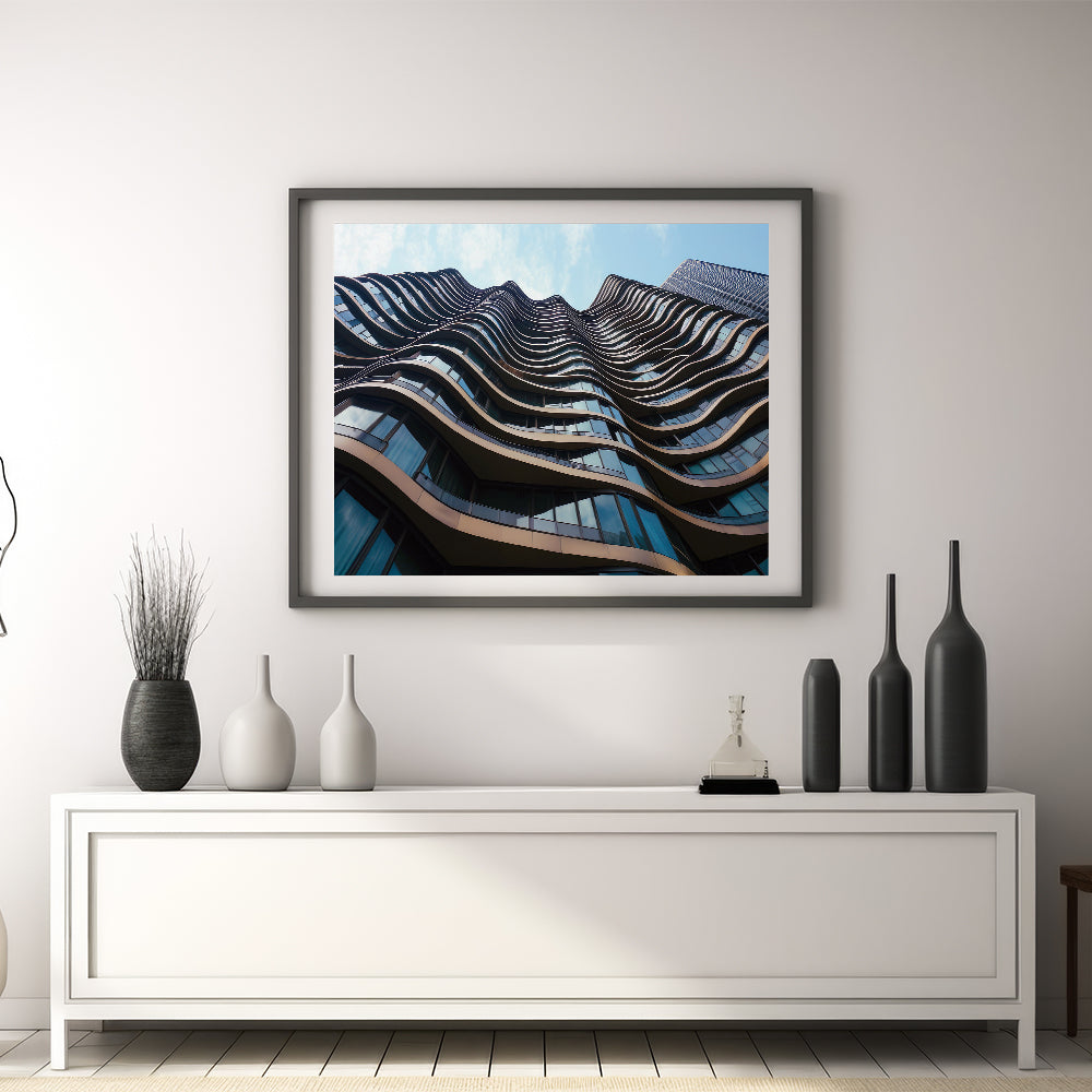 Introducing the Wavy Modern Architecture Canvas, a captivating display of contemporary design characterized by undulating forms and a harmonious blend of glass and metal. This artwork captures the unique aesthetics of modern urban architecture, presenting a rhythmic and fluid form that enhances any space with its innovative style.