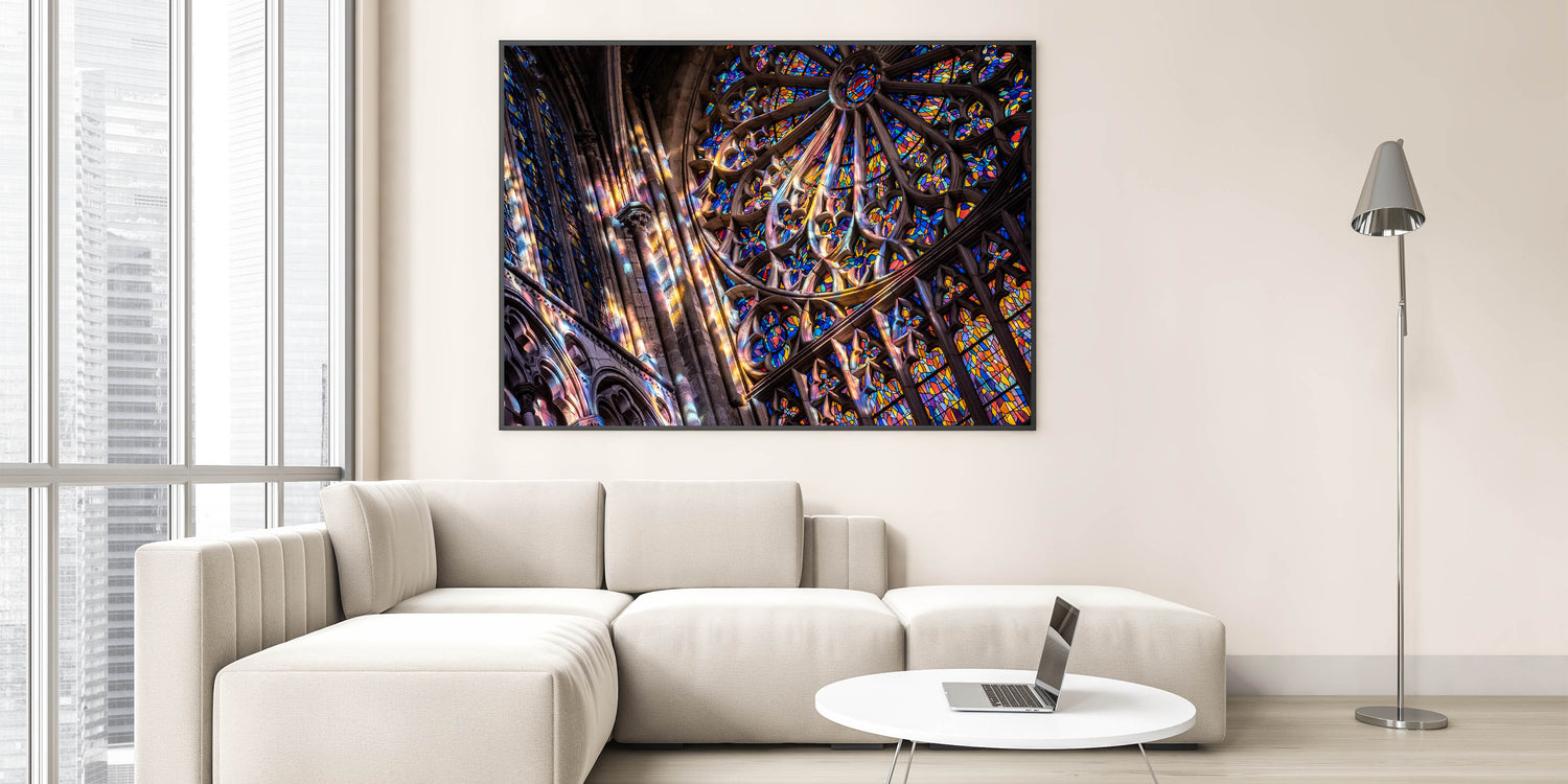 Illuminate your space with the vibrant beauty of this stunning wall art featuring a colorful stained glass window from a historic church. The intricate patterns and vivid hues create a mesmerizing effect as the light streams through, making this piece an eye-catching focal point in any room. Perfect for those who appreciate the artistry of religious architecture and want to bring a sense of spirituality and elegance into their decor.