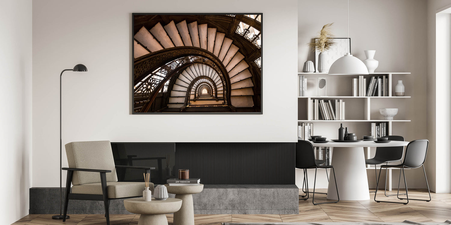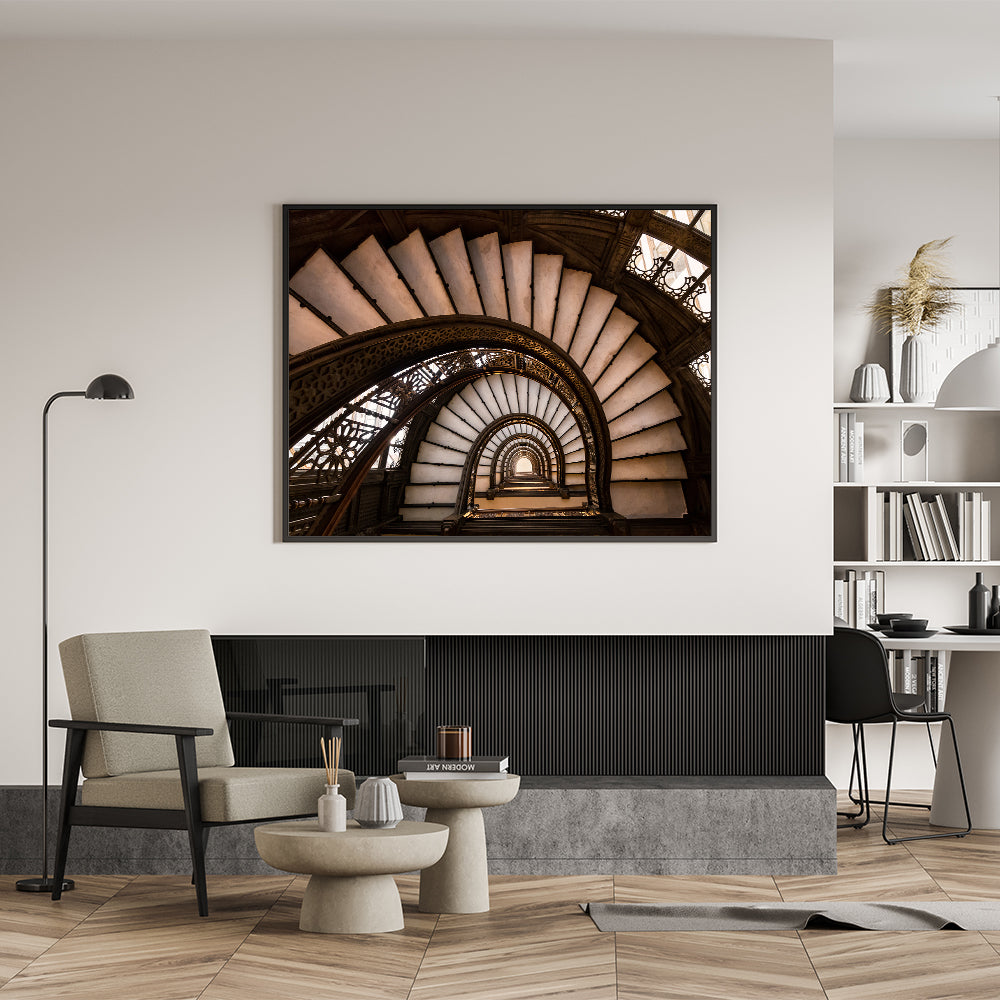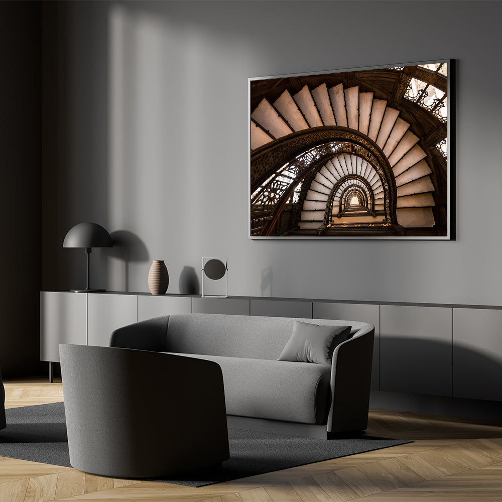 This staircase wall art is not only a statement piece but also a reflection of elegance and sophistication. Perfect for those who appreciate architectural beauty and want to add a touch of class to their living space. Whether you prefer a sleek acrylic finish or a traditional framed print, this artwork will enhance any room.