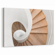 Enhance your living space with this elegant wooden spiral staircase wall art, a masterpiece that combines simplicity and sophistication. This stunning photograph captures the natural beauty of wooden steps spiraling gracefully within a modern architectural design. The soft tones of the wood against the clean white backdrop create a warm and inviting atmosphere, making it an ideal piece for any contemporary home or office setting.