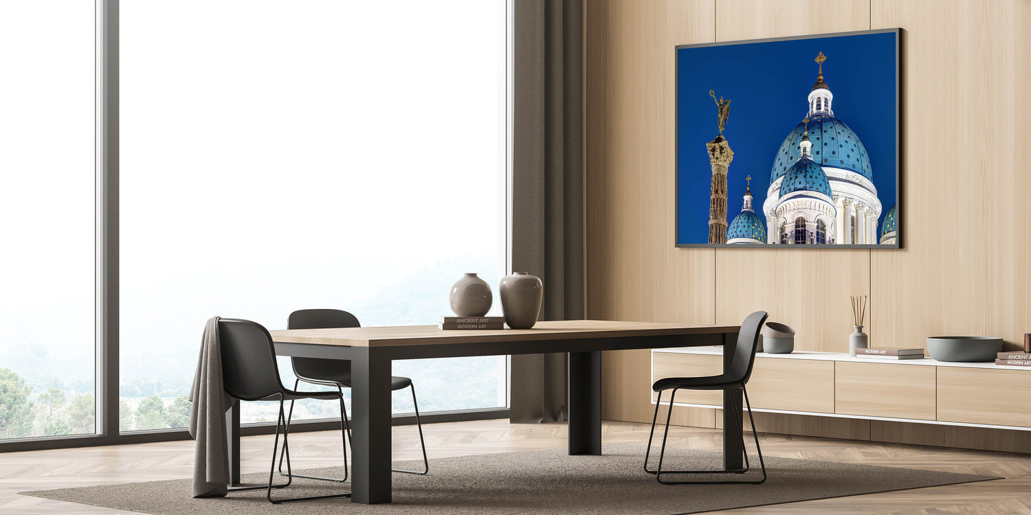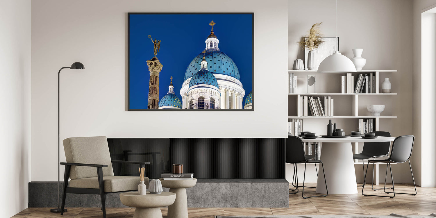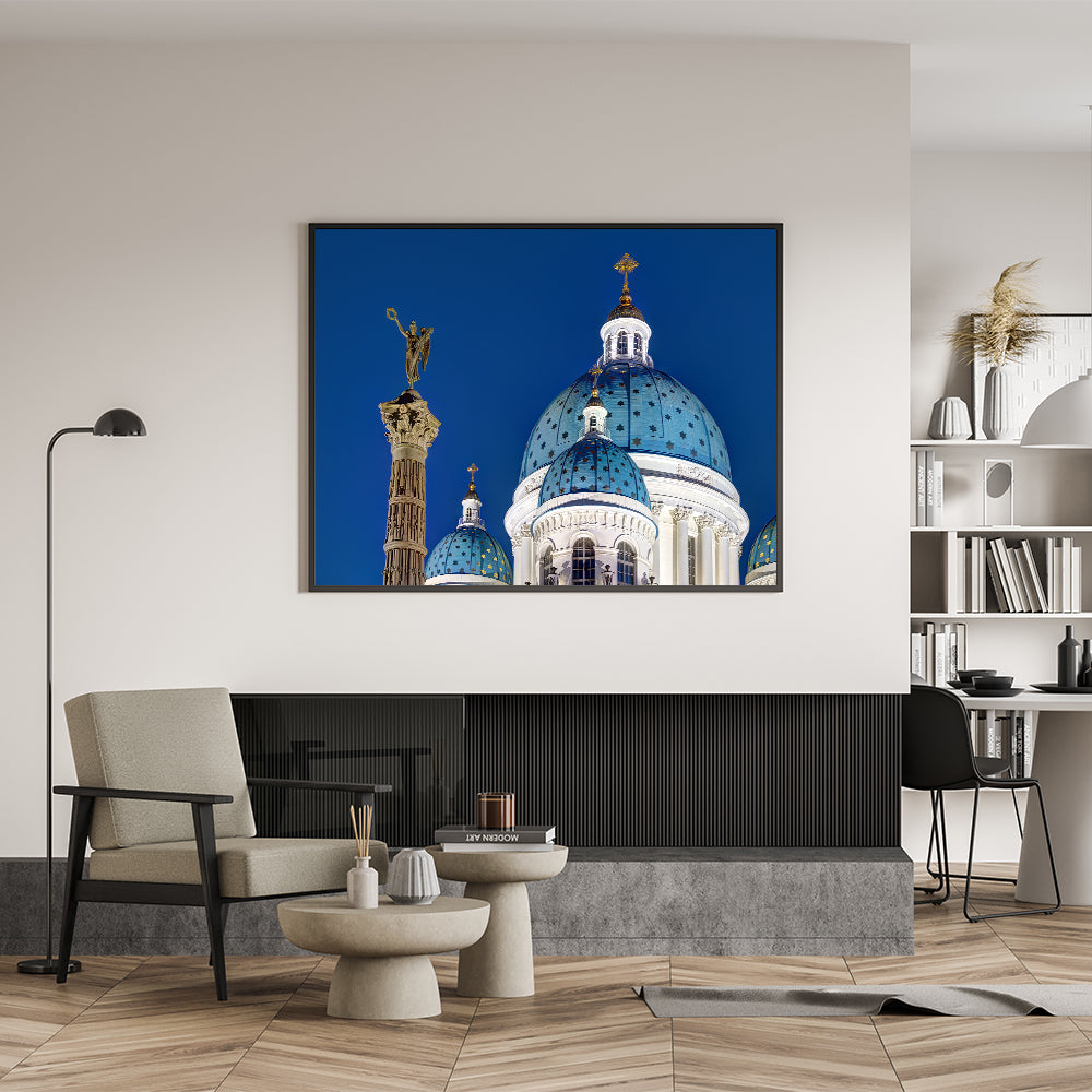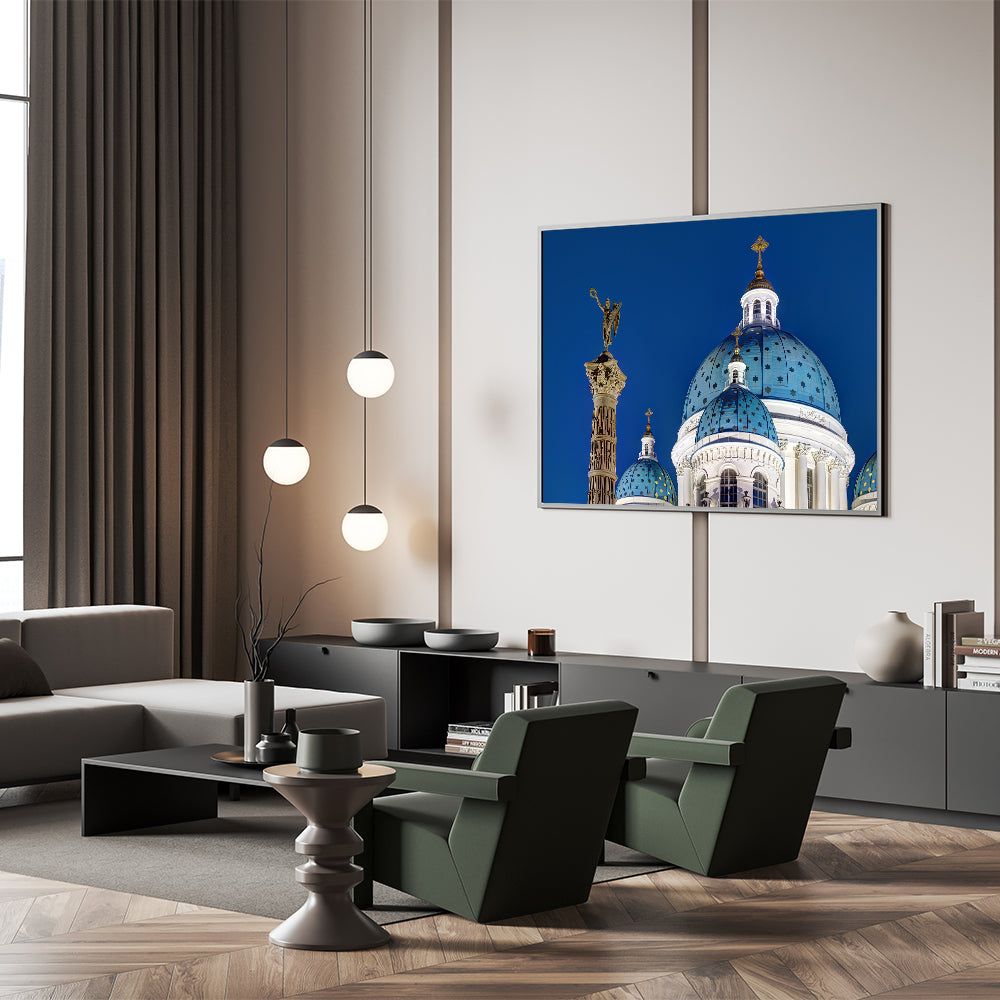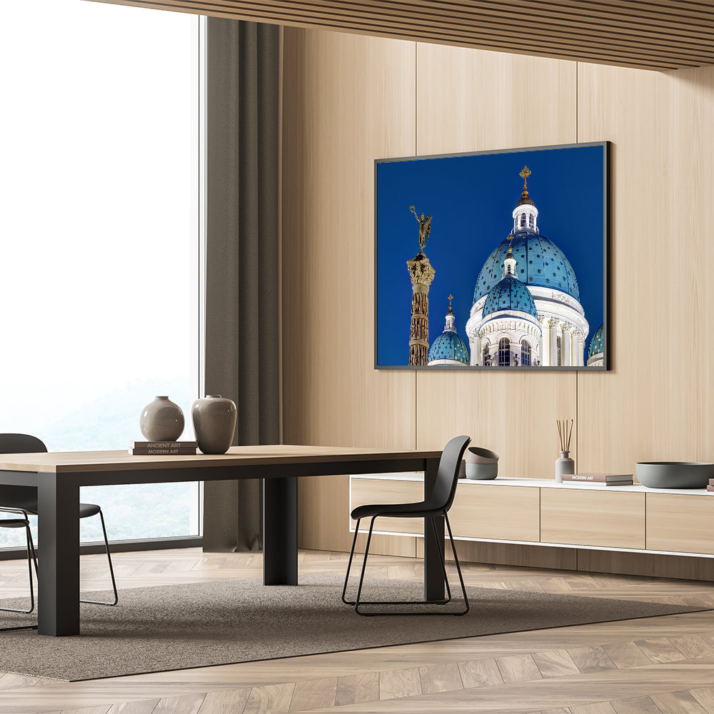 Bring a touch of historical grandeur to your home with this stunning piece of Cathedral wall art. This captivating design showcases the majestic domes of a European cathedral, set against a deep blue sky, embodying the beauty of Gothic architecture. The intricate details of the cathedral's façade and the iconic religious elements make this artwork a perfect choice for those who appreciate both history and art.