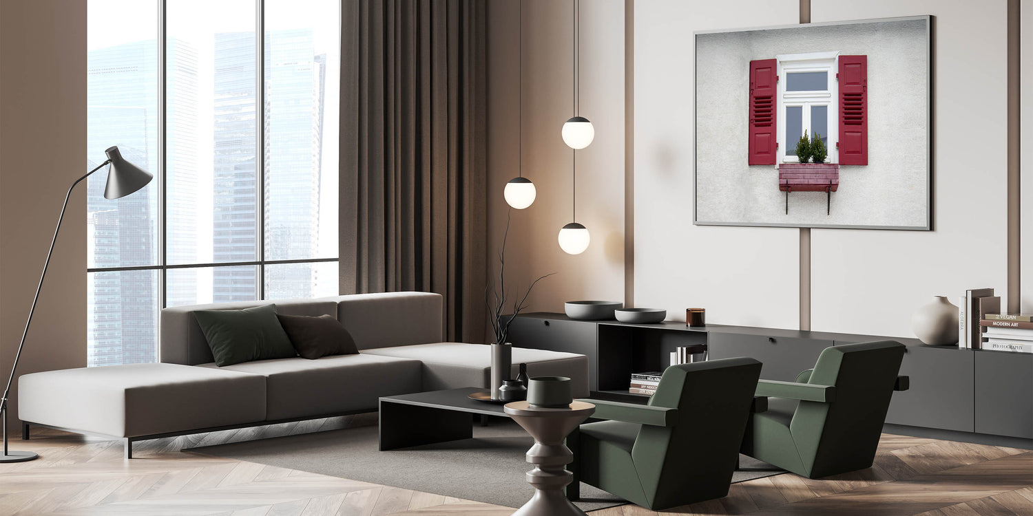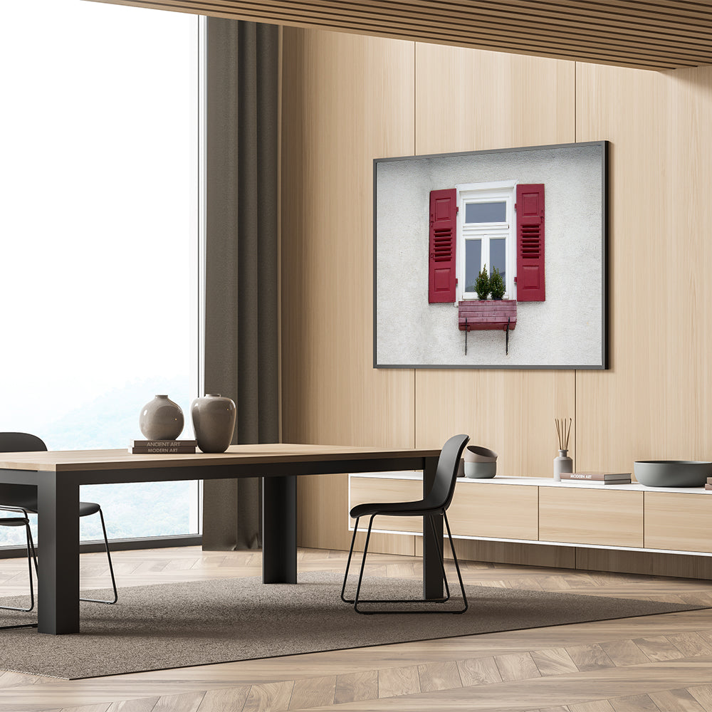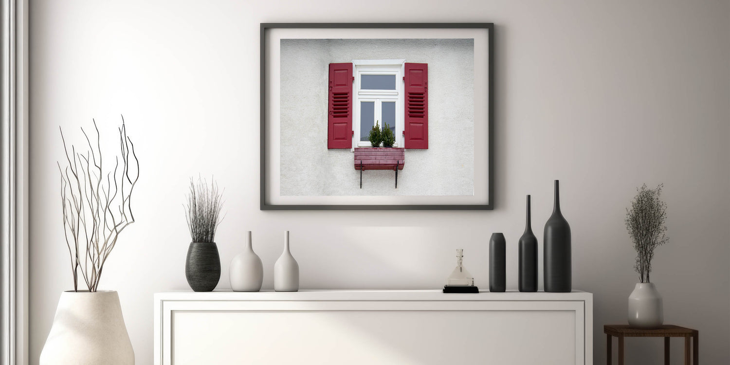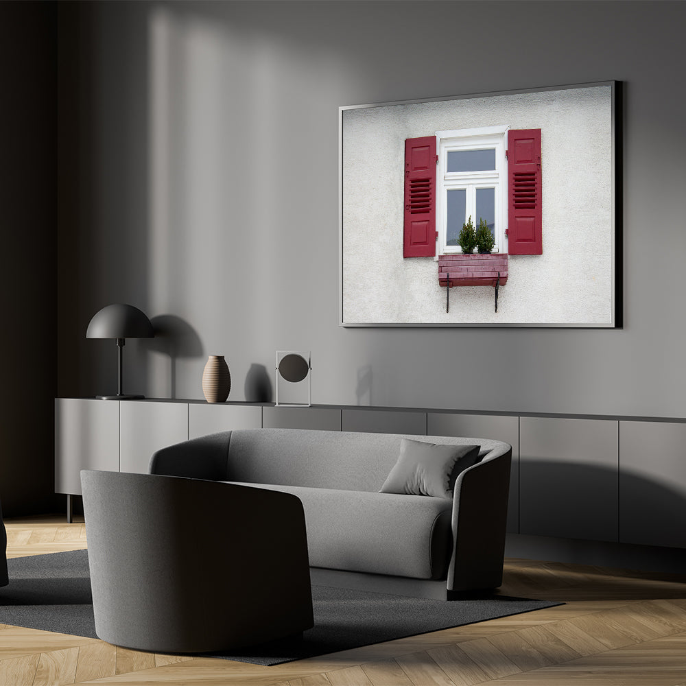 Perfect for modern or minimalist decor, this window wall art adds a subtle yet impactful statement to any room. The crisp lines and vibrant red shutters will enhance your home or office with a touch of architectural charm.