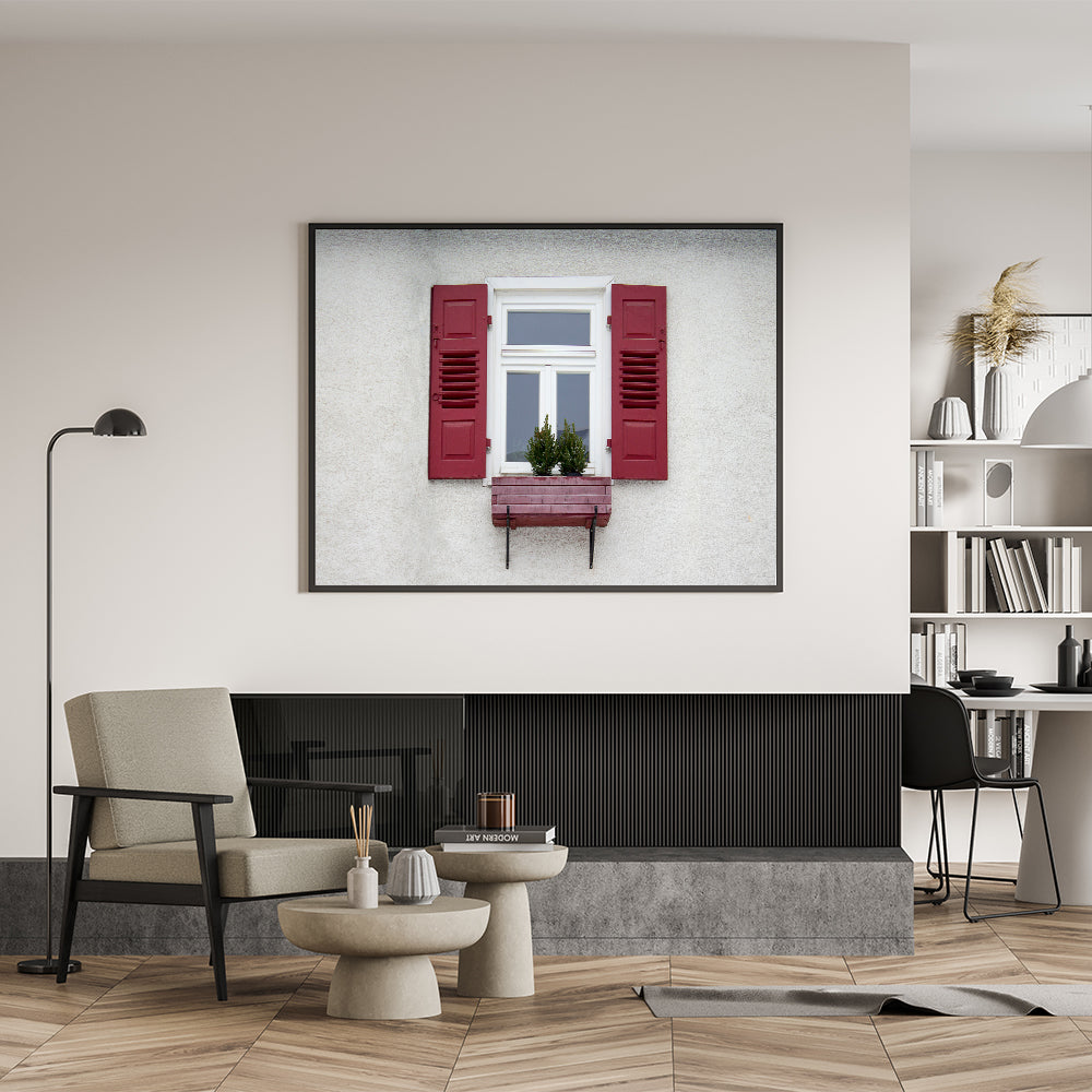 Add a touch of simplicity and elegance to your space with this Minimalist Window Wall Art, featuring striking red shutters paired with a touch of greenery. The clean lines and muted tones of the building contrast beautifully with the vibrant red, making this piece perfect for those who appreciate understated beauty and modern design. The small plants in the window box add a hint of nature, bringing warmth and life to the minimalist composition.