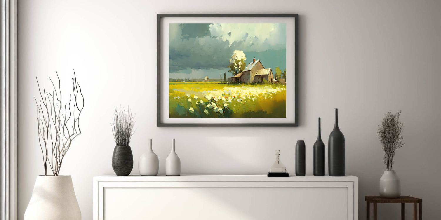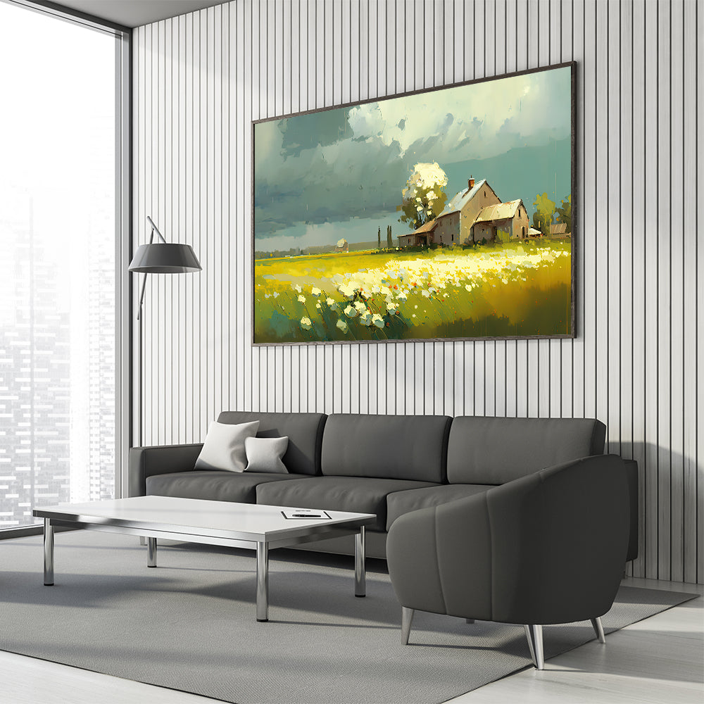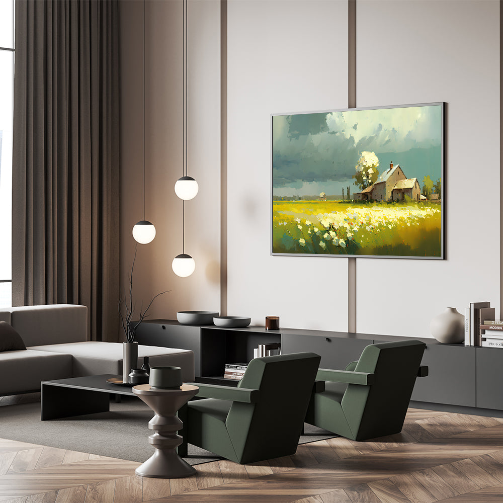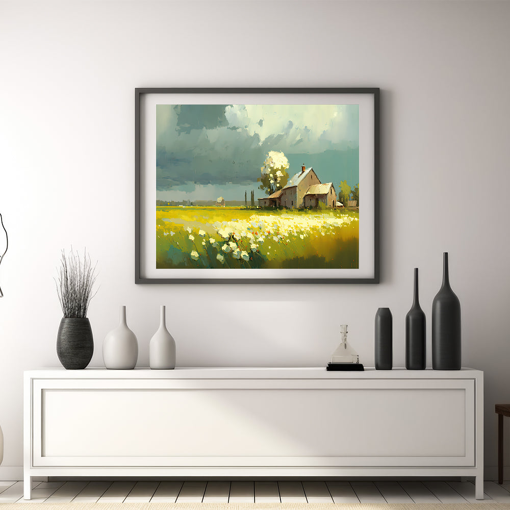 Capture the essence of tranquil countryside living with this stunning rustic cottage canvas print. The artwork showcases a charming rural scene with a cozy cottage nestled amid vast fields of yellow flowers, under a dramatic sky. This piece perfectly embodies the serenity and beauty of rustic life, making it an ideal addition to any home seeking to evoke a sense of peace and simplicity.