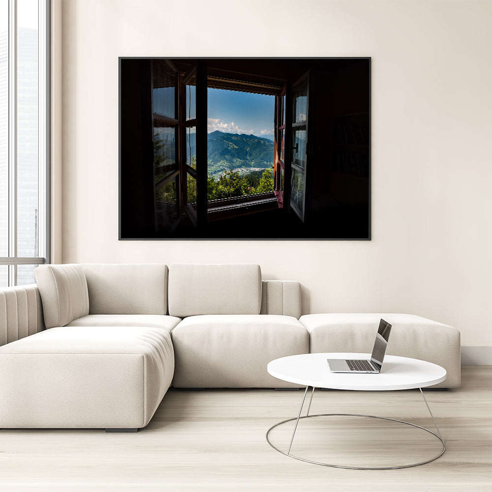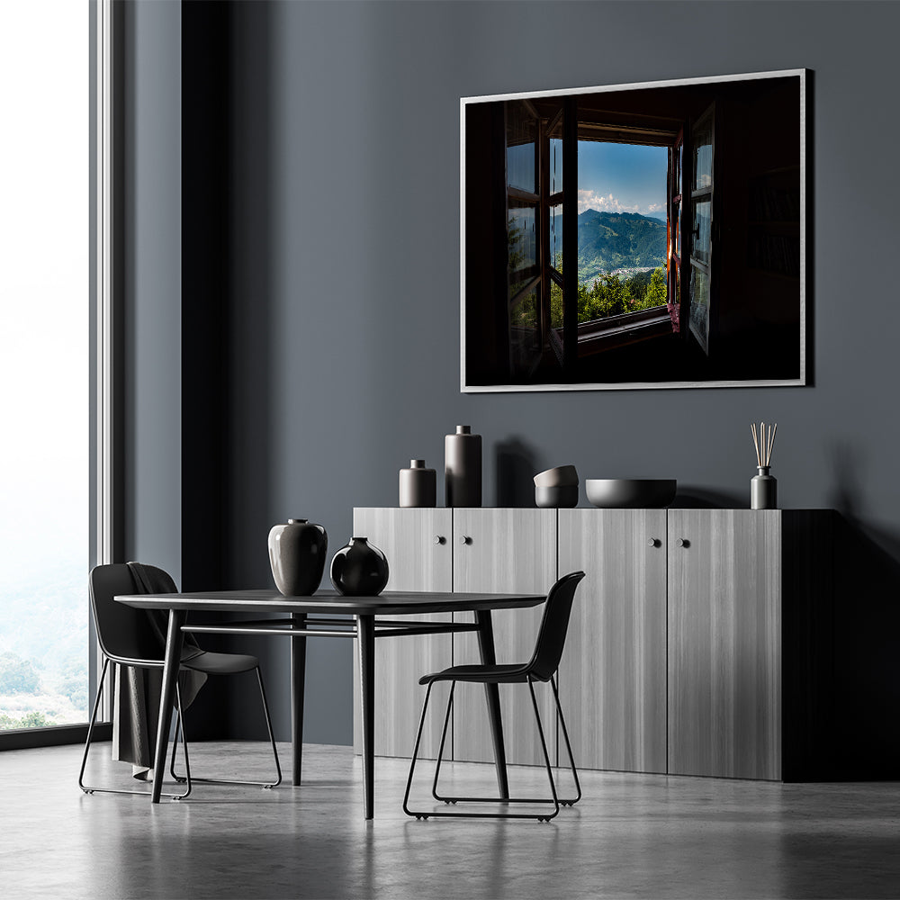 Immerse yourself in the beauty of nature with this Mountain View Window Wall Art, featuring a stunning landscape framed by a rustic wooden window. The expansive view of the mountains and lush greenery offers a serene escape, making it a perfect addition to any room in your home or office. The dark interior contrasts with the bright and inviting outdoors, creating a dramatic yet peaceful scene that draws you in.
