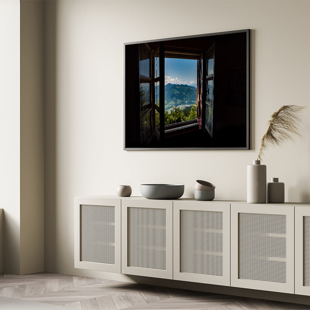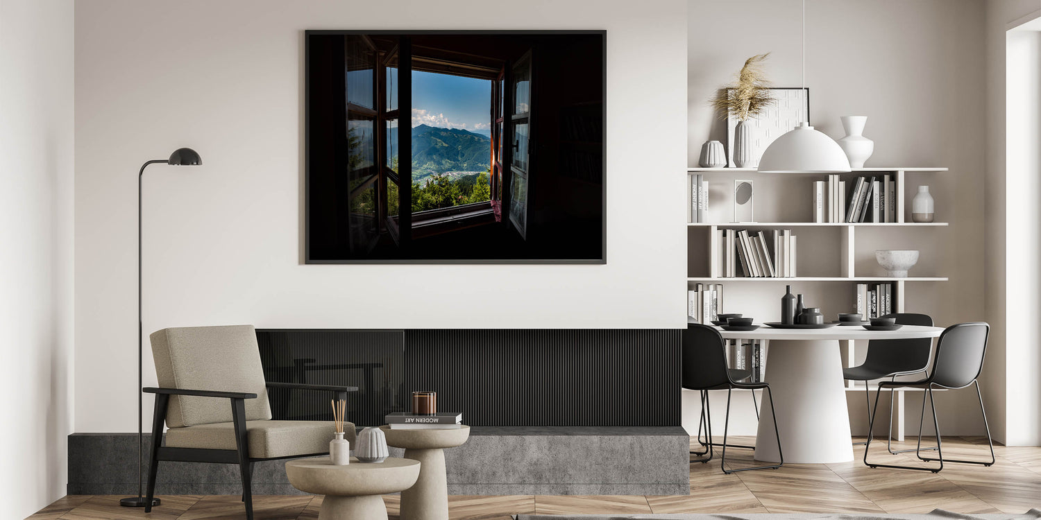Mountain View Window Wall Art – Scenic Landscape Through Wooden Frame Print