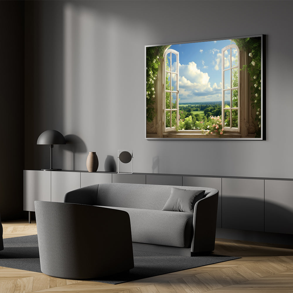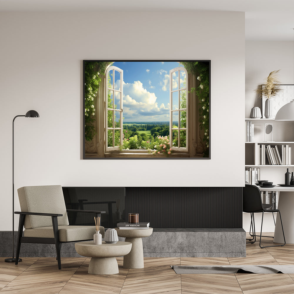 Transform your space with the tranquility of nature with this Serene Garden View Window Wall Art. Featuring a breathtaking view of vibrant green fields and a clear blue sky framed by a charming open window, this artwork brings the beauty of the outdoors into your home. The delicate flowers and lush greenery surrounding the window create a peaceful and inviting scene that is perfect for relaxation and reflection.