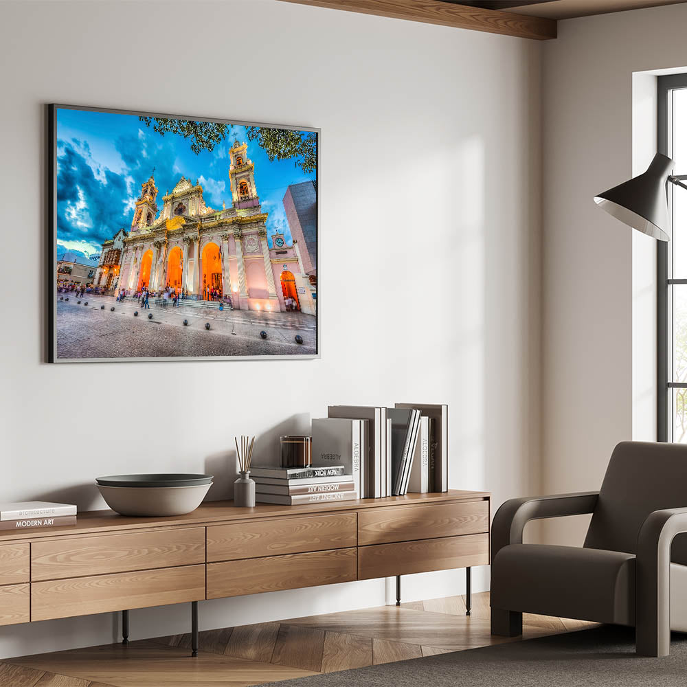 Experience the serene ambiance of an Argentine cathedral at dusk with our "Historic Church Facade" artwork. This stunning piece captures the intricate architectural details and soft evening lighting of one of Argentina's grand cathedrals, reflecting the spiritual and historical significance of the site.