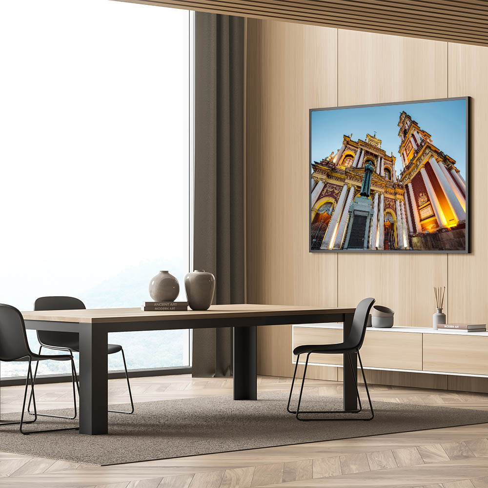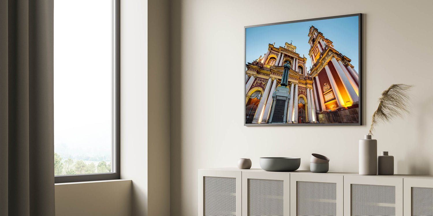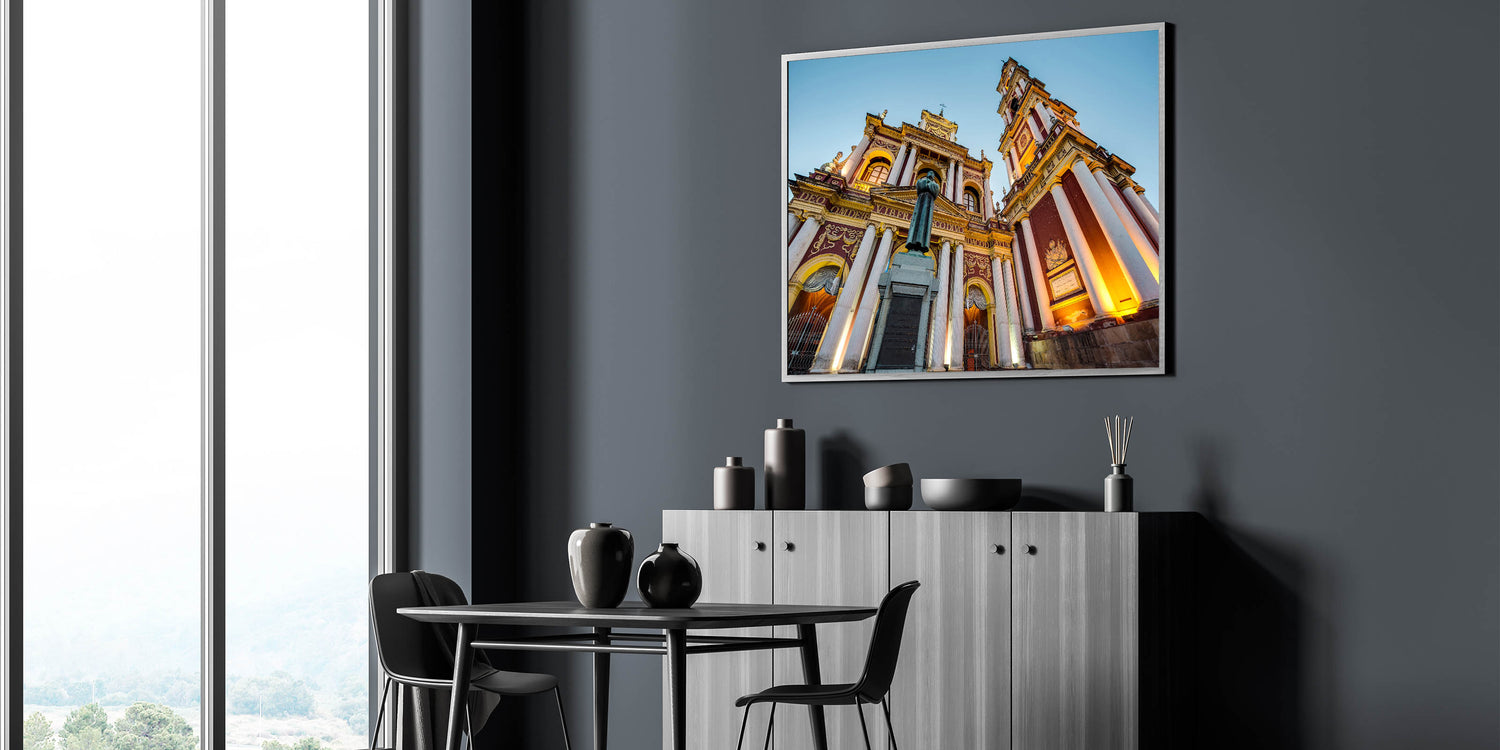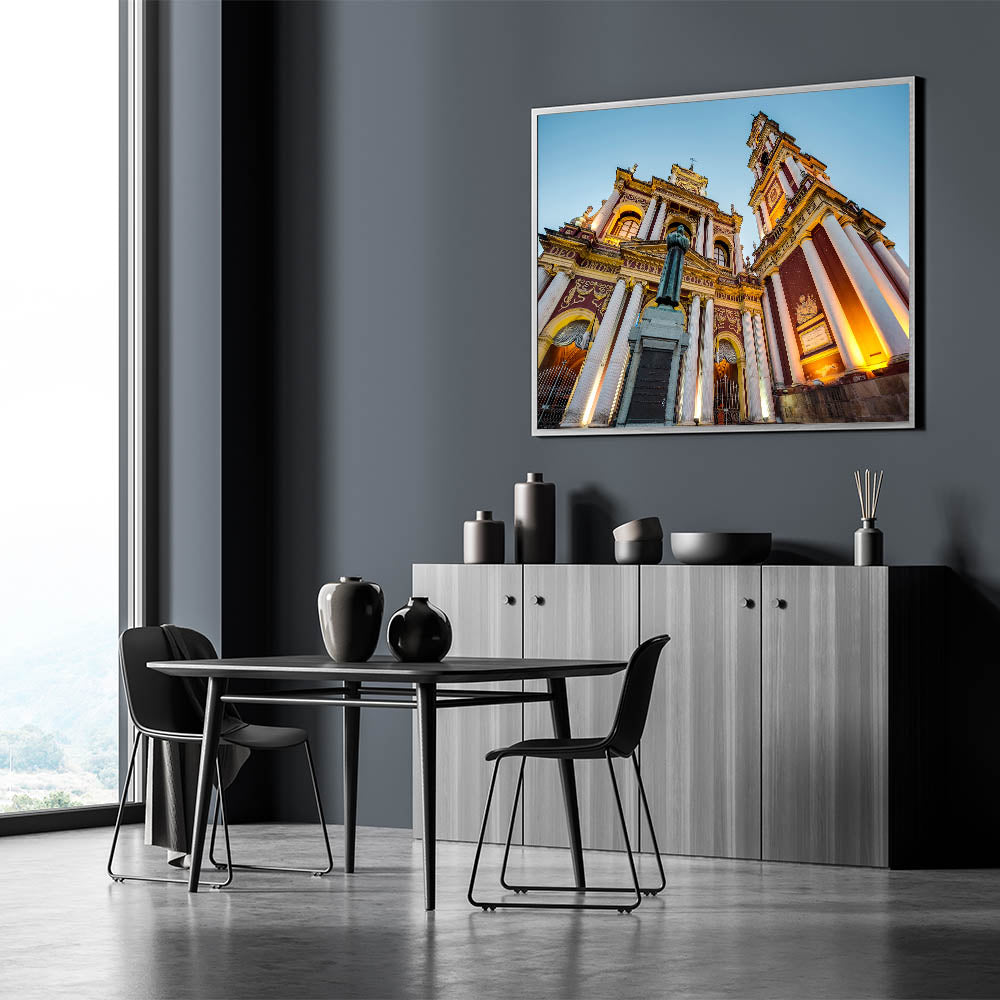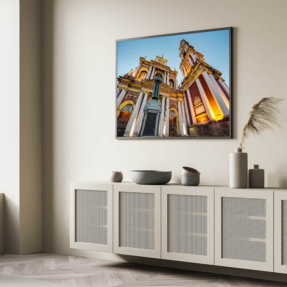 Marvel at the splendor of Argentine religious architecture with our "Historic Architecture Print." This artwork captures the stunning facade of one of Argentina’s most beautiful churches, highlighting its intricate design and vibrant color palette. The golden hour lighting enhances the majestic and divine feel, making it a perfect piece for those who appreciate architectural beauty and cultural history.