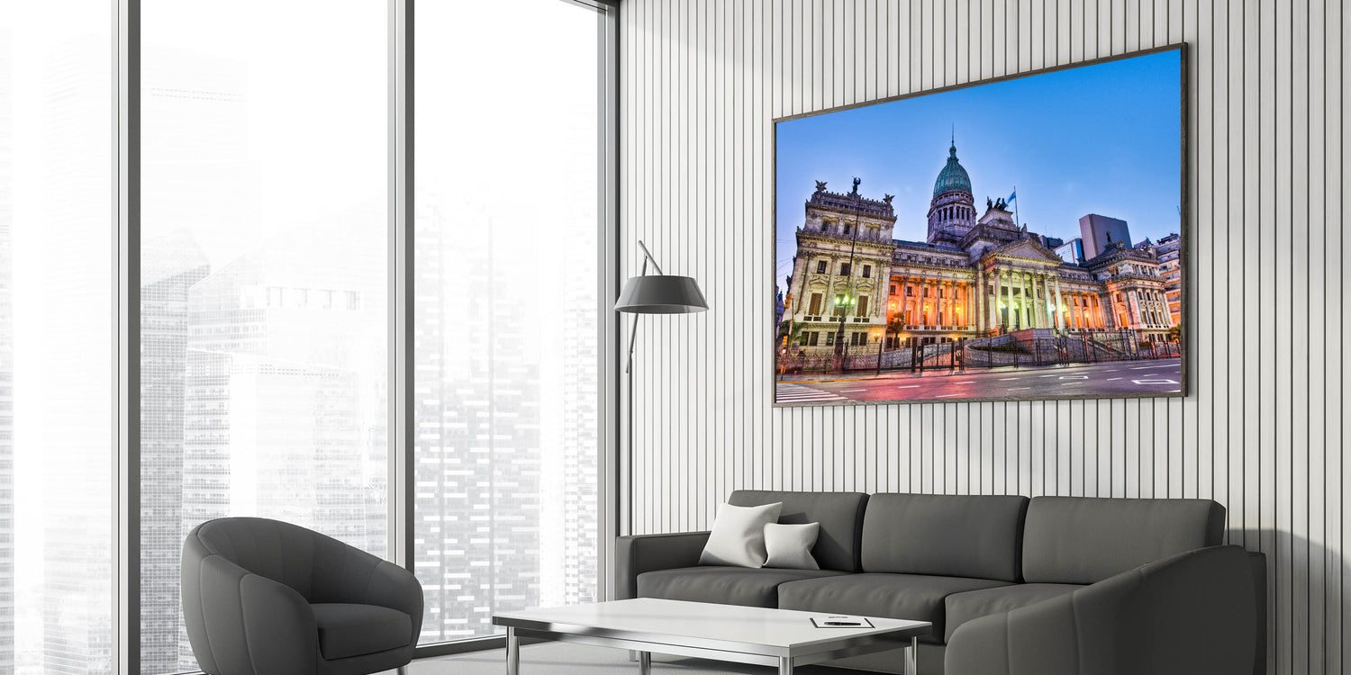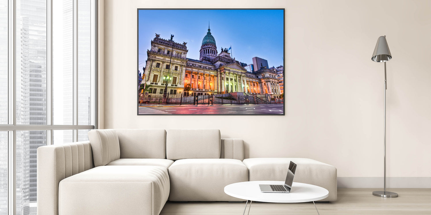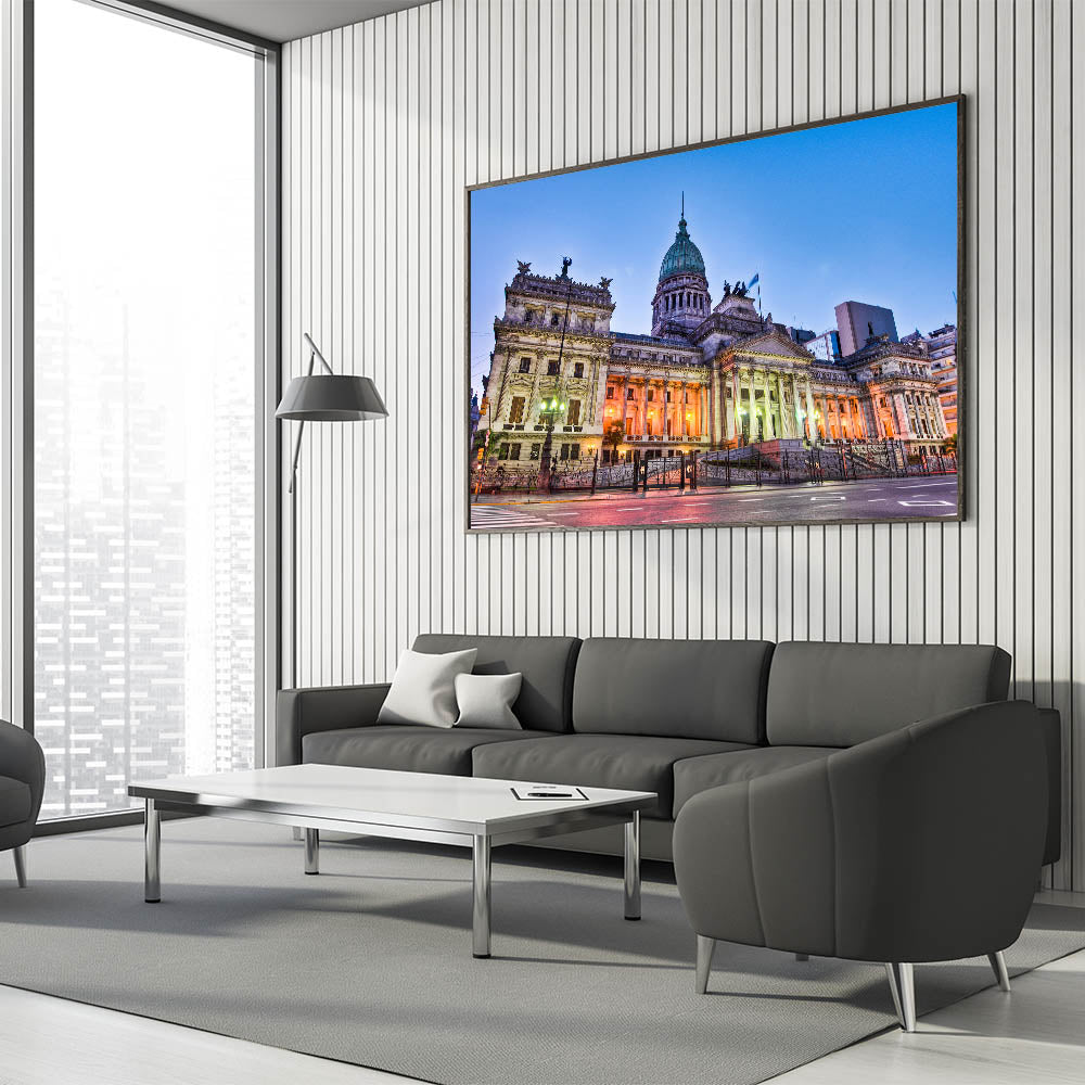 - Detailed Craftsmanship: Our prints highlight the intricate architectural details and soft lighting that illuminate the Congress building, offering a serene yet striking visual.