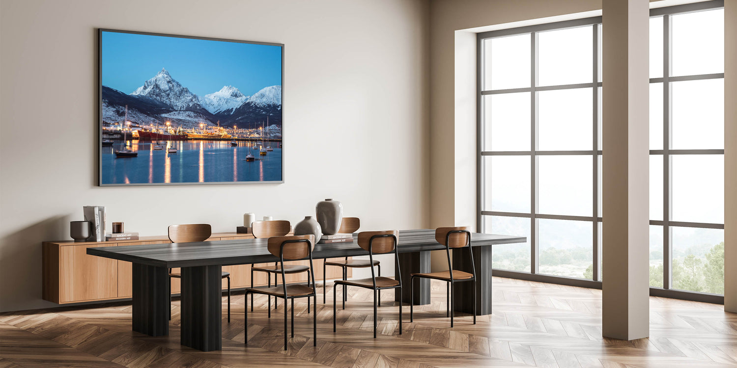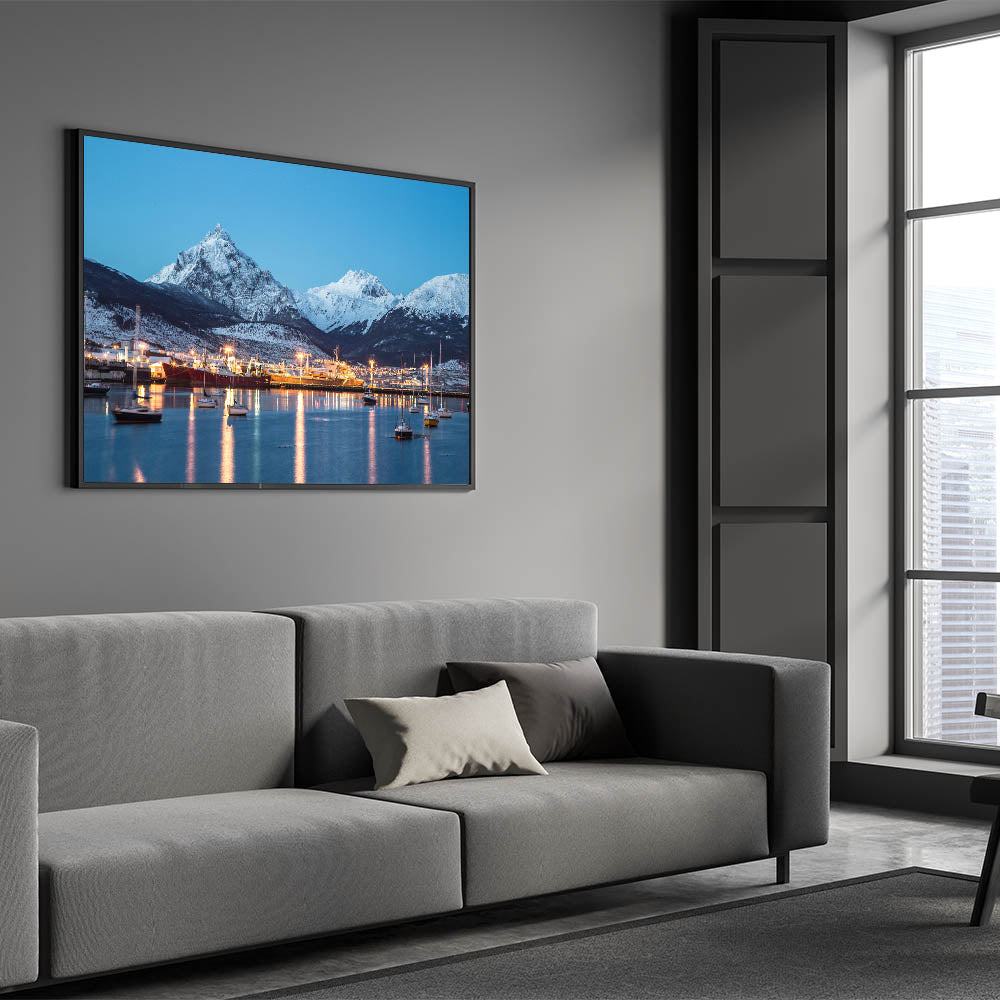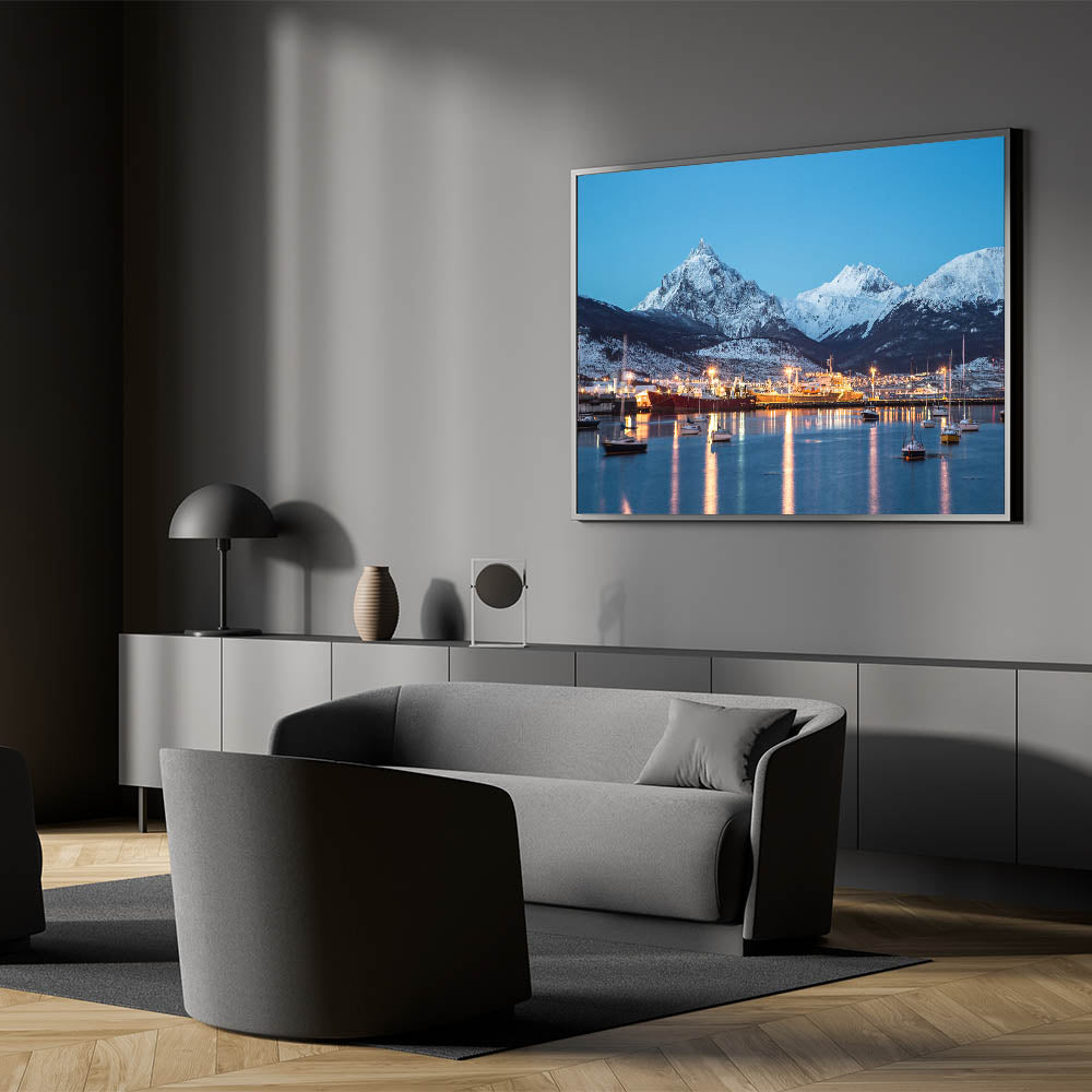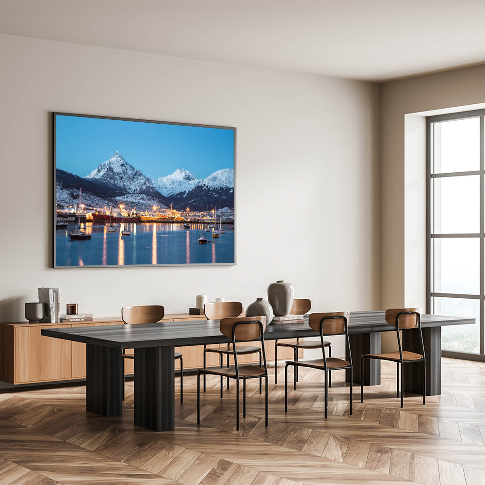Transform any room into a peaceful retreat with our "Argentine Harbor Art," where the tranquility of the harbor meets the majesty of the mountains.