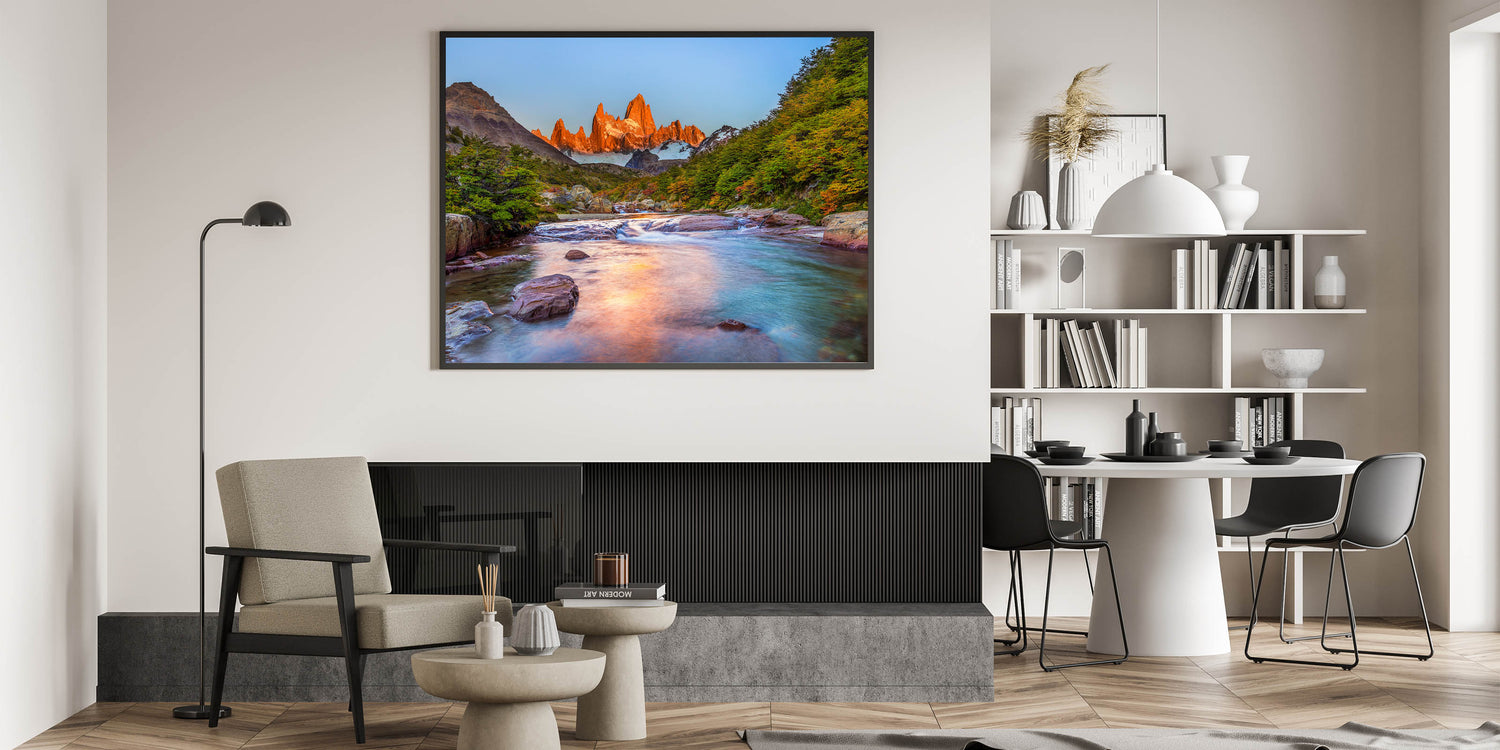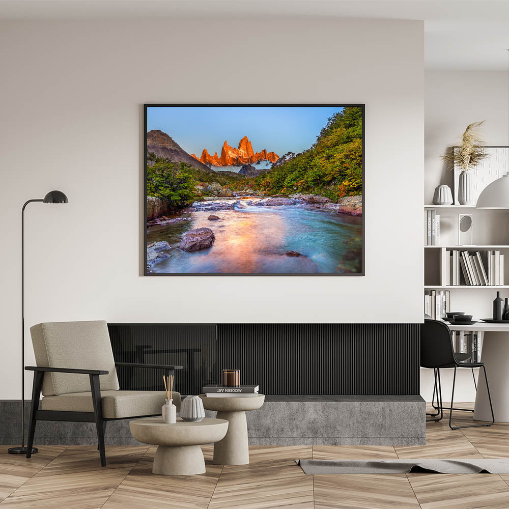 Discover the untouched beauty of Patagonia with our "Majestic Mountain Sunrise" artwork. This exquisite piece captures the serene and vibrant hues of dawn as it illuminates the iconic peaks of the Patagonian mountains, accompanied by the tranquil flow of a forest stream. A true masterpiece that brings nature's finest moments into your living space.
