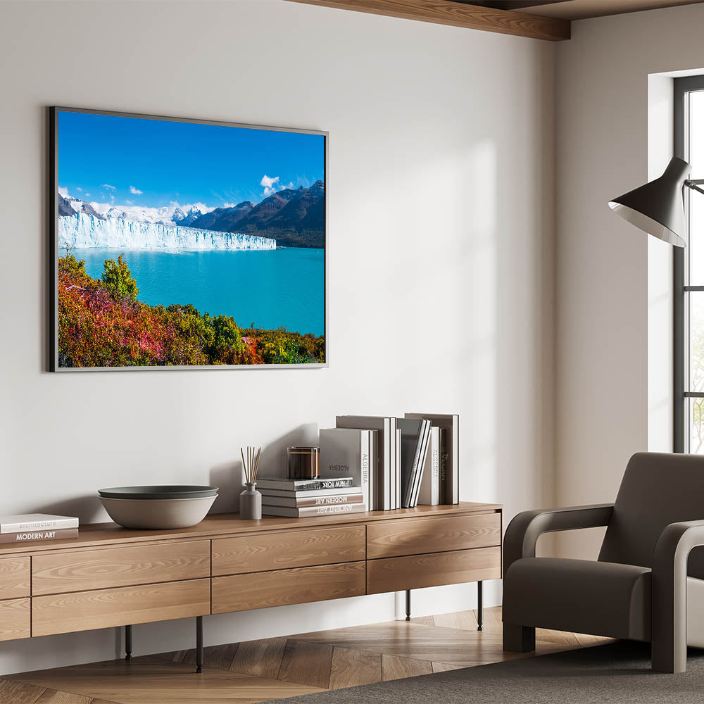 Embrace the serene grandeur of Patagonia with our "Pristine Ice Landscape" artwork, showcasing the majestic glacier as it meets the vibrant turquoise waters. This print captures the raw, untouched beauty of one of the world's most spectacular natural wonders, set against a backdrop of rugged mountains and vibrant autumn foliage.