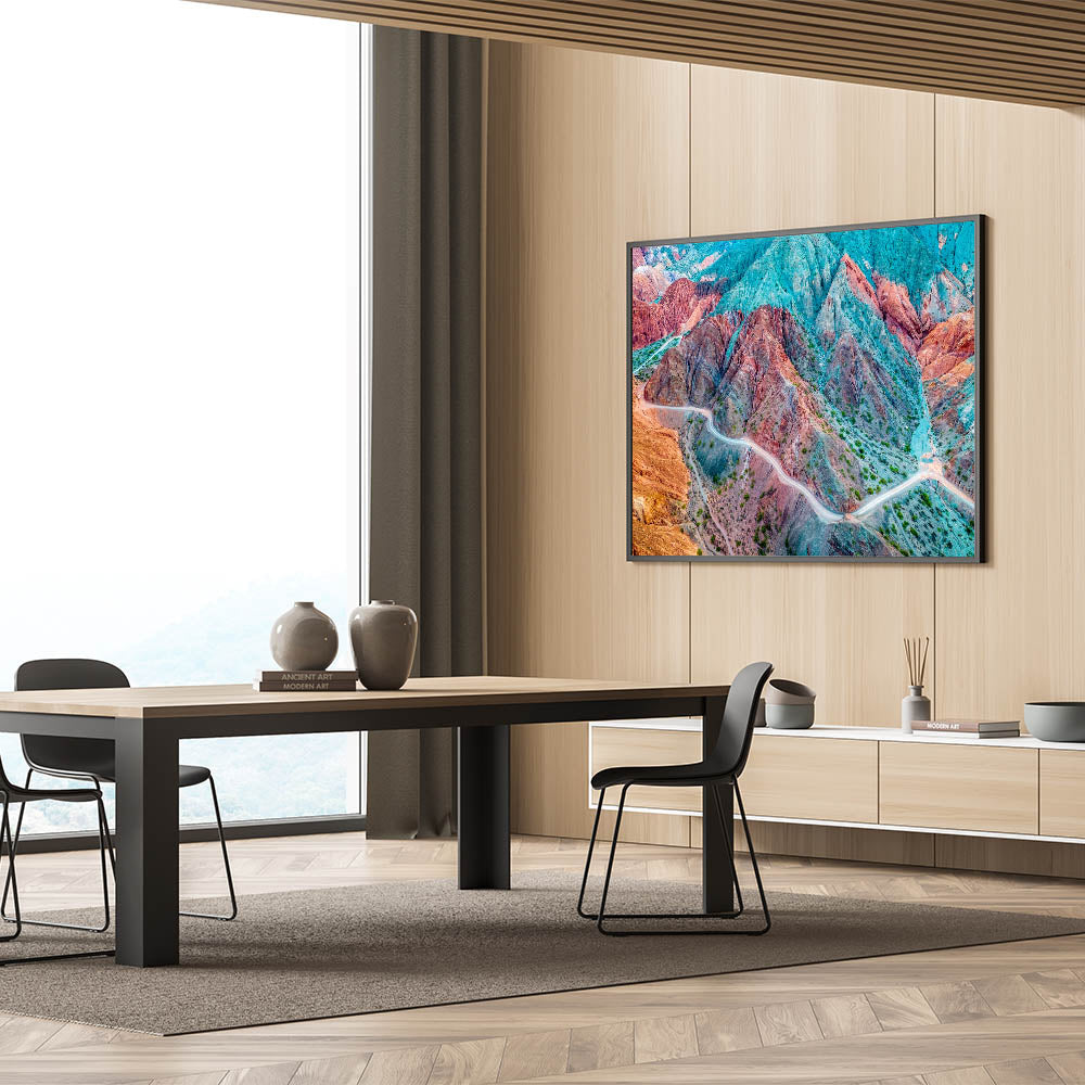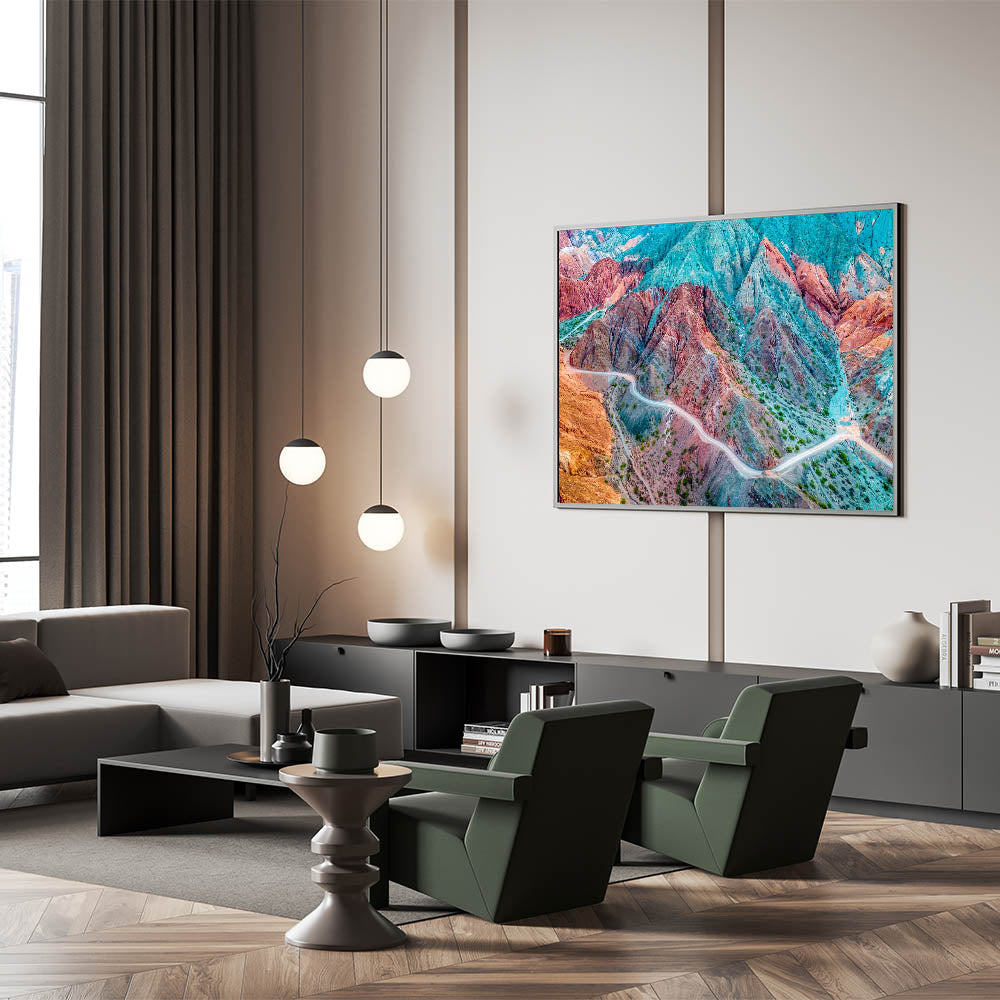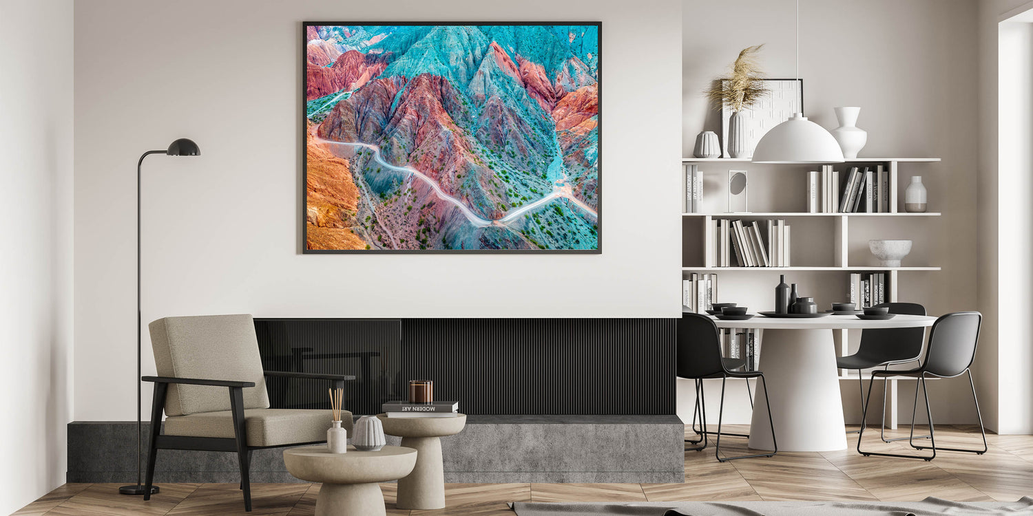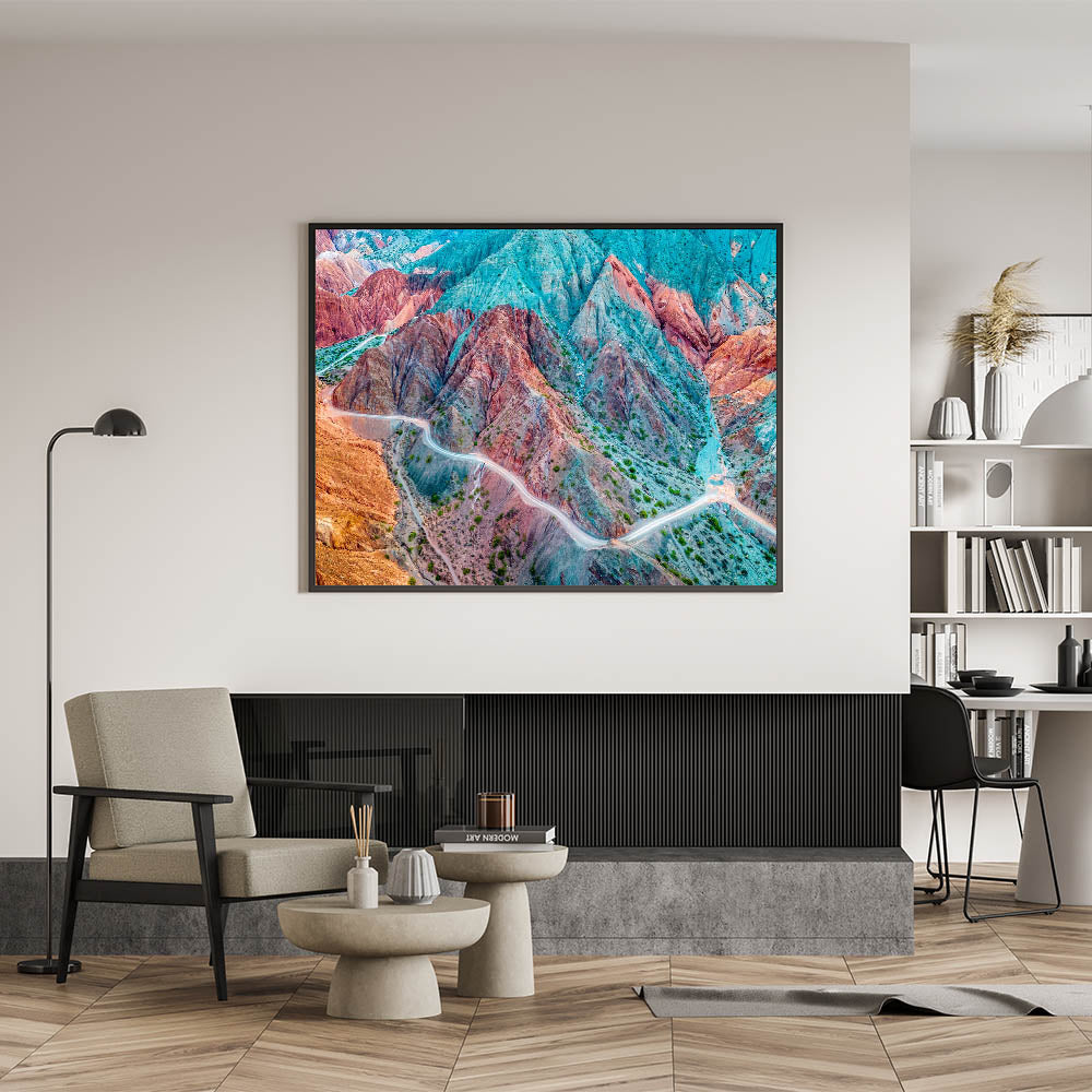 Explore the dramatic and colorful landscapes of Argentina with our "Vivid Argentine Mountains Art." This piece captures an aerial view of a winding road slicing through multicolored mountain ridges, offering a unique perspective on nature’s artistic palette.