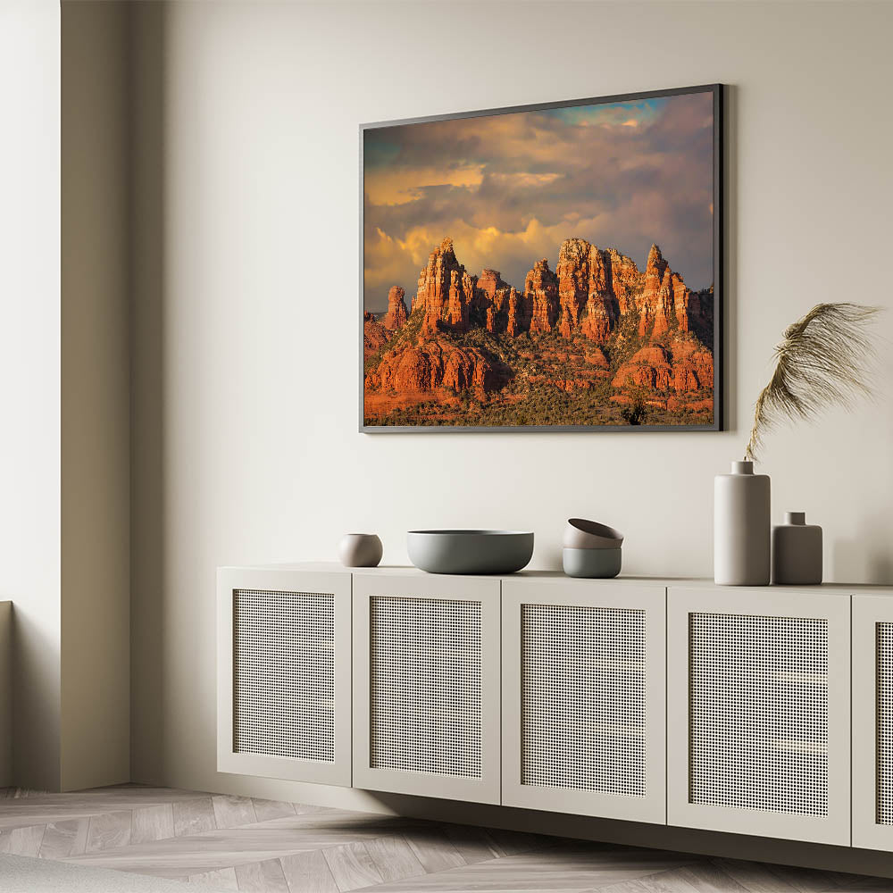 This breathtaking Sedona landscape print captures the rugged beauty of Arizona's red rock canyons set against a dramatic, moody sky. The rich textures and warm colors of the rock formations are highlighted by the glowing sunlight, creating a striking contrast with the soft, cloudy background. Perfect for lovers of the desert and natural beauty, this artwork brings the essence of Sedona’s unique landscapes into your home. Available in high-quality formats including stretched canvas, framed canvas, and acrylic glass, this piece will add warmth and a sense of adventure to any space.