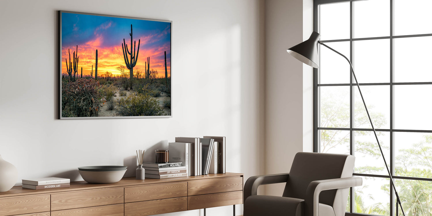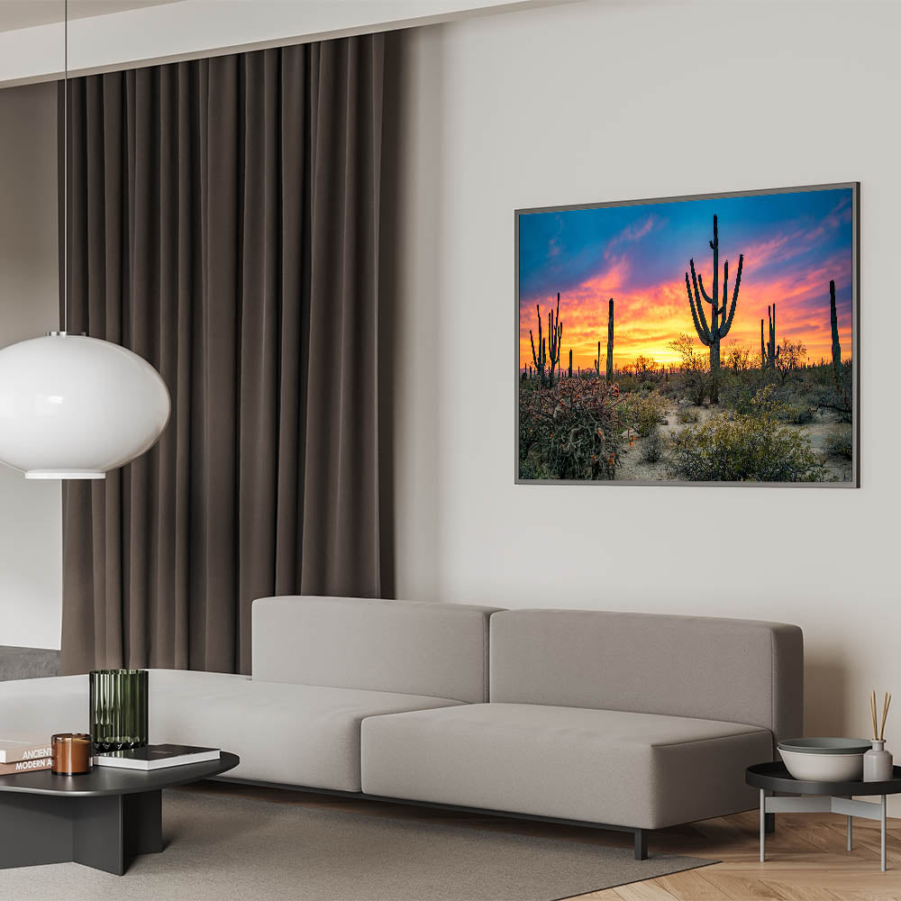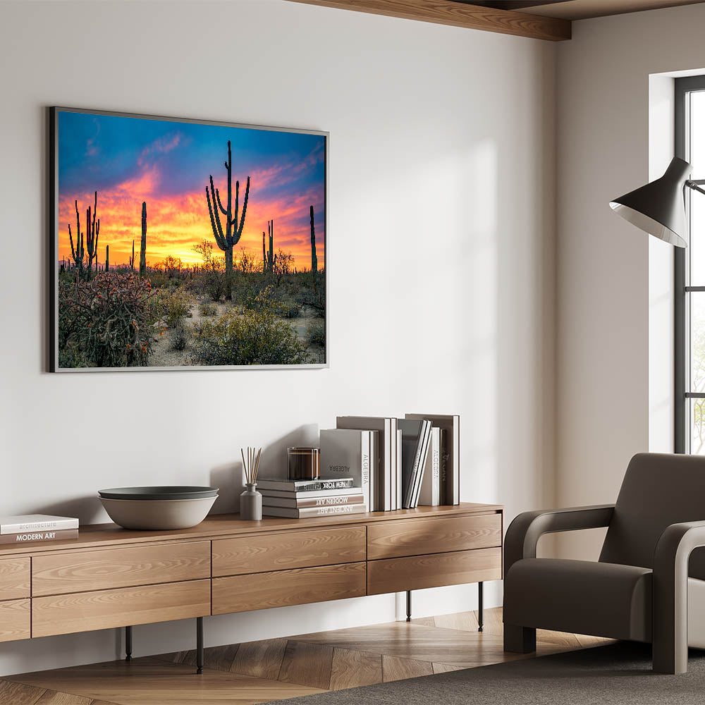 Transform your living space with this breathtaking Arizona desert landscape art, capturing the vivid colors of a stunning desert sunset. This piece showcases the towering saguaro cacti, casting dramatic shadows against the vibrant evening sky, embodying the serene beauty of the Sonoran Desert.