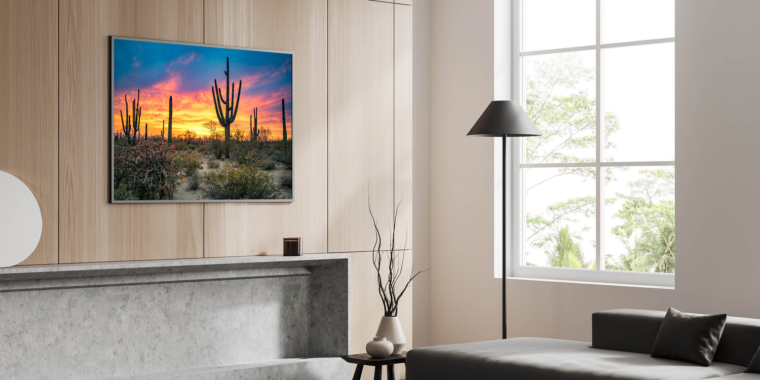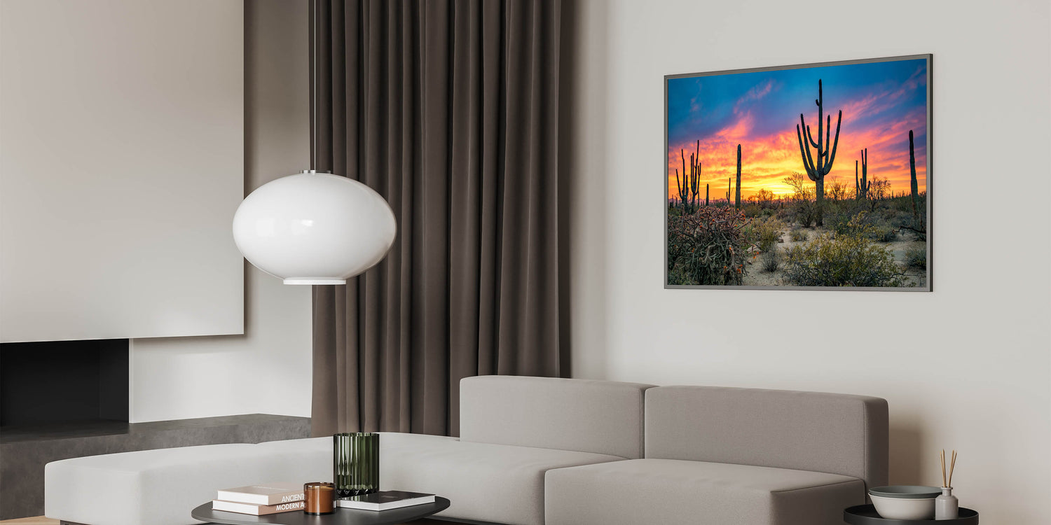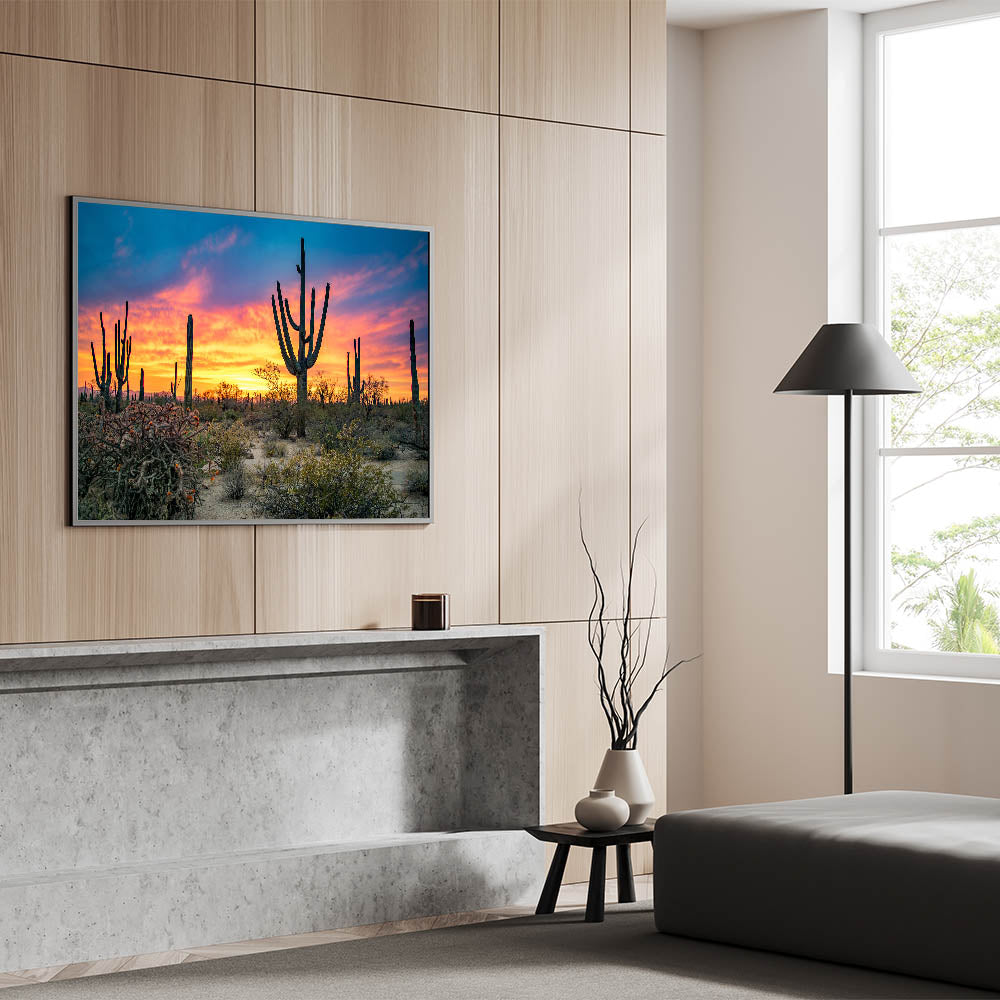 Transform your living space with this breathtaking Arizona desert landscape art, capturing the vivid colors of a stunning desert sunset. This piece showcases the towering saguaro cacti, casting dramatic shadows against the vibrant evening sky, embodying the serene beauty of the Sonoran Desert.