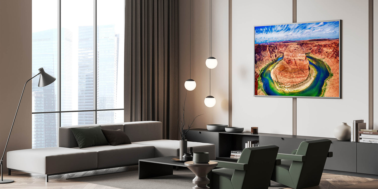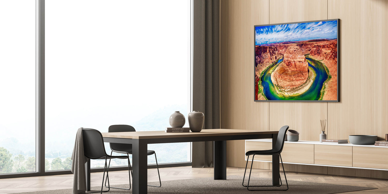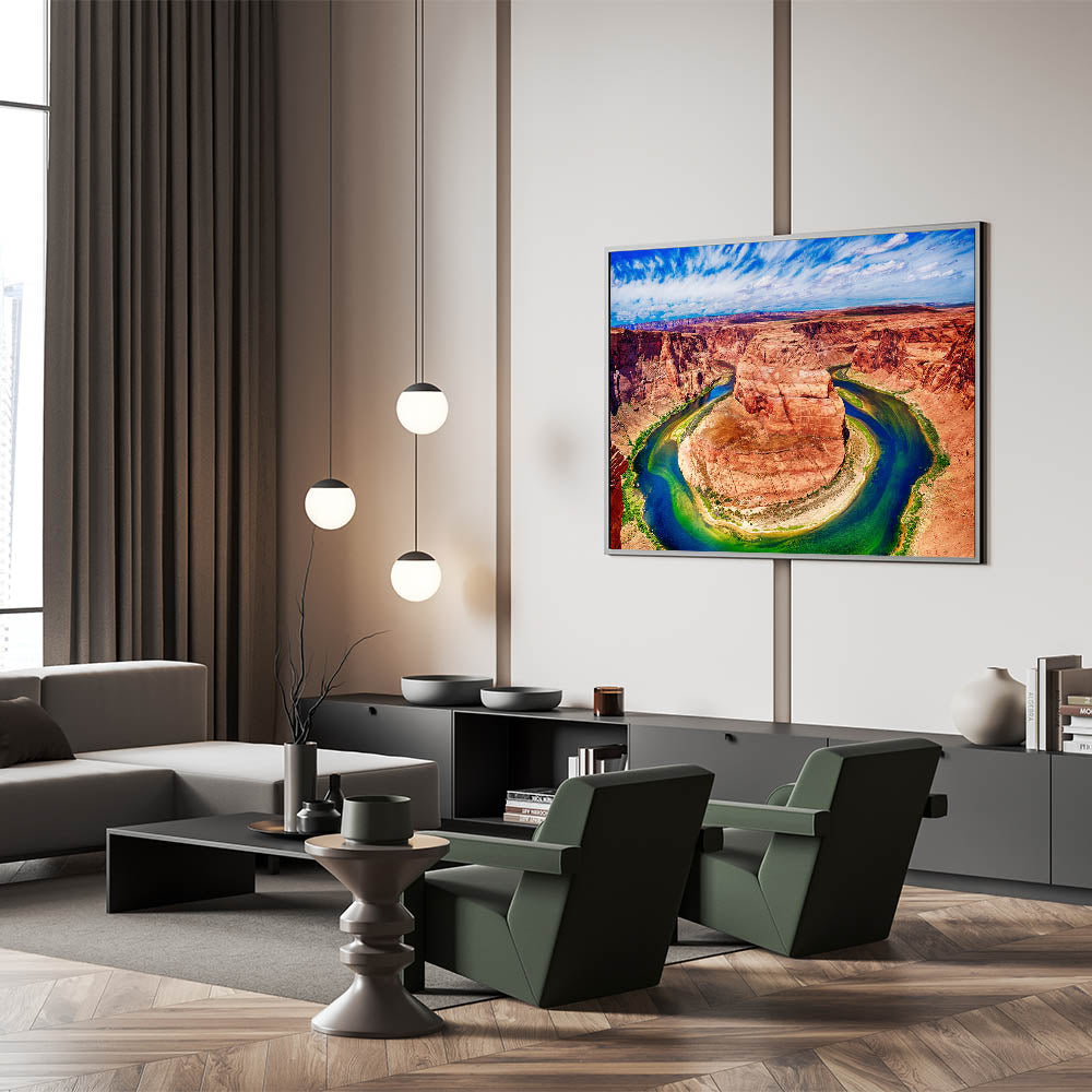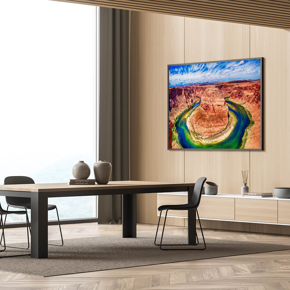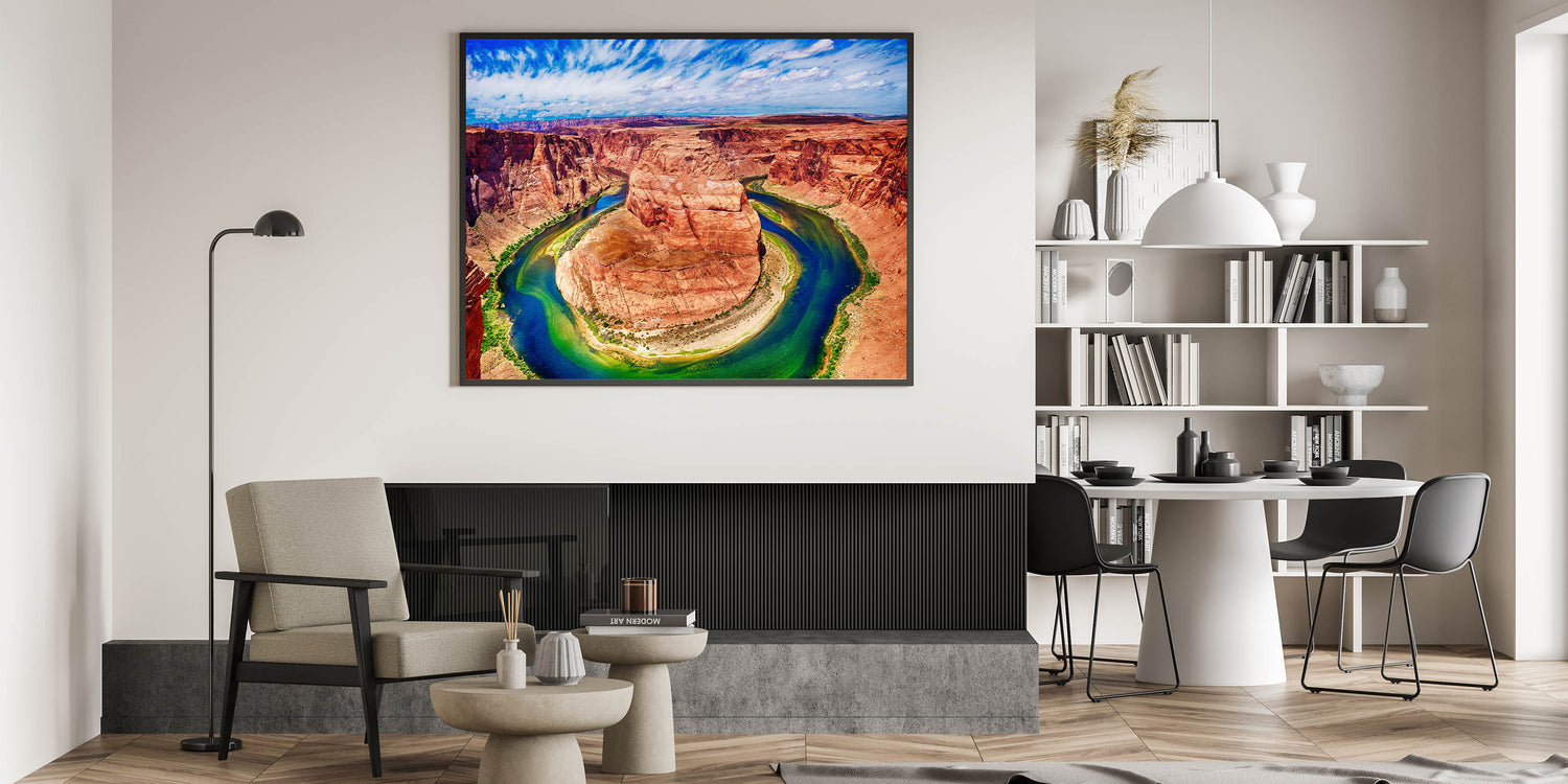 Experience the beauty of the Southwest with this vibrant Arizona landscape painting featuring Horseshoe Bend. The brilliant colors and breathtaking details of this iconic scene will make a bold statement in any space. The scenic Horseshoe Bend print captures the natural beauty of Arizona’s red rock formations and the stunning curve of the Colorado River. Available in a variety of formats, including Stretched Canvas, Framed Canvas, Acrylic Glass, and Framed Prints, this high-quality art print is perfect for nature lovers and those looking to add a piece of the Southwest to their home decor.