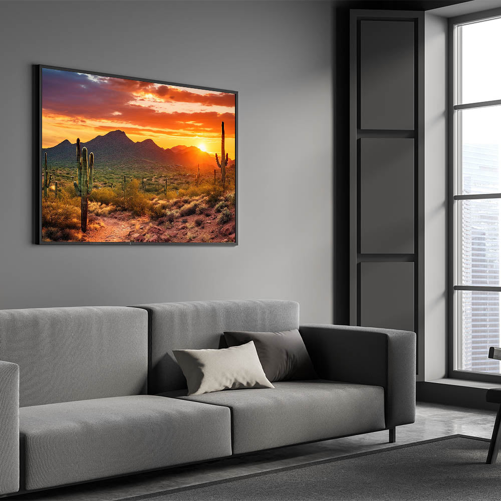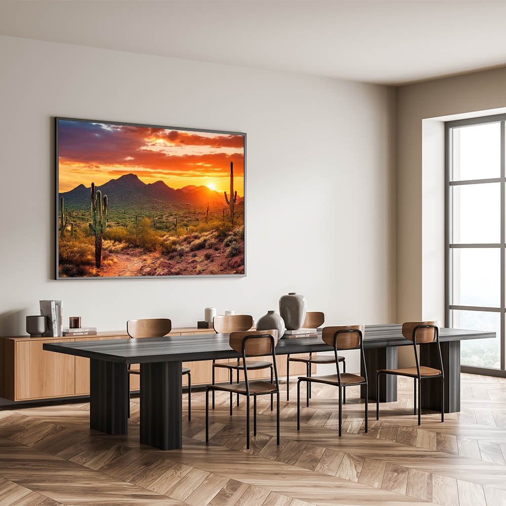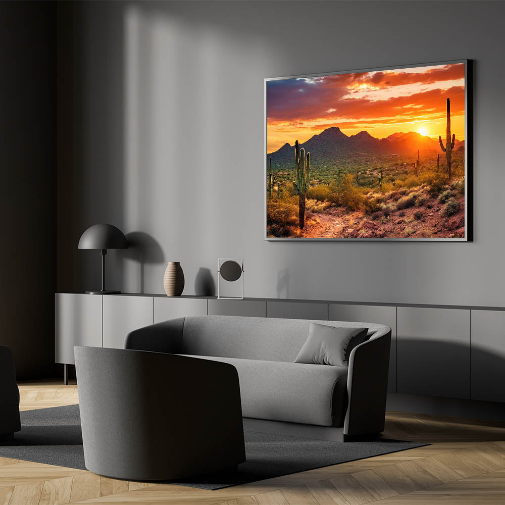This captivating wall art showcases the vibrant beauty of an Arizona desert sunset, with the majestic saguaro cacti standing tall amidst the lush Sonoran landscape. The setting sun casts a golden glow over the desert mountains, creating a serene and breathtaking scene that embodies the warmth and natural wonder of the Southwest.