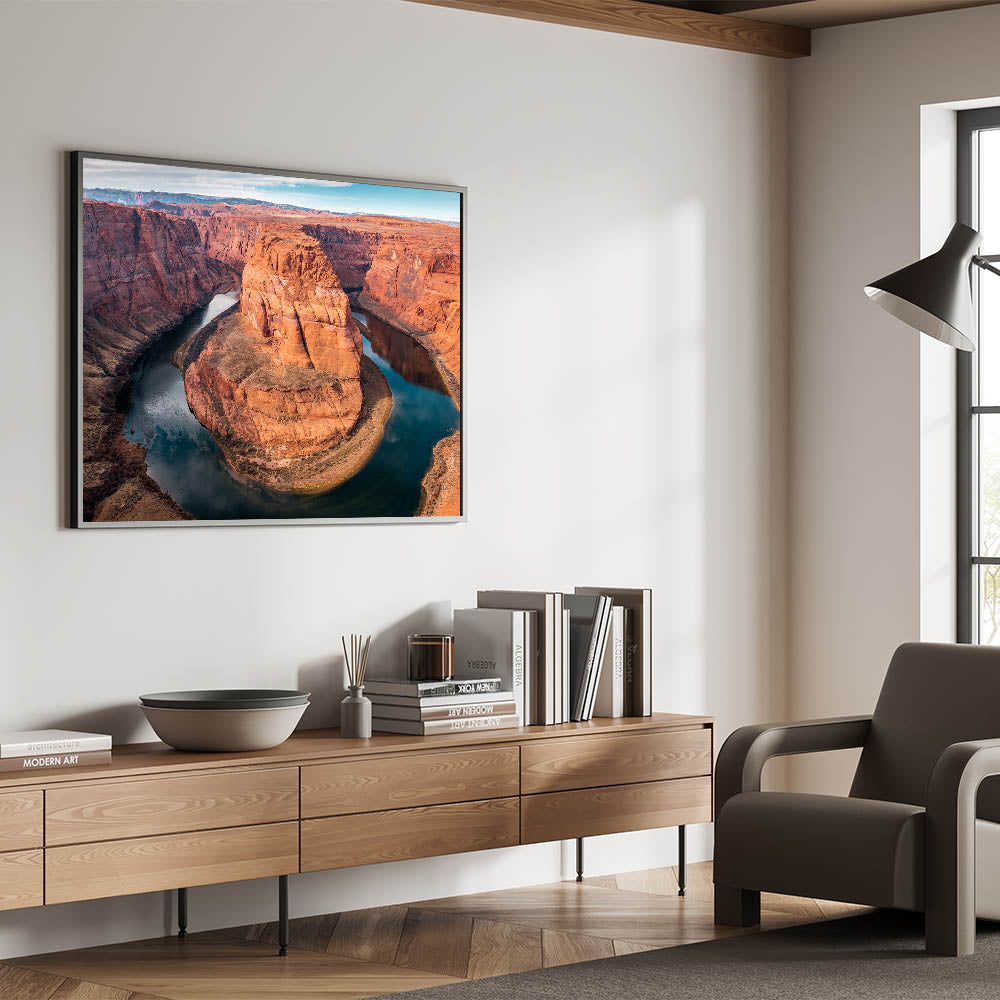Capture the grandeur of Glen Canyon with this breathtaking Arizona landscape print. Featuring the majestic canyon walls and the serene curves of the Colorado River, this piece of Southwest art offers an intimate glimpse into the natural beauty of the Arizona desert. The warm terracotta tones of the canyon contrasted against the deep blues of the river create a visually captivating scene that brings the outdoors into your living space.