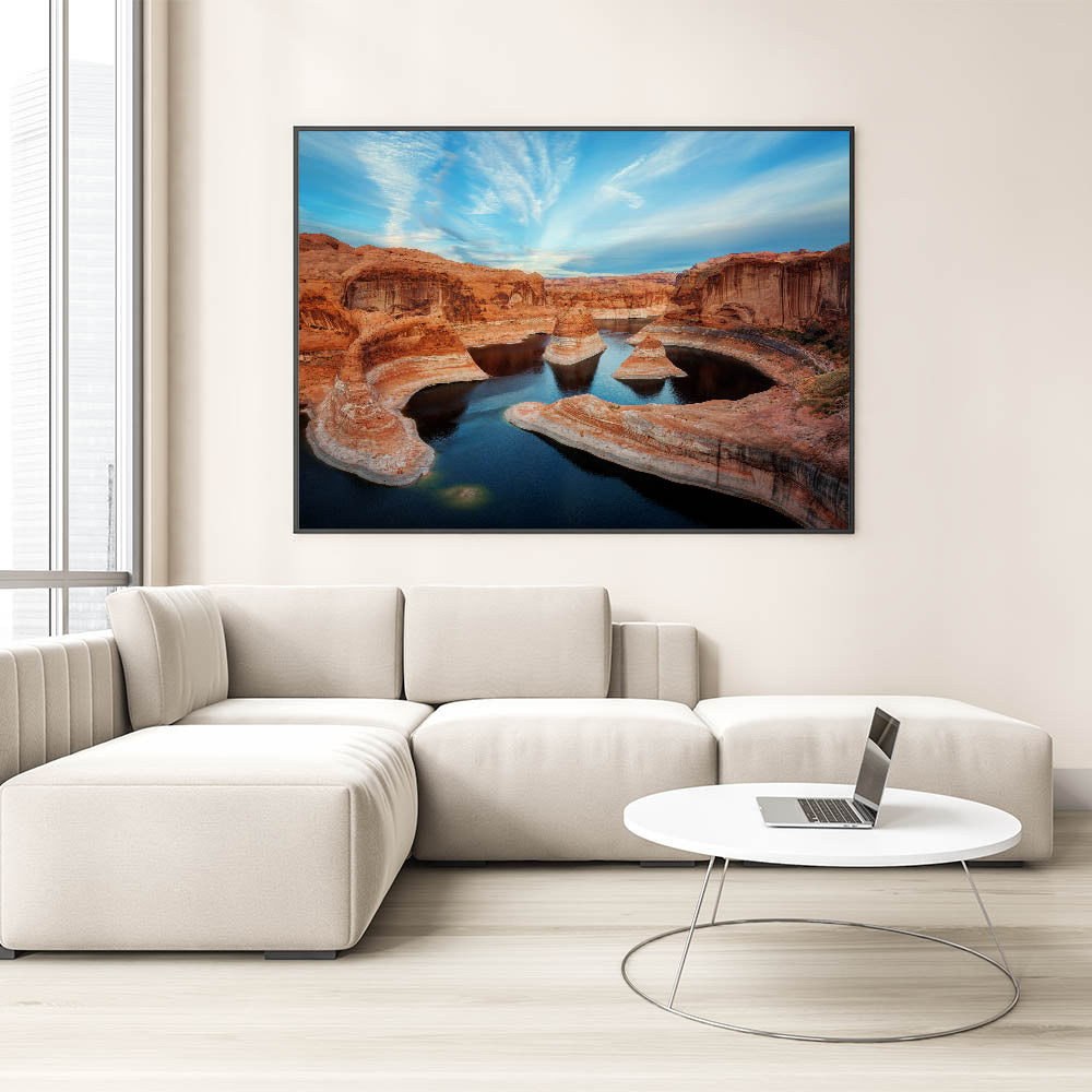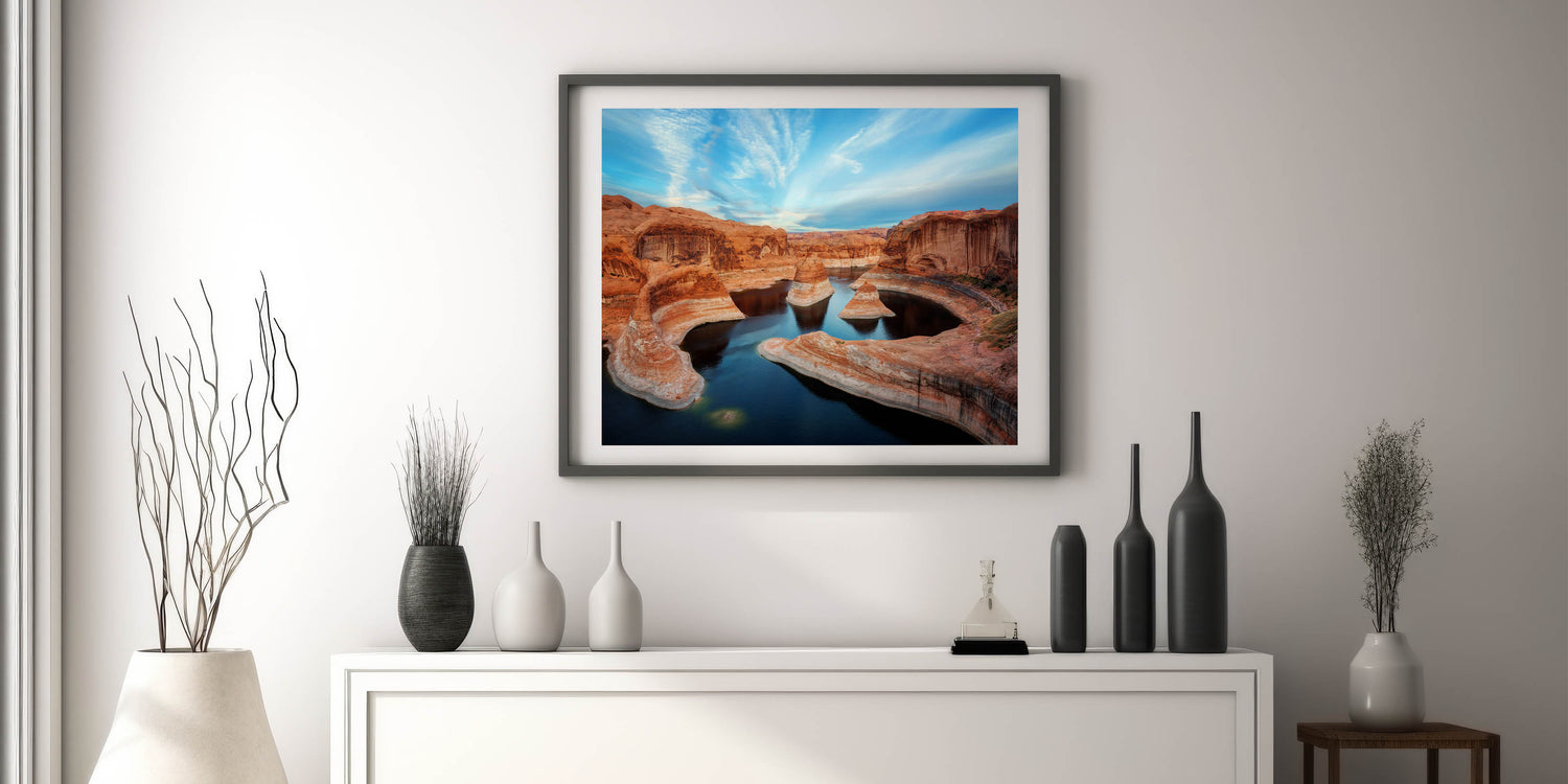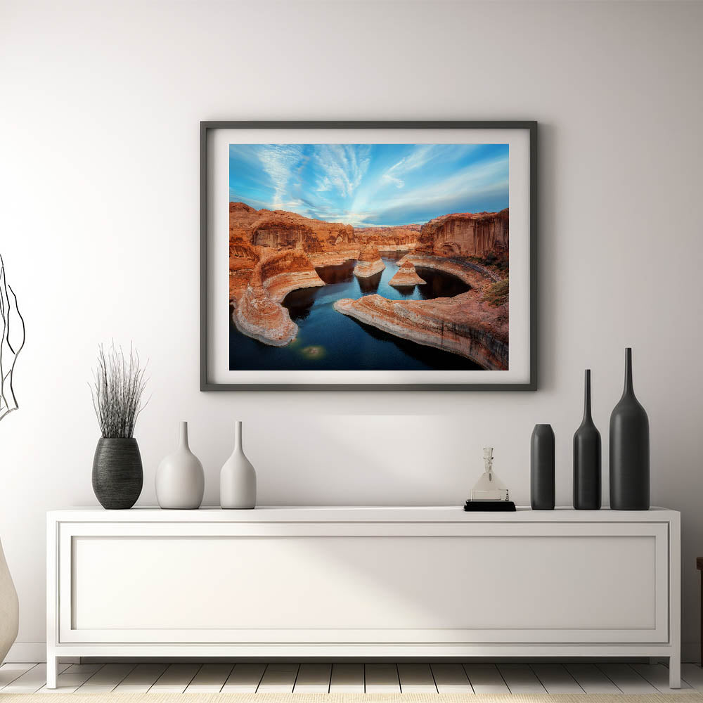 Enhance your space with this serene Glen Canyon wall art, featuring the striking beauty of the Arizona desert landscape. The smooth, flowing curves of the canyon contrasted against the deep blue waters create a peaceful and mesmerizing scene. This artwork captures the essence of the Southwest, showcasing nature’s elegance in a vibrant mix of rich earth tones and sky blues. Whether displayed in your living room, office, or bedroom, this Glen Canyon photography will bring a sense of calm and natural beauty to any space.