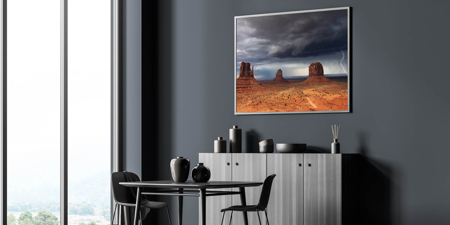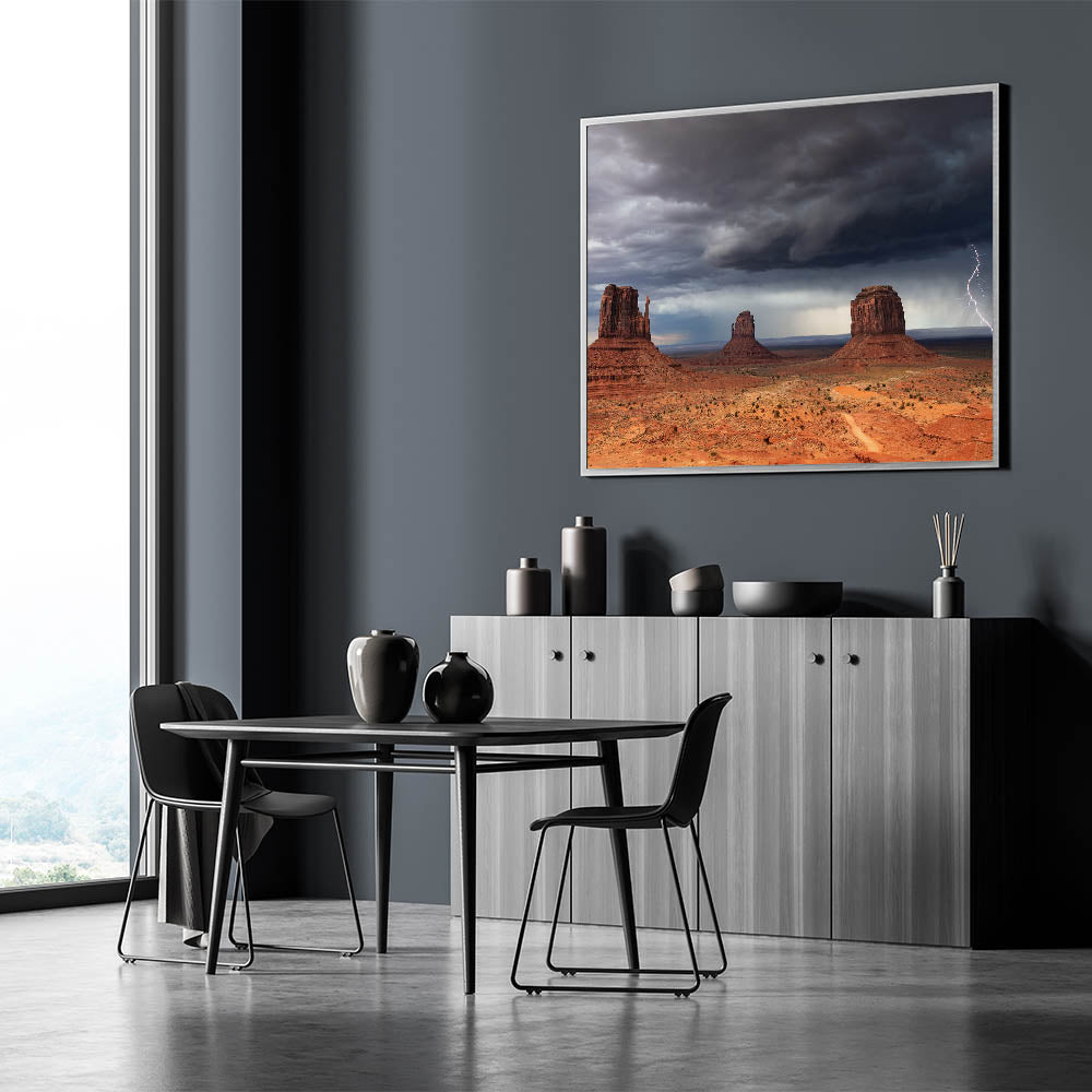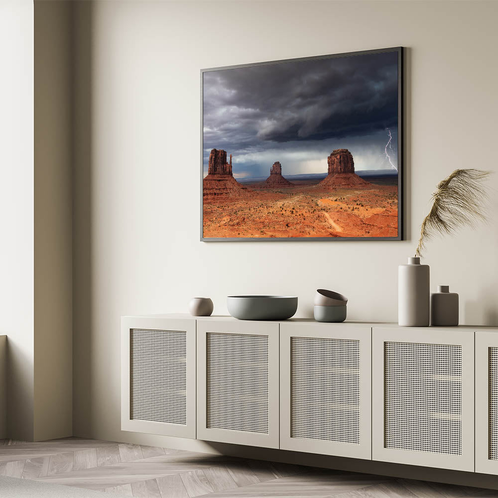 Experience the raw power of nature with this dramatic wall art featuring a thunderstorm rolling over Monument Valley. The contrast between the dark storm clouds and the vibrant red rock formations creates a striking and powerful visual, perfect for adding energy and intensity to your space. This Arizona desert landscape is ideal for those looking to make a bold statement in their home or office decor.