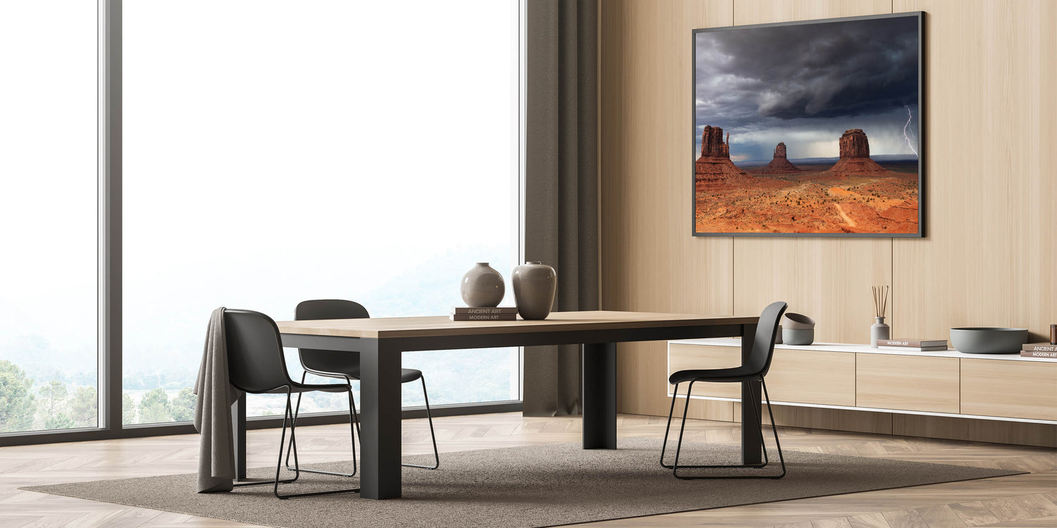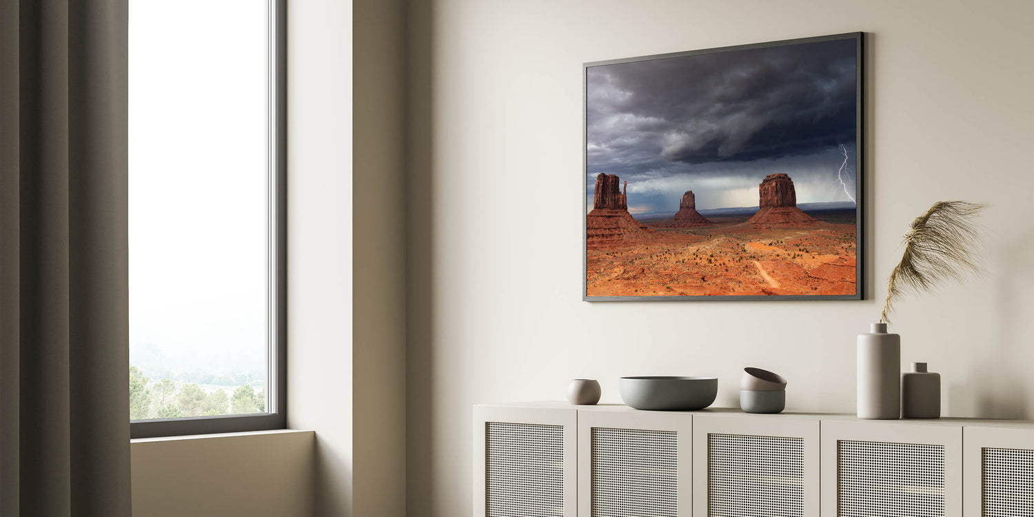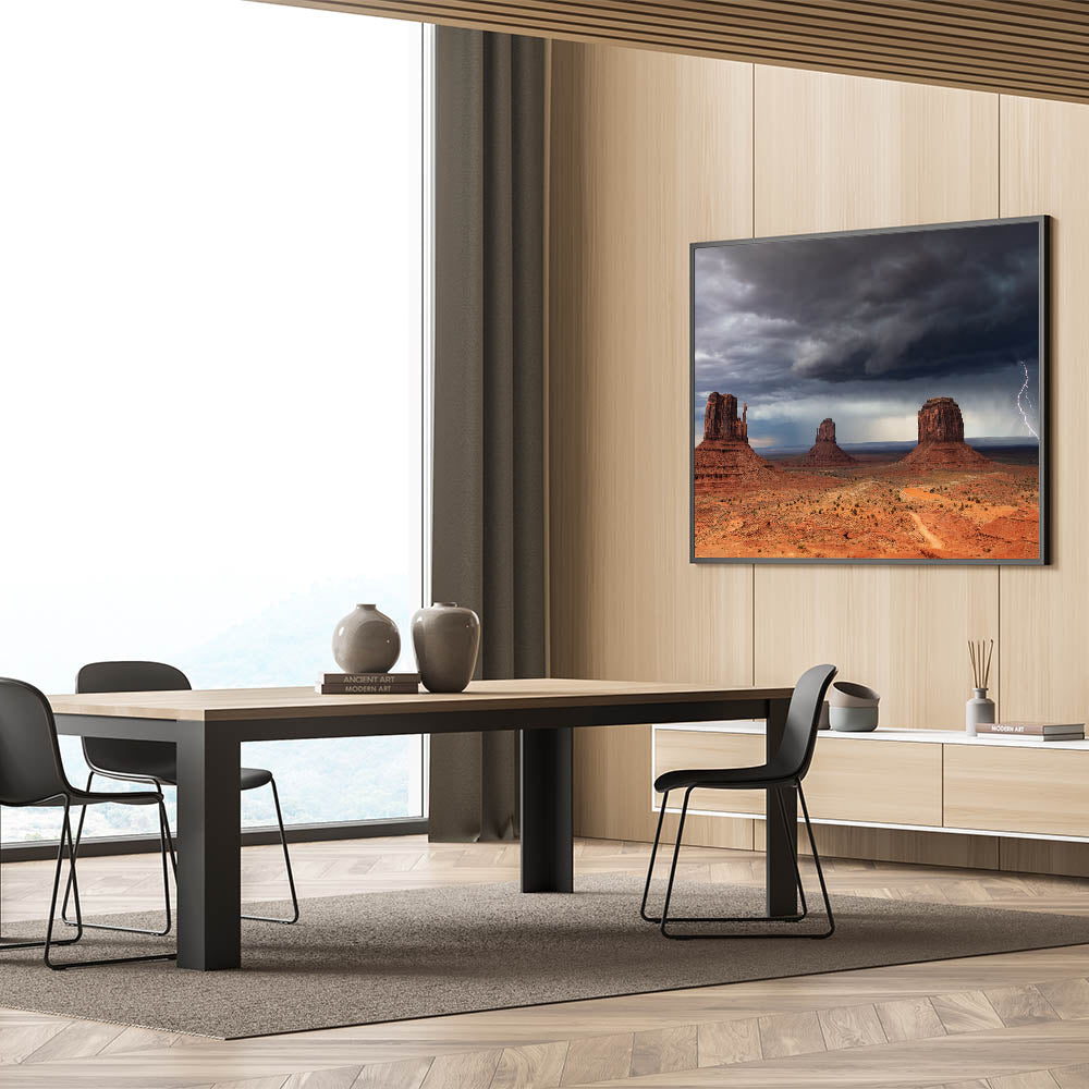 Experience the raw power of nature with this dramatic wall art featuring a thunderstorm rolling over Monument Valley. The contrast between the dark storm clouds and the vibrant red rock formations creates a striking and powerful visual, perfect for adding energy and intensity to your space. This Arizona desert landscape is ideal for those looking to make a bold statement in their home or office decor.