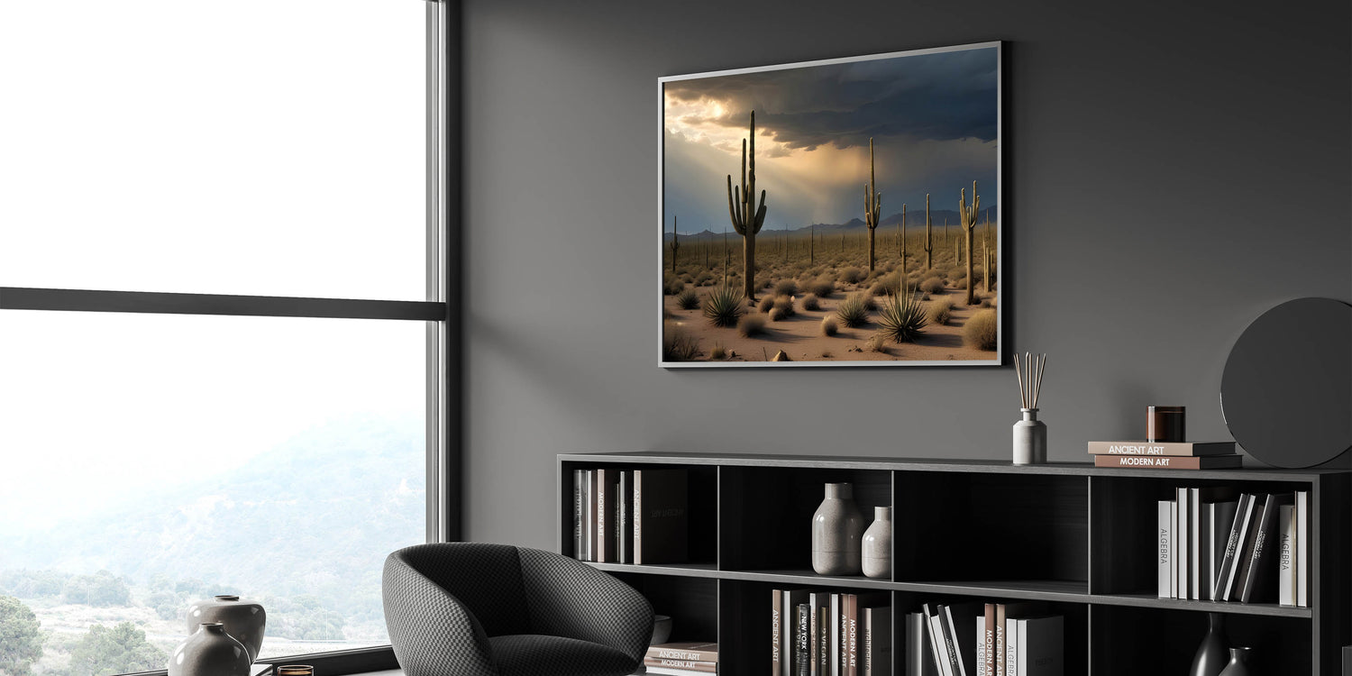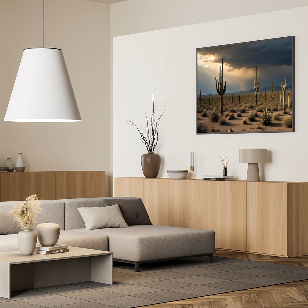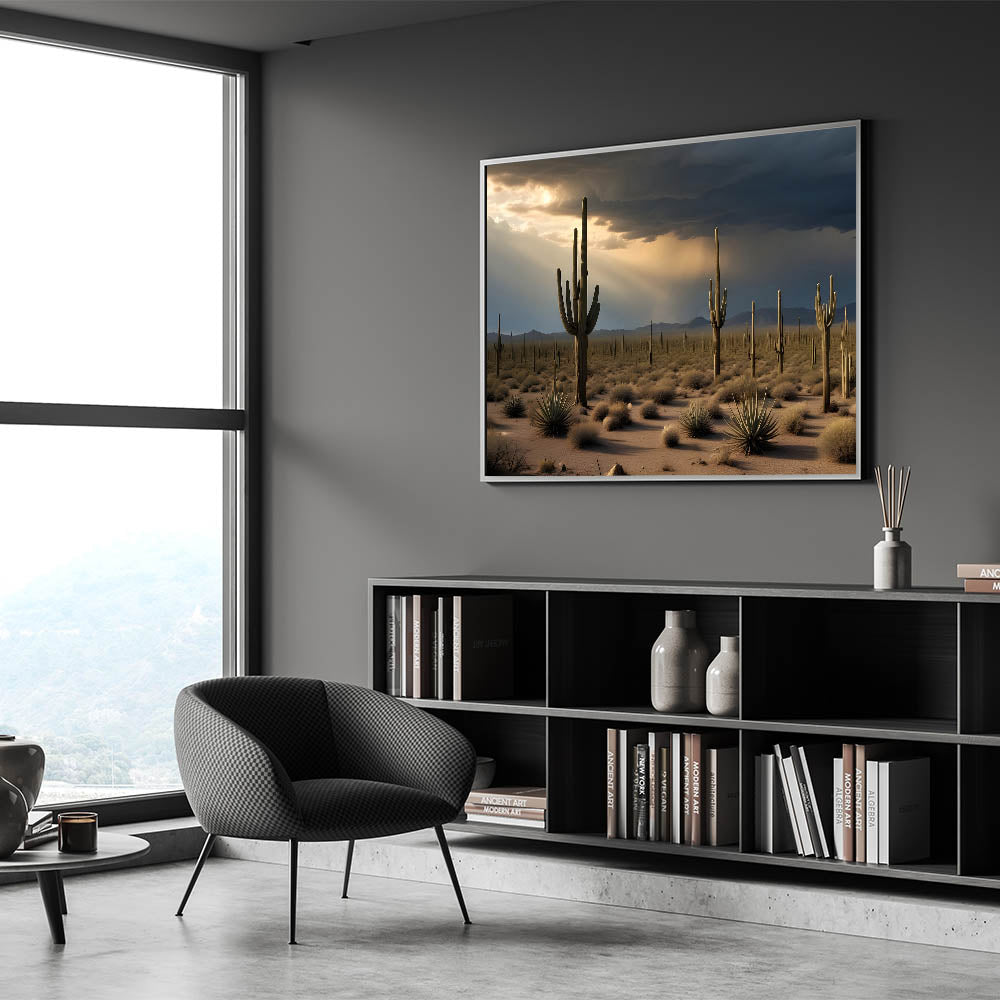 This wall art perfectly captures the tranquil beauty of the Sonoran Desert, with towering saguaro cacti standing tall against a moody, stormy sky. The subtle sunlight breaking through the clouds illuminates the landscape, creating a peaceful and serene atmosphere. This piece is ideal for anyone looking to bring the quiet beauty of the desert indoors.