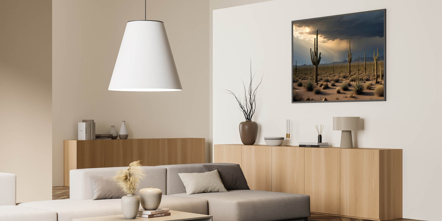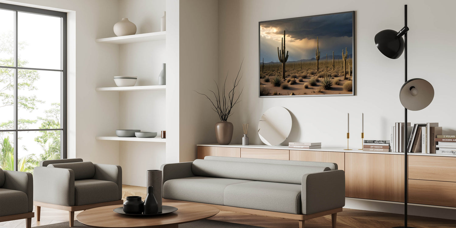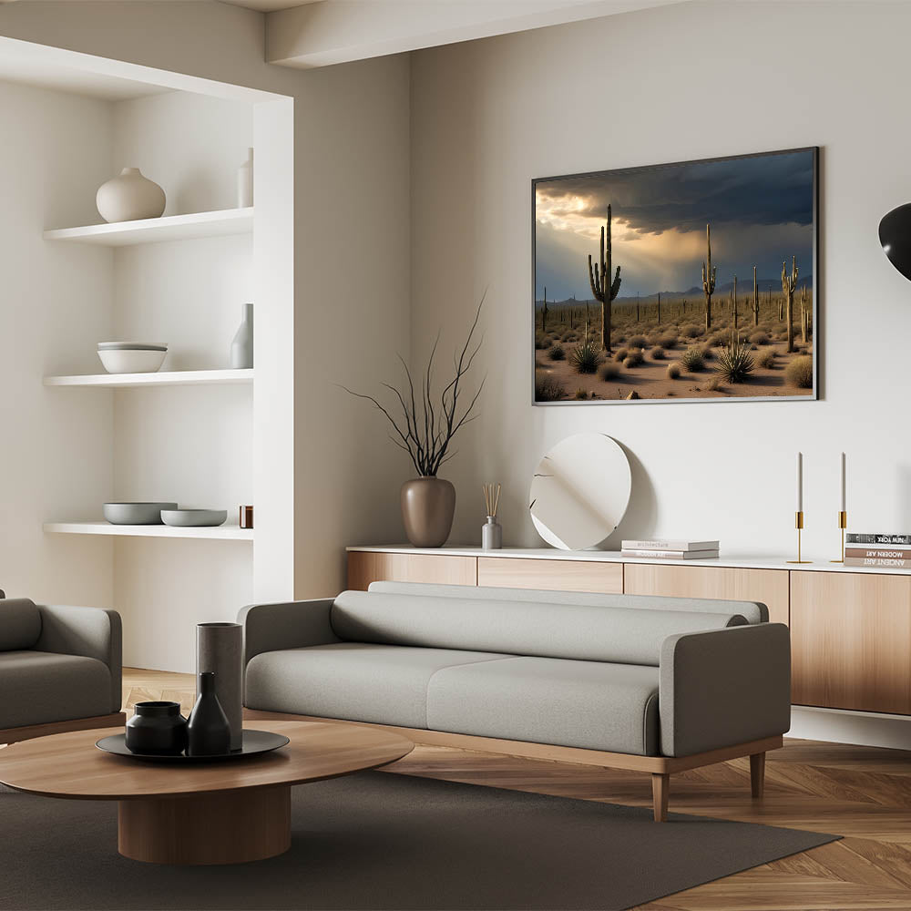 This wall art perfectly captures the tranquil beauty of the Sonoran Desert, with towering saguaro cacti standing tall against a moody, stormy sky. The subtle sunlight breaking through the clouds illuminates the landscape, creating a peaceful and serene atmosphere. This piece is ideal for anyone looking to bring the quiet beauty of the desert indoors.
