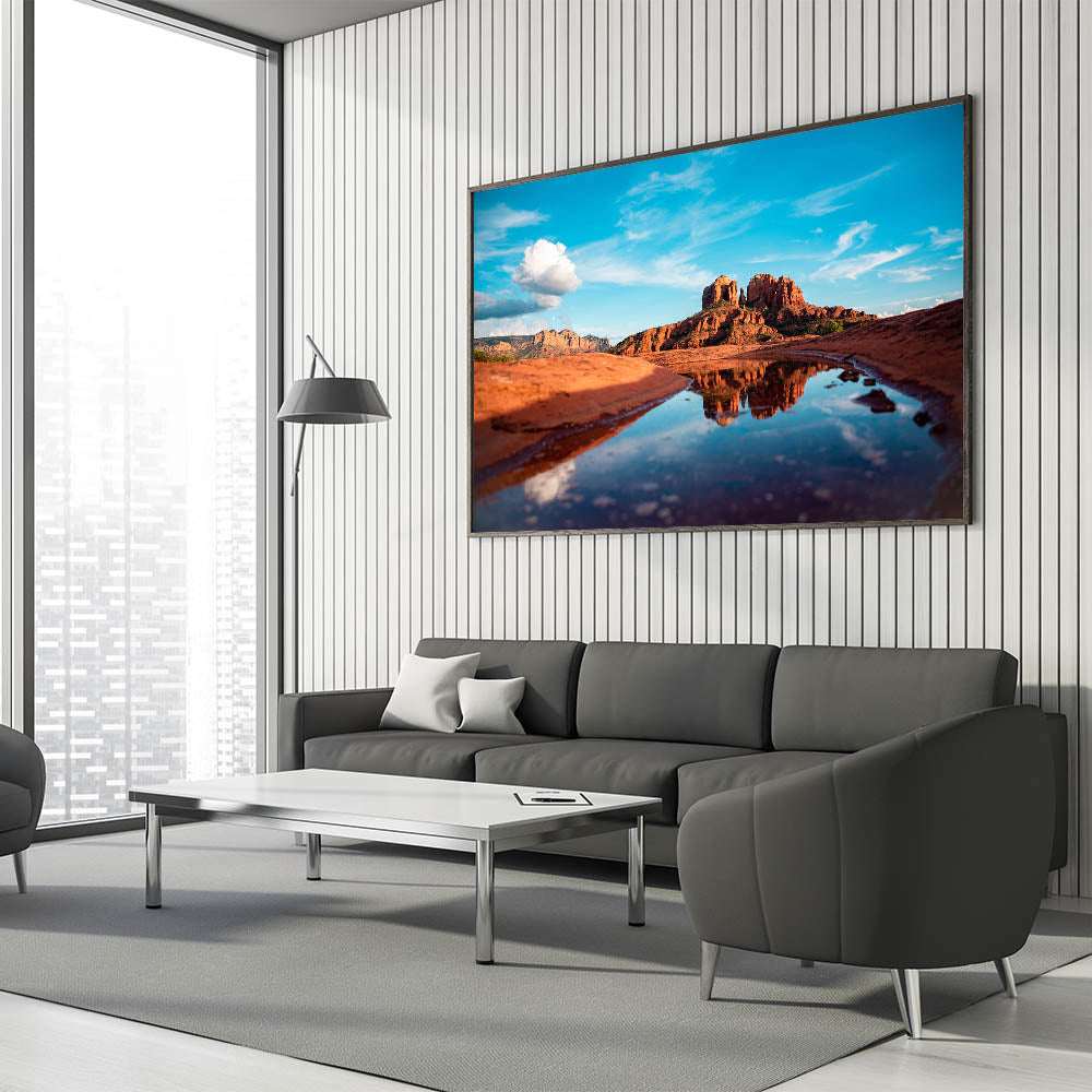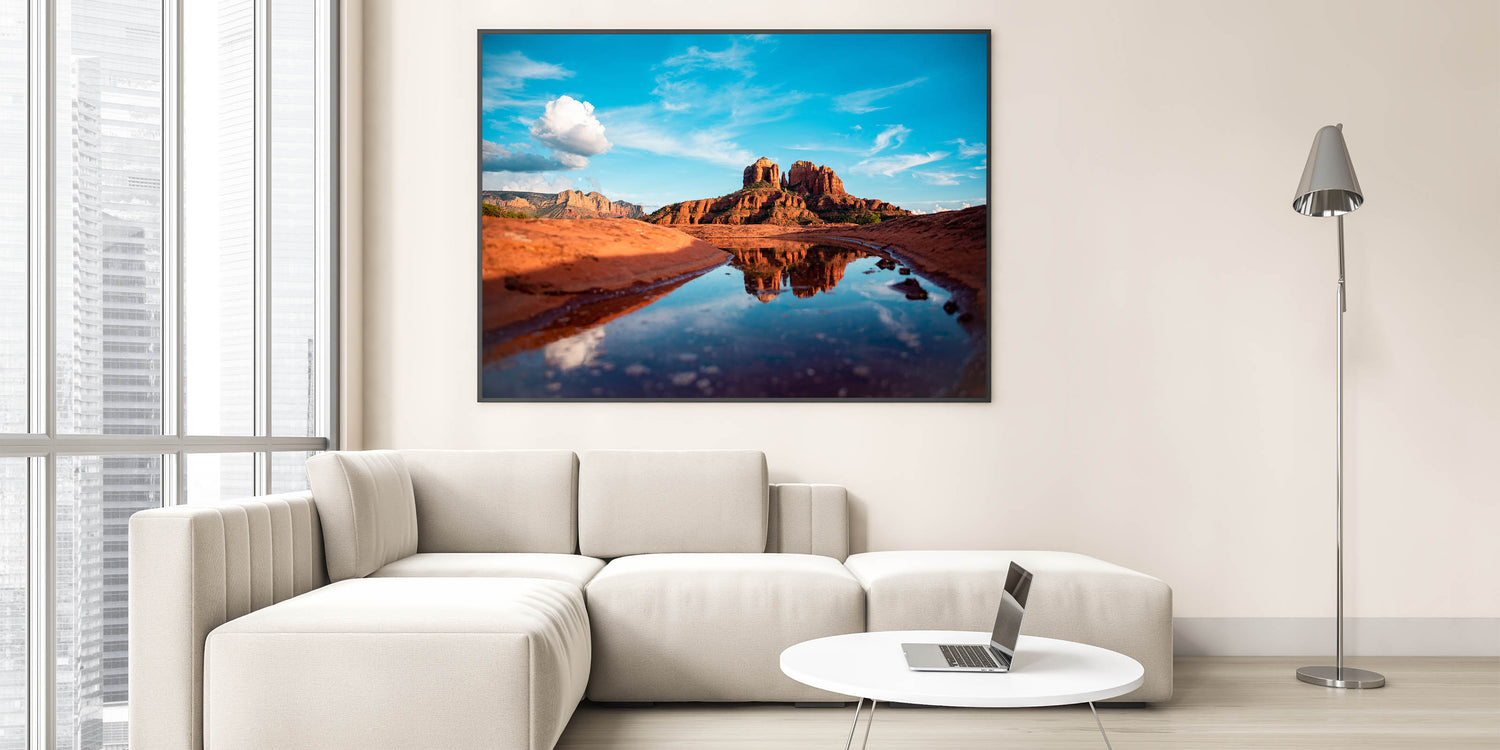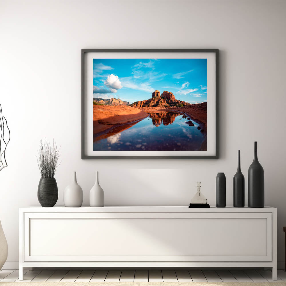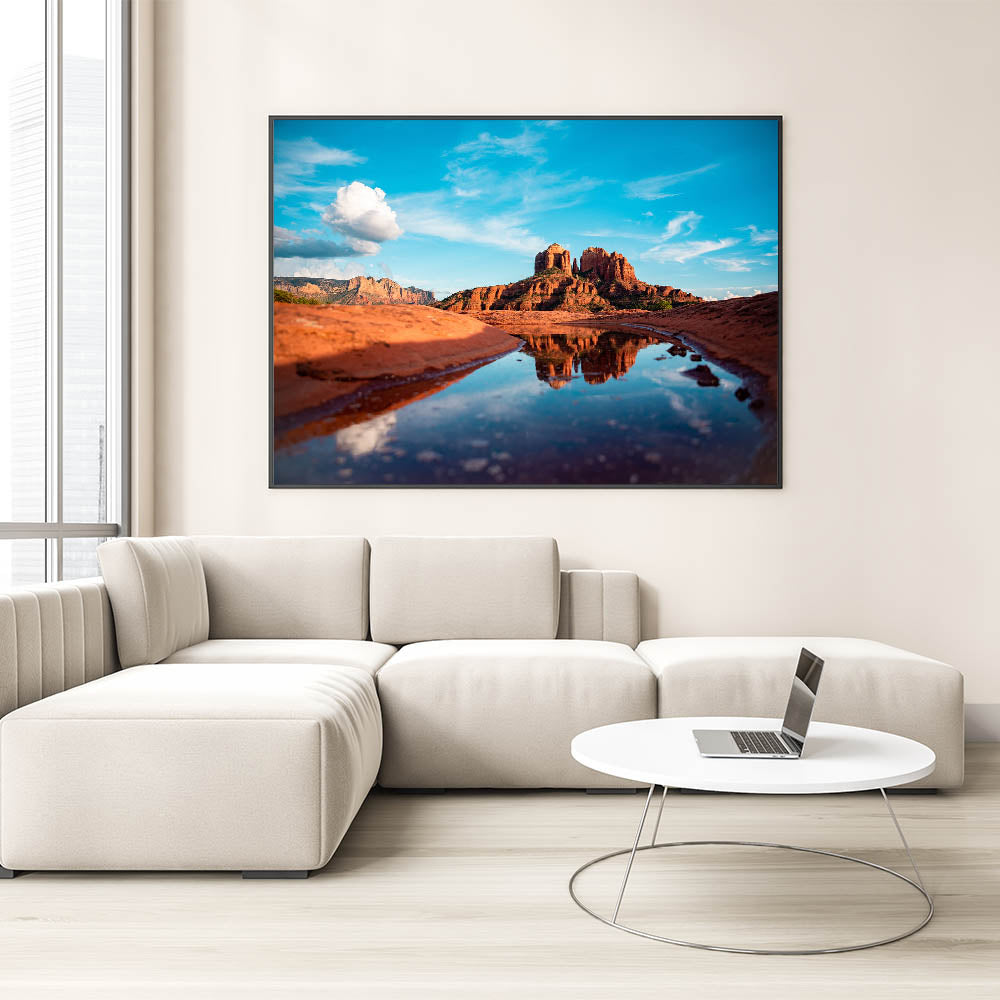 Immerse yourself in the breathtaking beauty of Sedona with this stunning wall art. Capturing the iconic red rock formations reflected in a tranquil pool of water, this piece showcases the essence of Sedona’s majestic landscape. The vibrant colors of the Arizona desert, paired with the clear blue sky, create a mesmerizing scene perfect for adding a serene touch to any room. Available in various high-quality formats, including framed canvas, acrylic glass, and more, this Sedona landscape painting brings the beauty of nature right into your home.