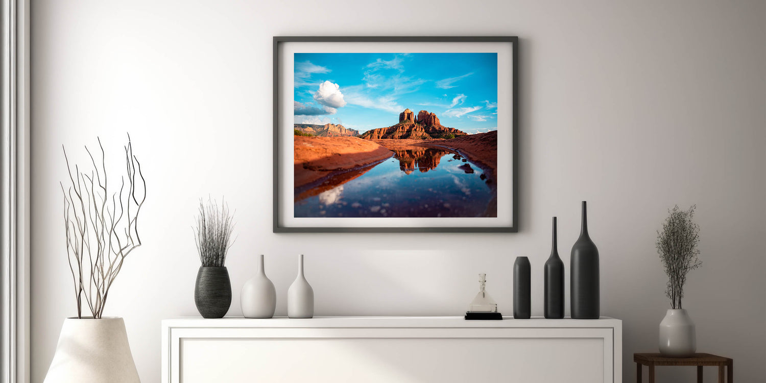 - High-quality Sedona art prints available in stretched canvas, framed prints, and acrylic glass